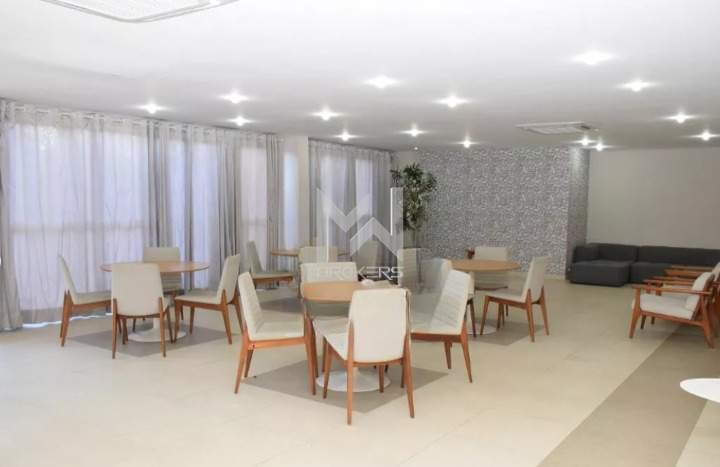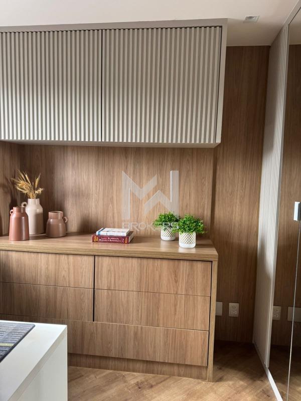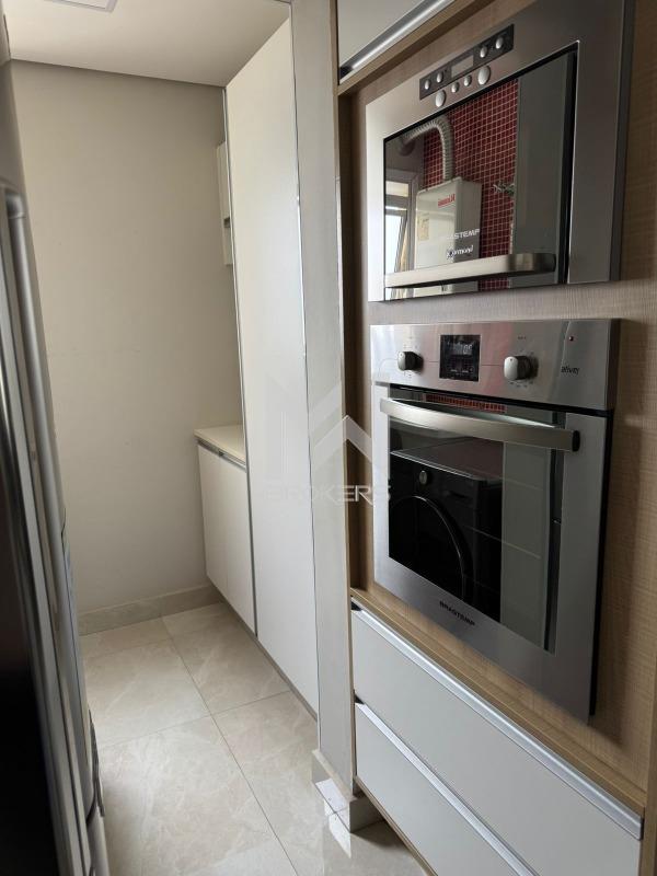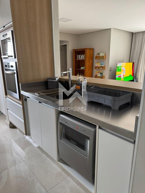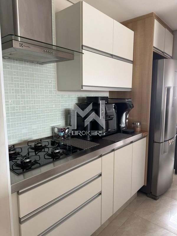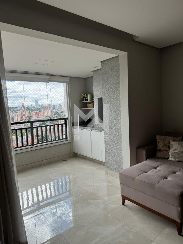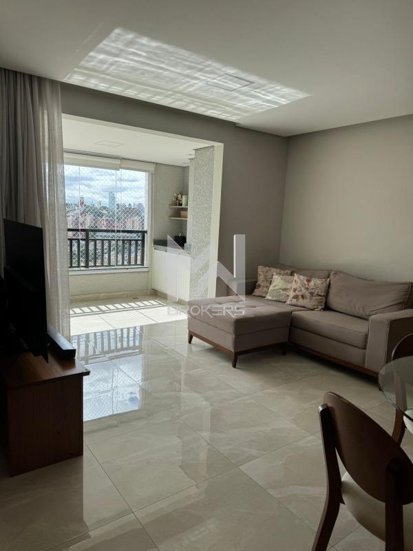 A sala para dois ambientes integra-se de forma funcional à cozinha americana com armários, criando um espaço moderno e ideal para o dia a dia. O terraço com churrasqueira e fechamento em vidro amplia a área social do apartamento, permitindo aproveitar a vista e a ventilação natural com mais conforto.
