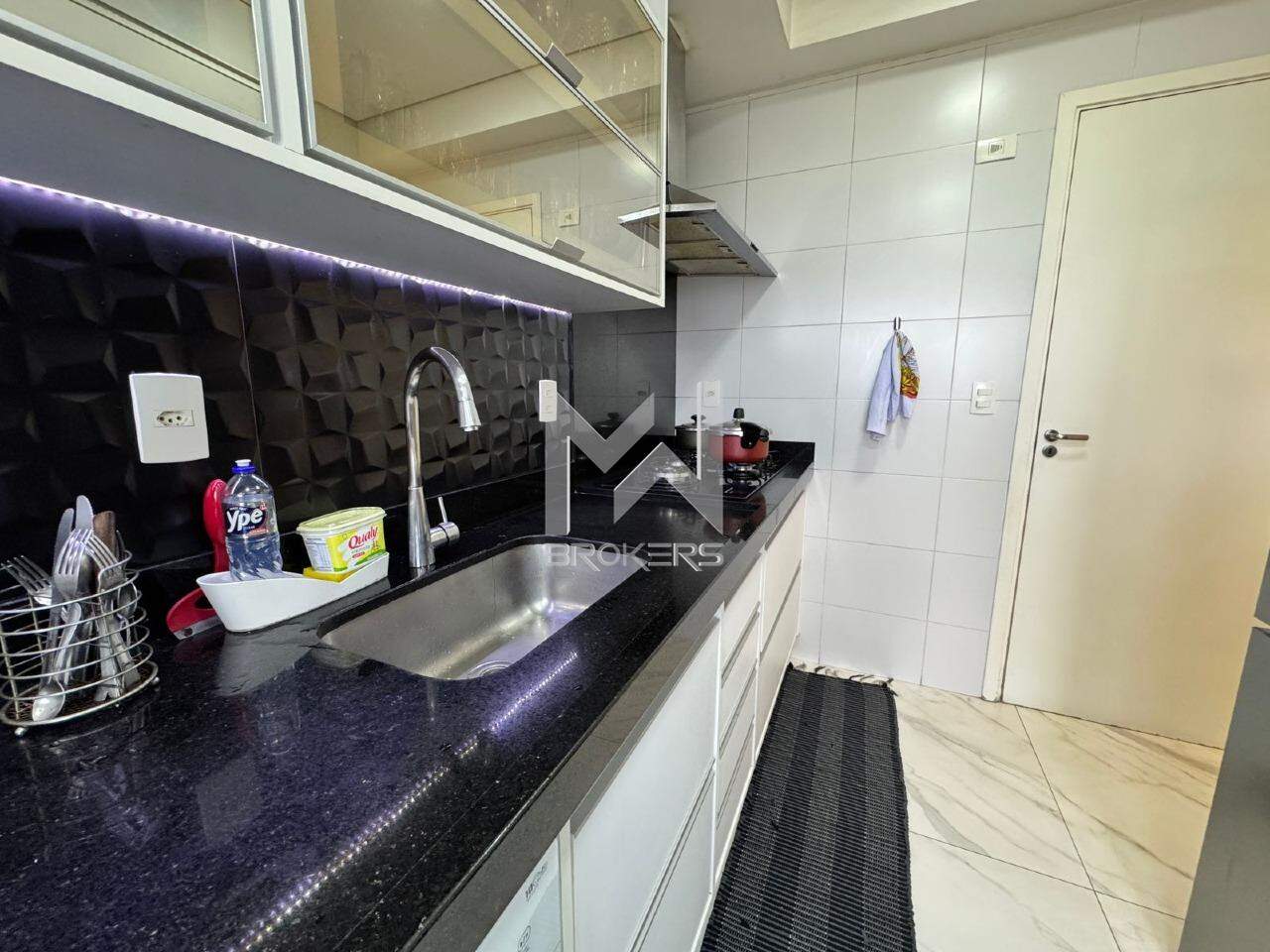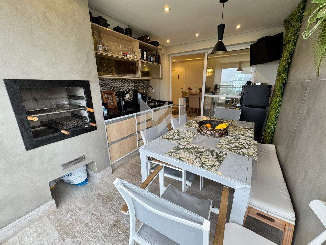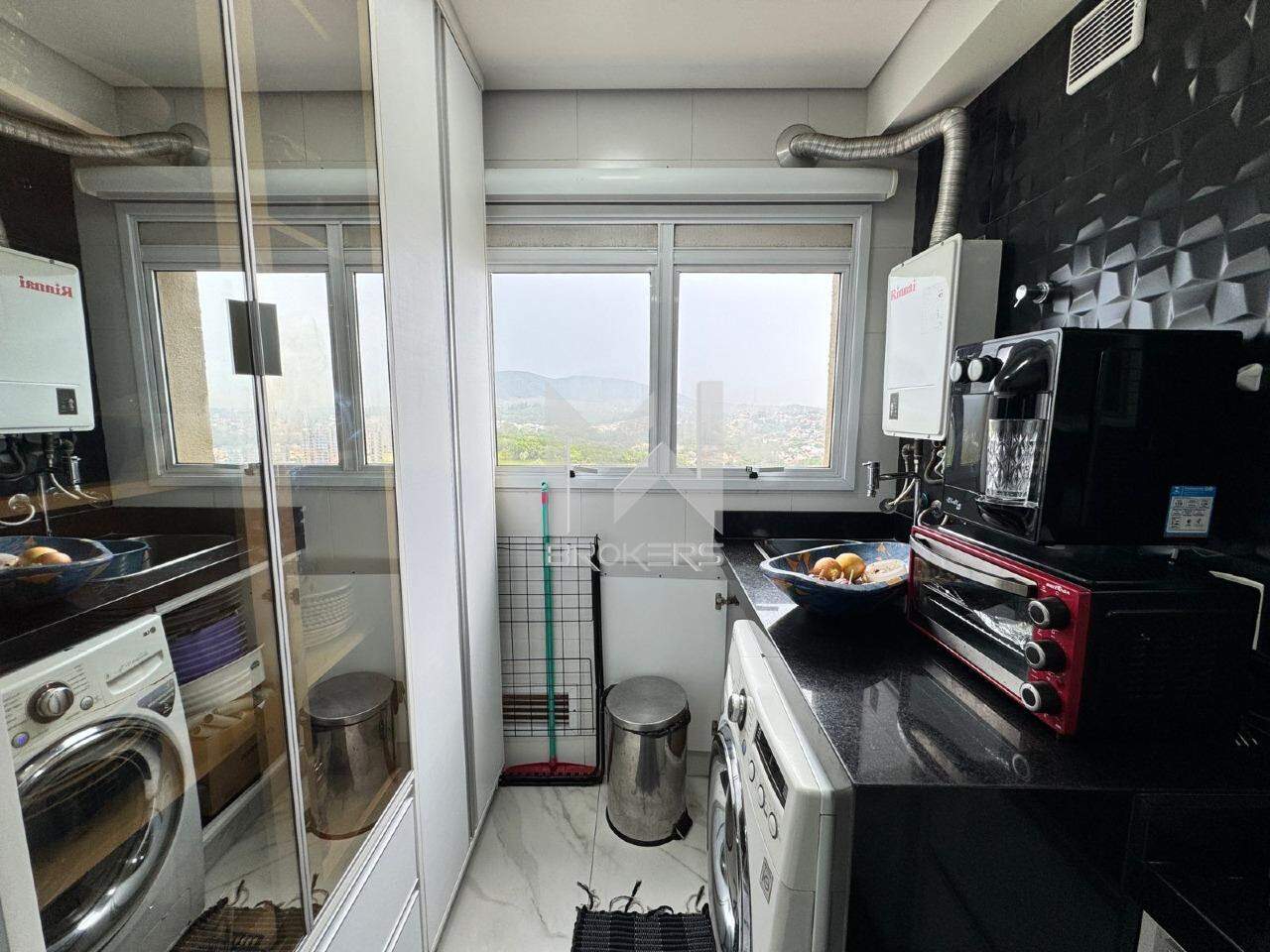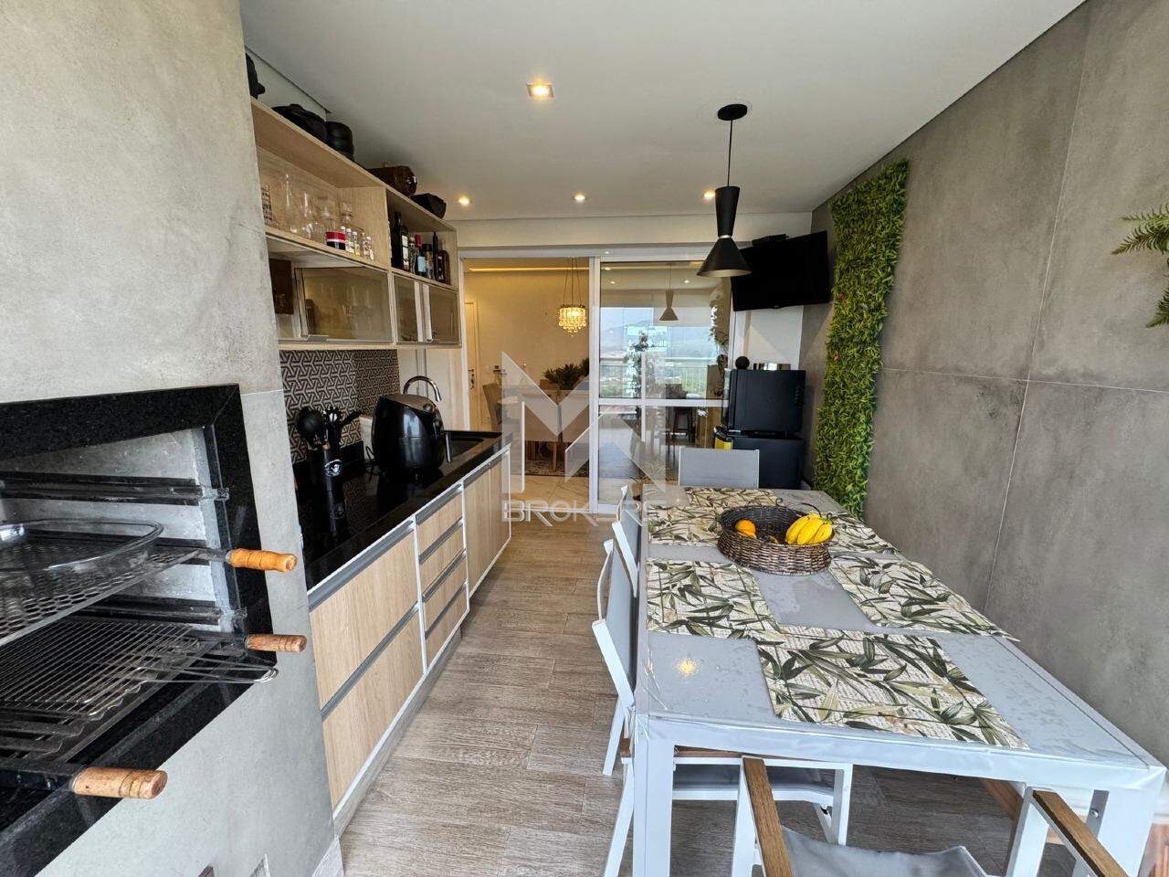 A varanda gourmet com churrasqueira a carvão e fechamento em vidro complementa a área de convivência. A cozinha planejada conta com armários embutidos e piso em porcelanato, assim como a área de serviço, também equipada com armários.