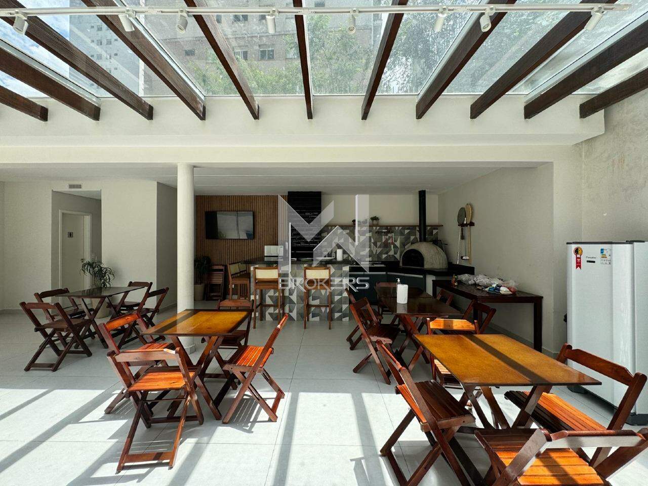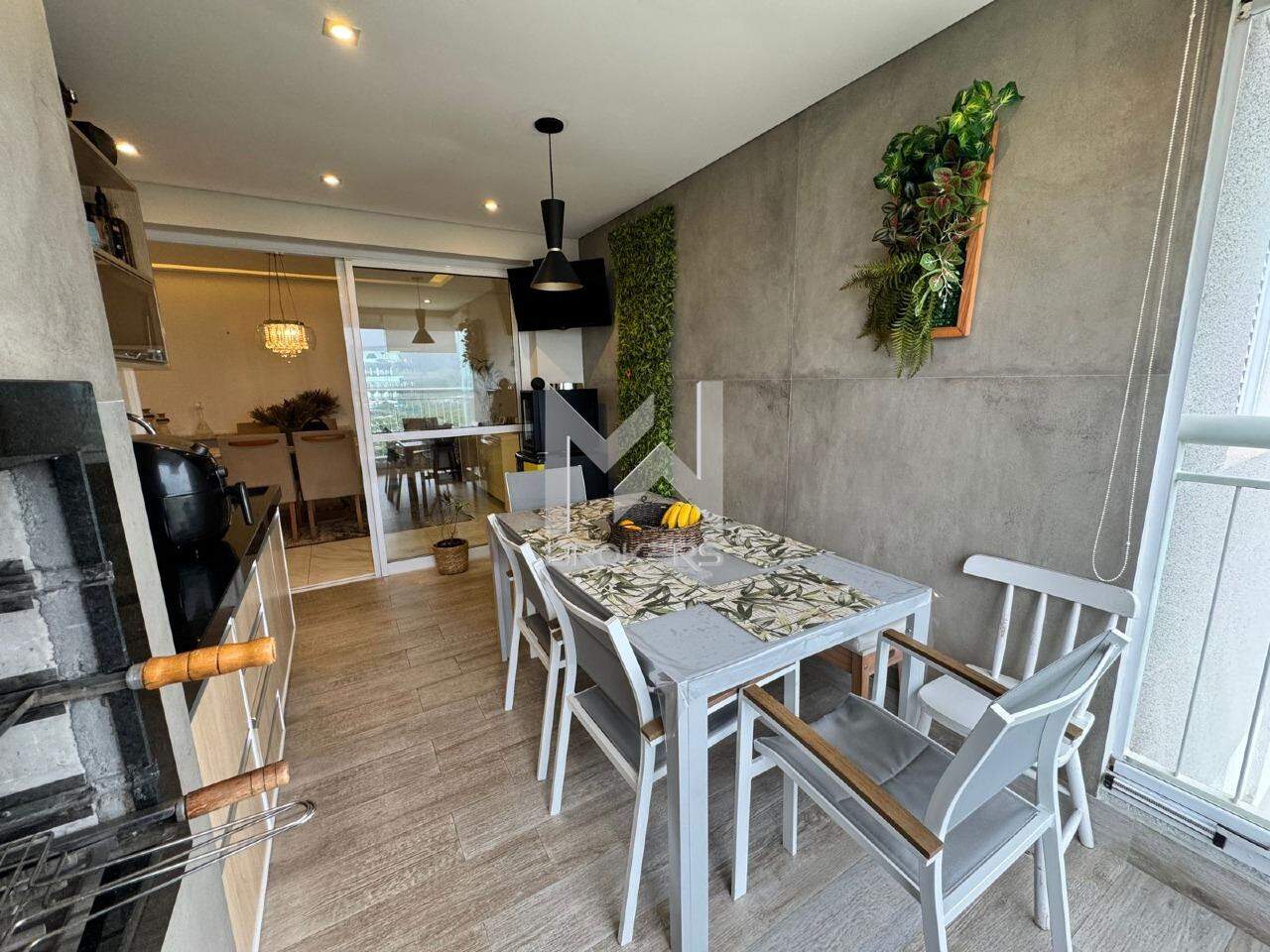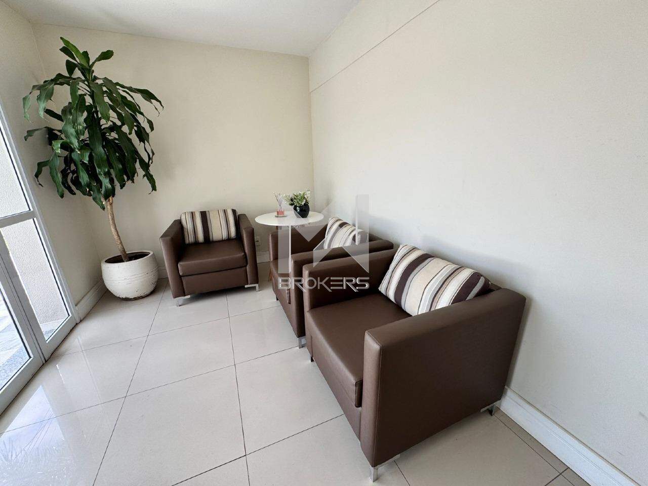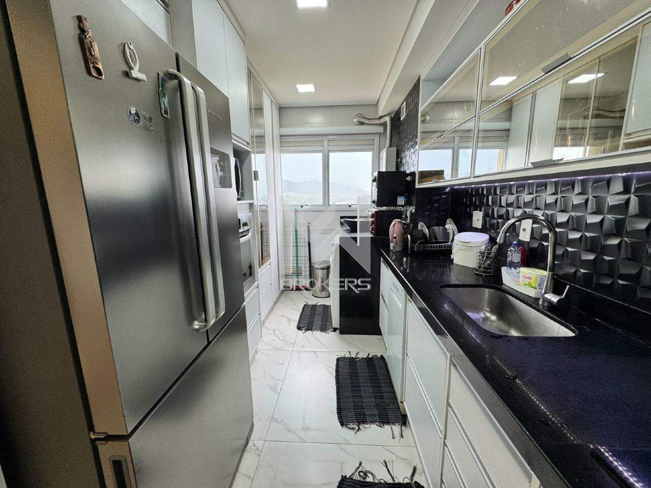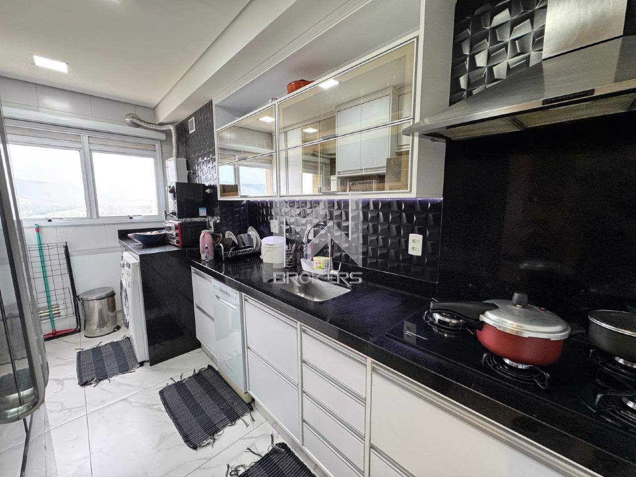 A varanda gourmet com churrasqueira a carvão e fechamento em vidro complementa a área de convivência. A cozinha planejada conta com armários embutidos e piso em porcelanato, assim como a área de serviço, também equipada com armários.