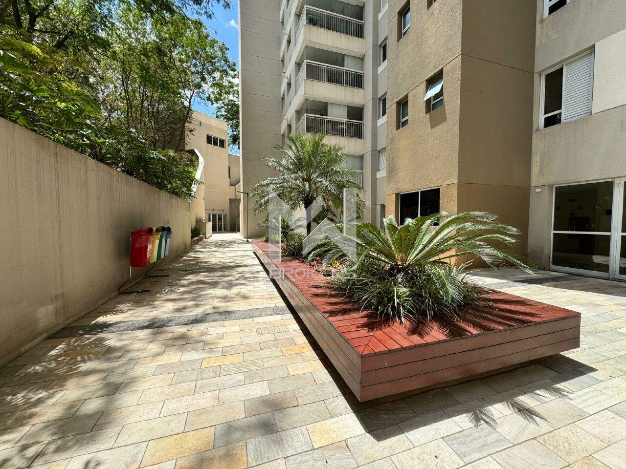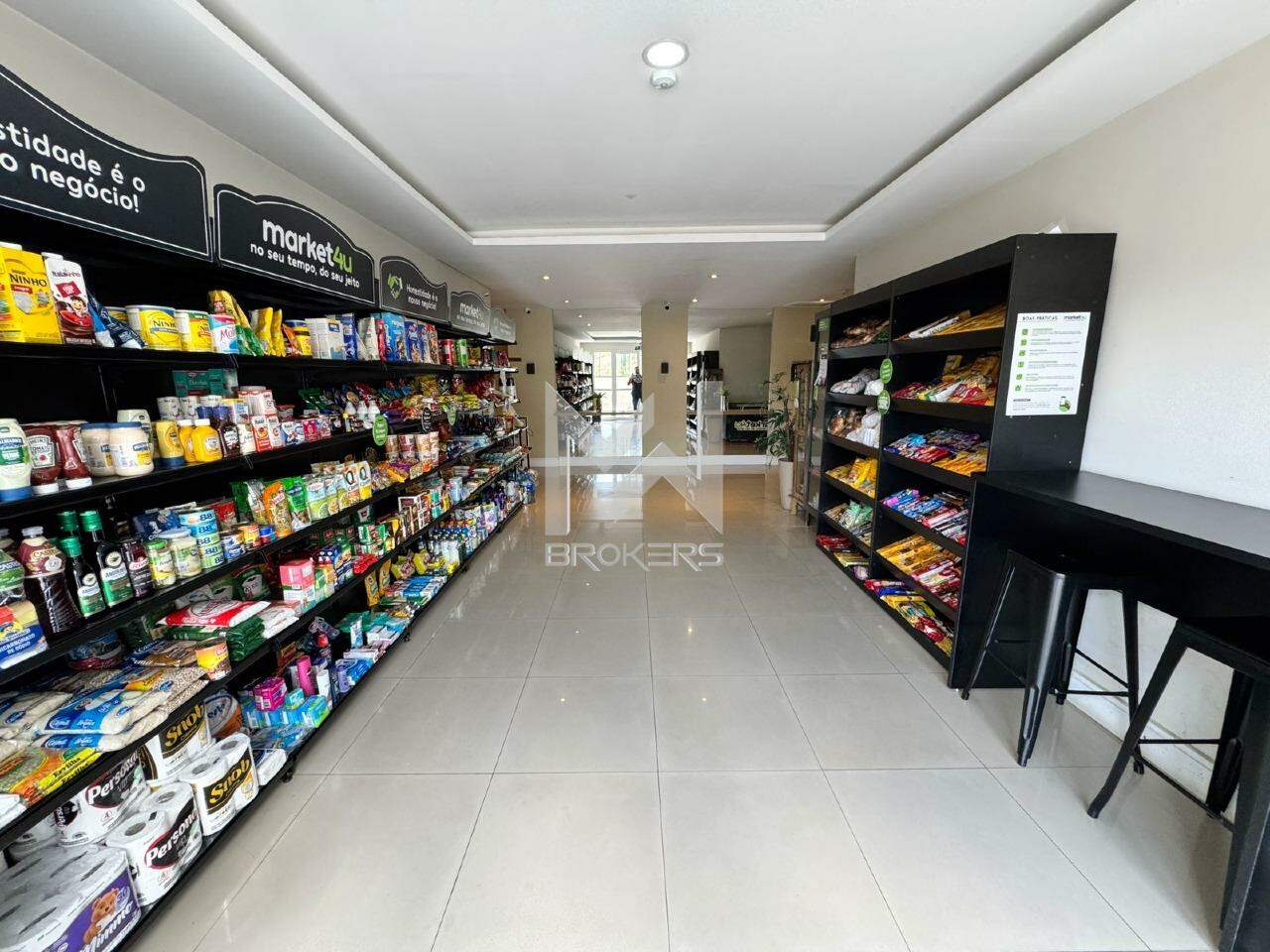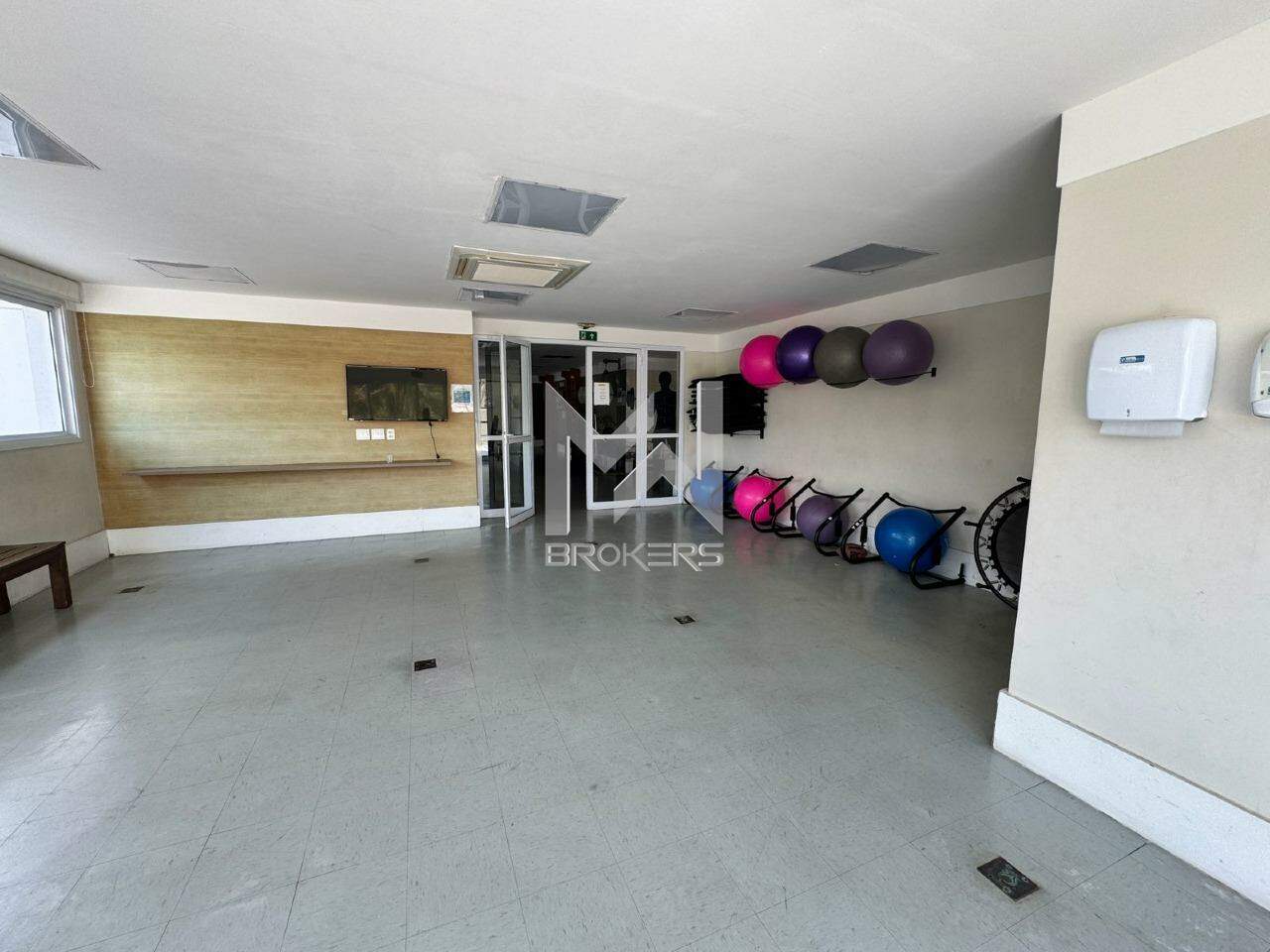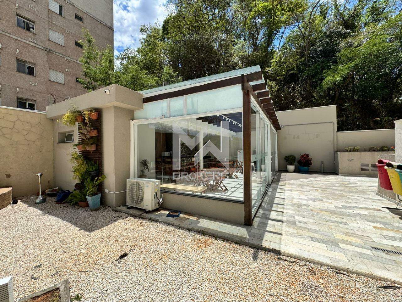 A varanda gourmet com churrasqueira a carvão e fechamento em vidro complementa a área de convivência. A cozinha planejada conta com armários embutidos e piso em porcelanato, assim como a área de serviço, também equipada com armários.
