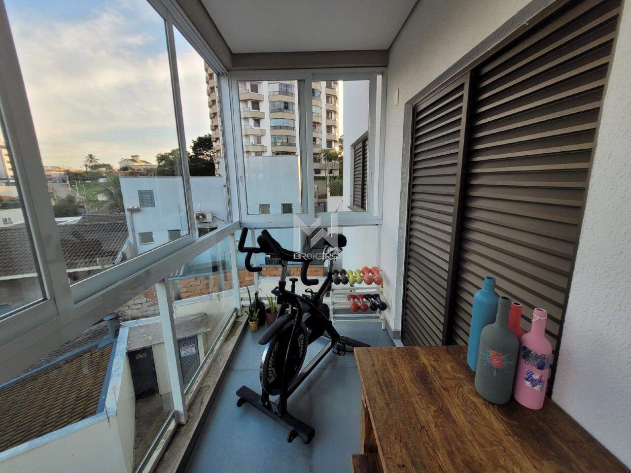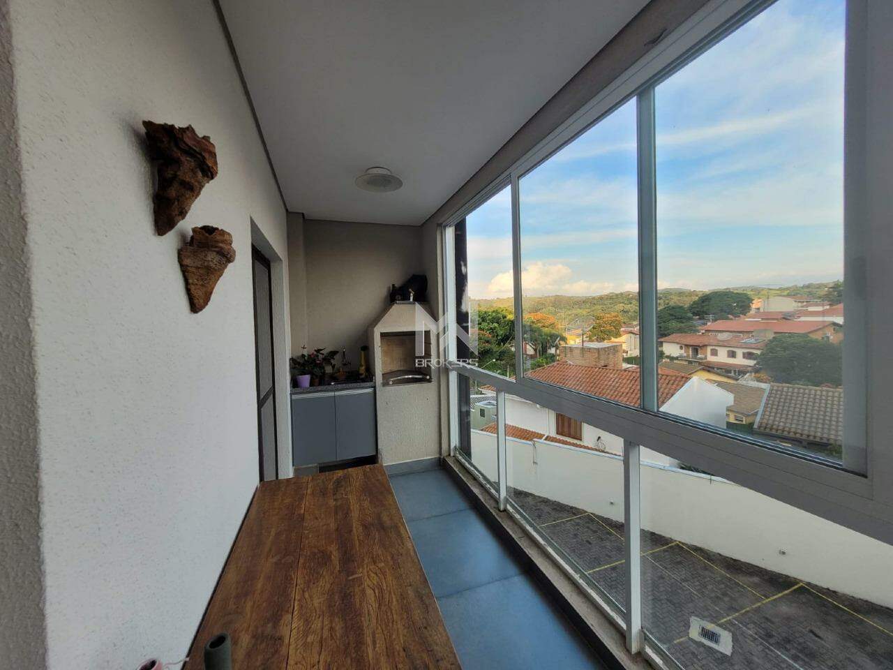 Sala de estar e de refeições integradas, varanda gourmet com churrasqueira e fechamento em vidro, cozinha integrada, despensa, área de serviços, banheiro social e área íntima com 03 dormitórios, sendo uma suíte com ar condicionado.