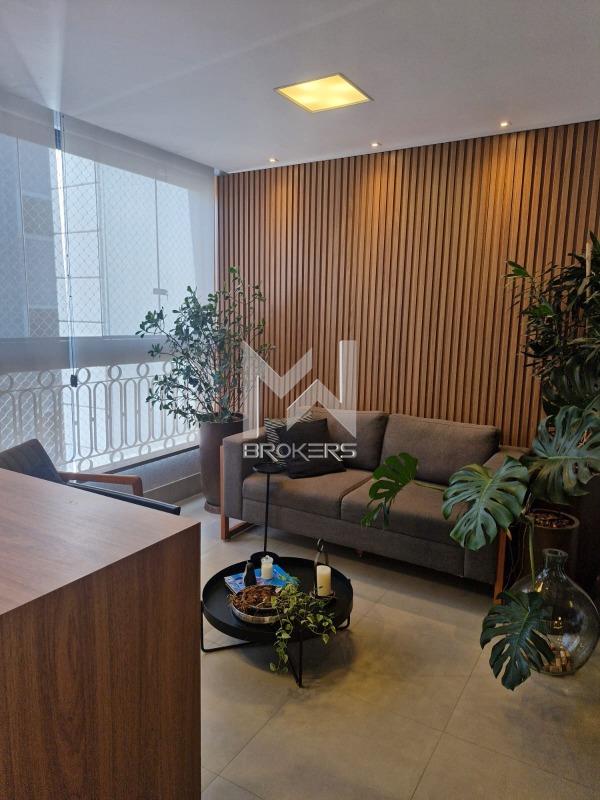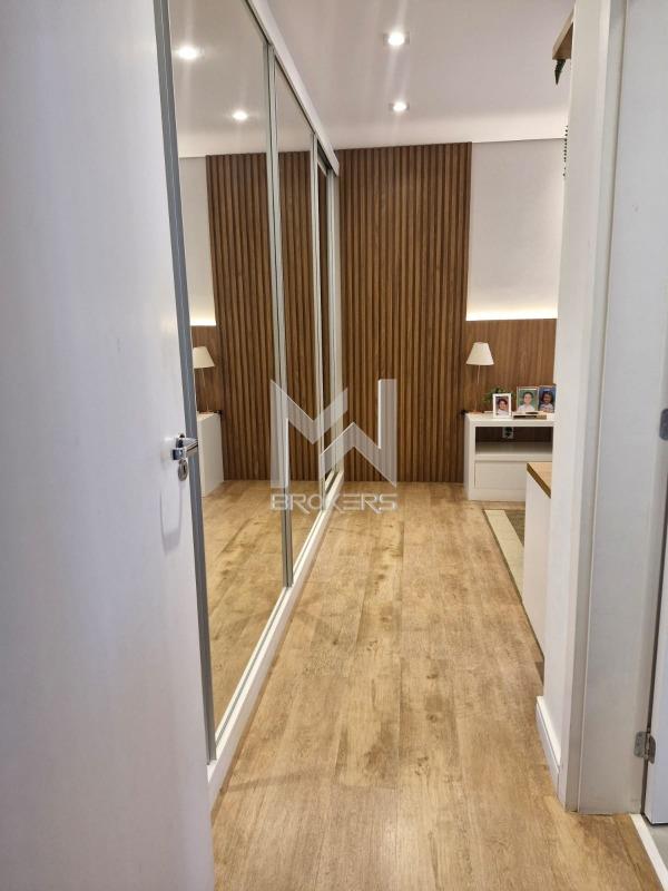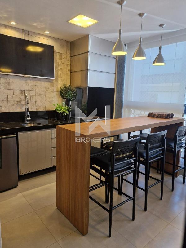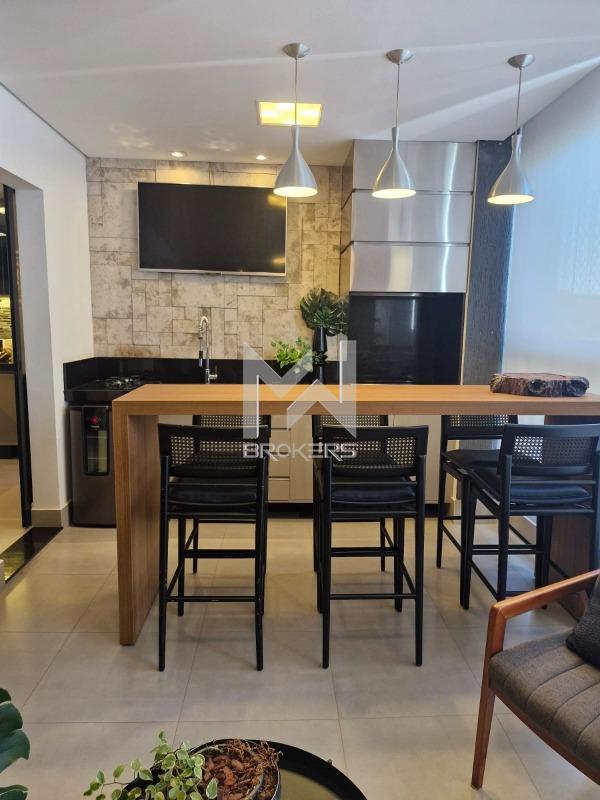 Sala dois ambientes: estar e refeições, integradas à varanda gourmet com bancada em ilha, lavabo, cozinha equipada com armários, coifa, fogão e forno, e é integrada com a área de serviços, também repleta de armários.