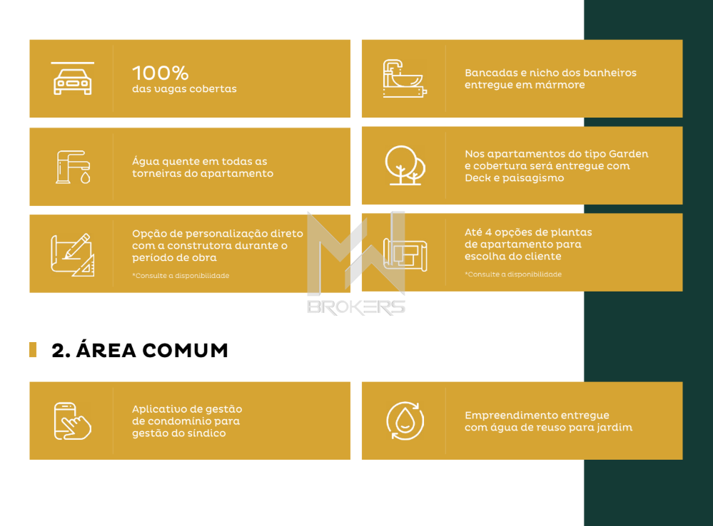 Já as unidades cobertura, com 165,76 m², oferecem ainda mais espaço e privacidade. Com 3 dormitórios e piso superior equipado com espaço gourmet, você terá um ambiente perfeito para aproveitar momentos de lazer e entretenimento em família.