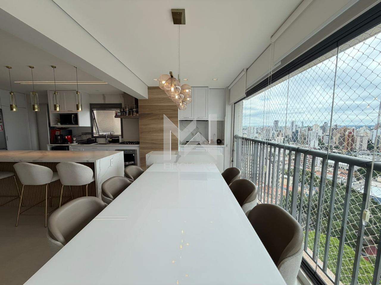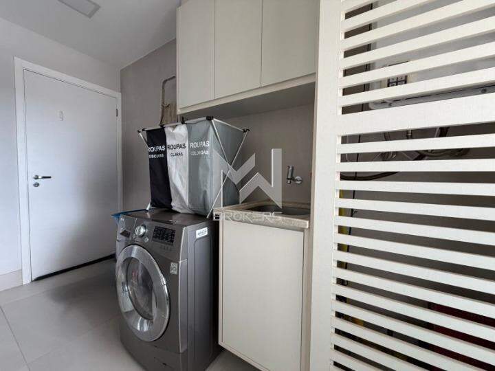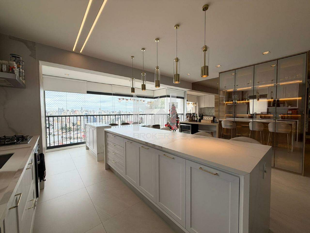 Salas de estar e de refeições integradas à cozinha, lavabo, área de serviços, varanda gourmet com fechamento em vidro.