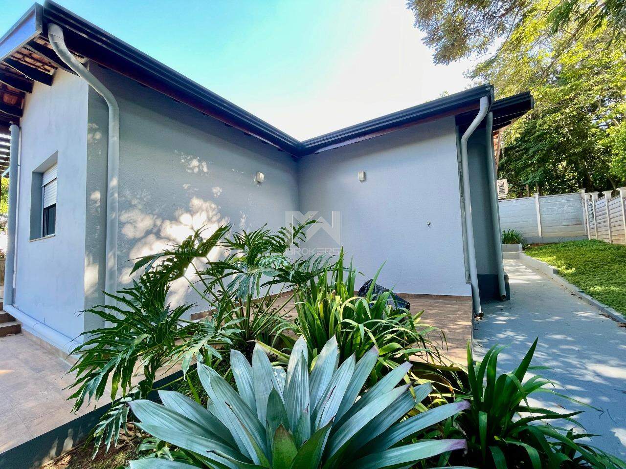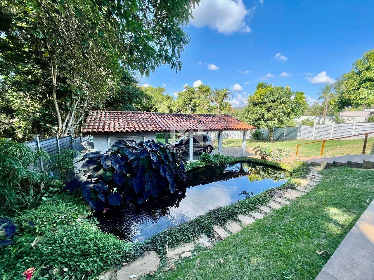 Com um terreno dividido em dois platôs, no primeiro temos um grande gramado plano, garagem com deposito e um canil. A casa fico na parte mais alta do terreno tendo em sua entrada um lago para peixes com um lindo paisagismo que compõem a fachada.