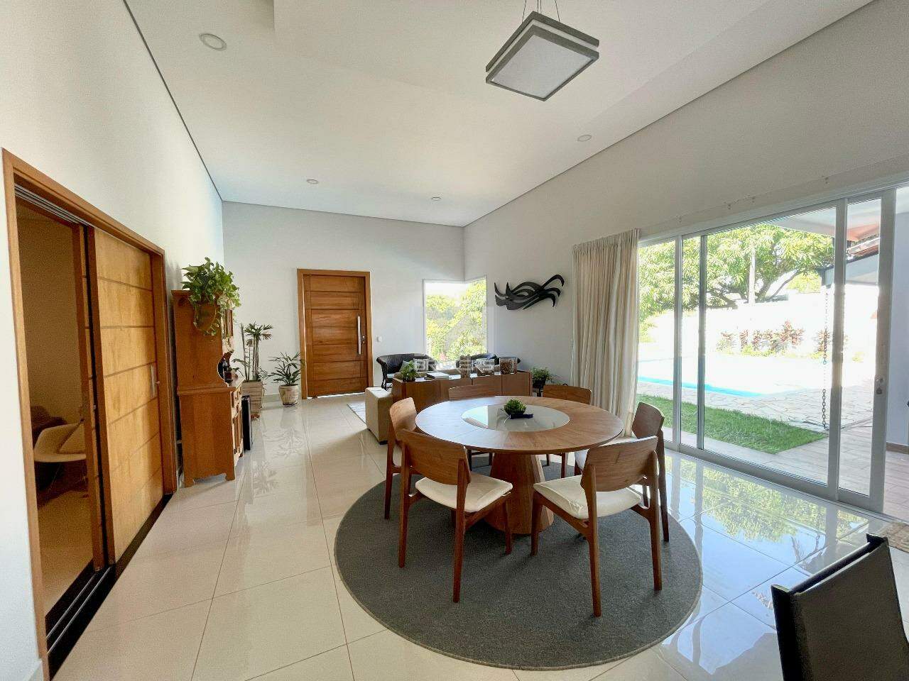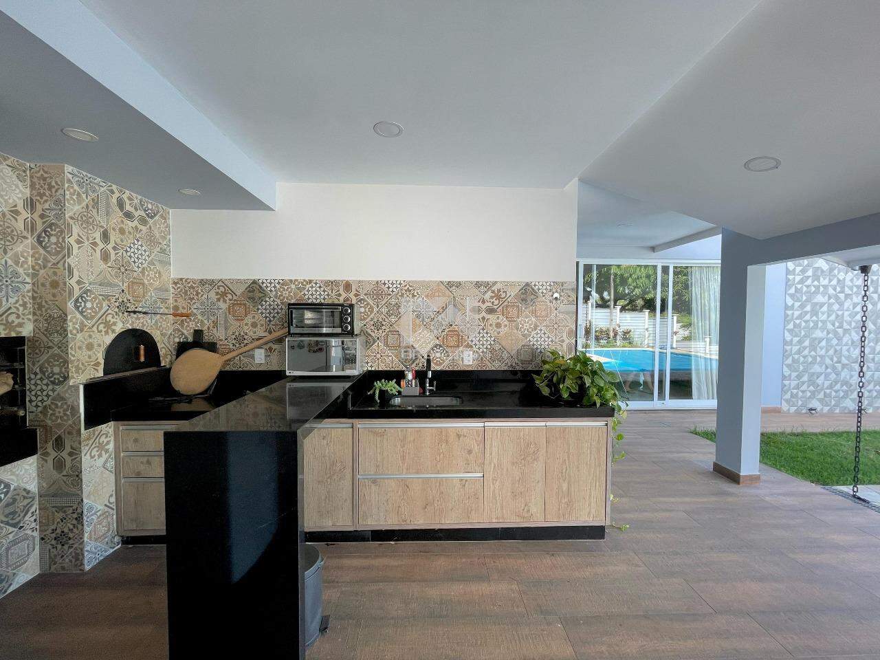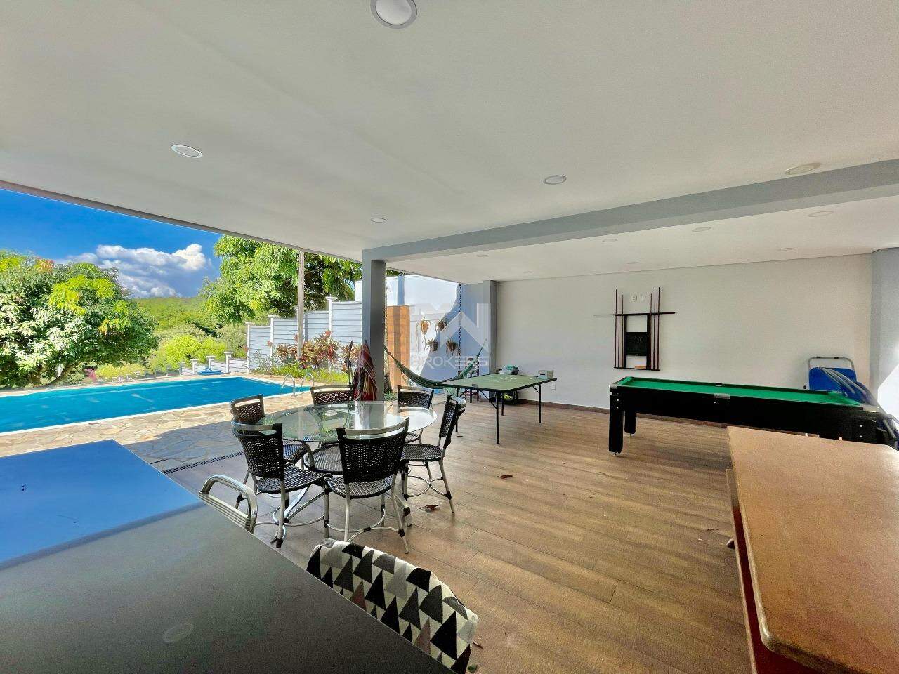 A casa conta com sala de jantar e estar integradas com uma cozinha moderna, com uma bancada de pedra que serve de apoio, cozinha e lavanderia com móveis planejados. Ainda na área comum da casa temos um home theater separado por uma porta ampla de madeira. Essa área comum é integrada com a área de lazer que conta com piscina aquecida por placa solar, churrasqueira, forno de pizza e um espaço externo de convivência.