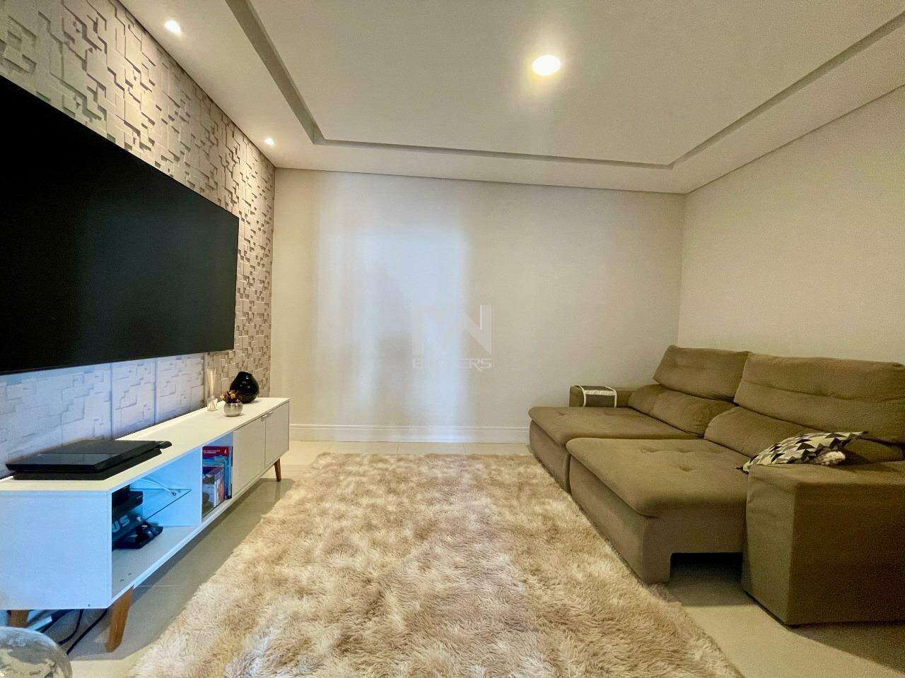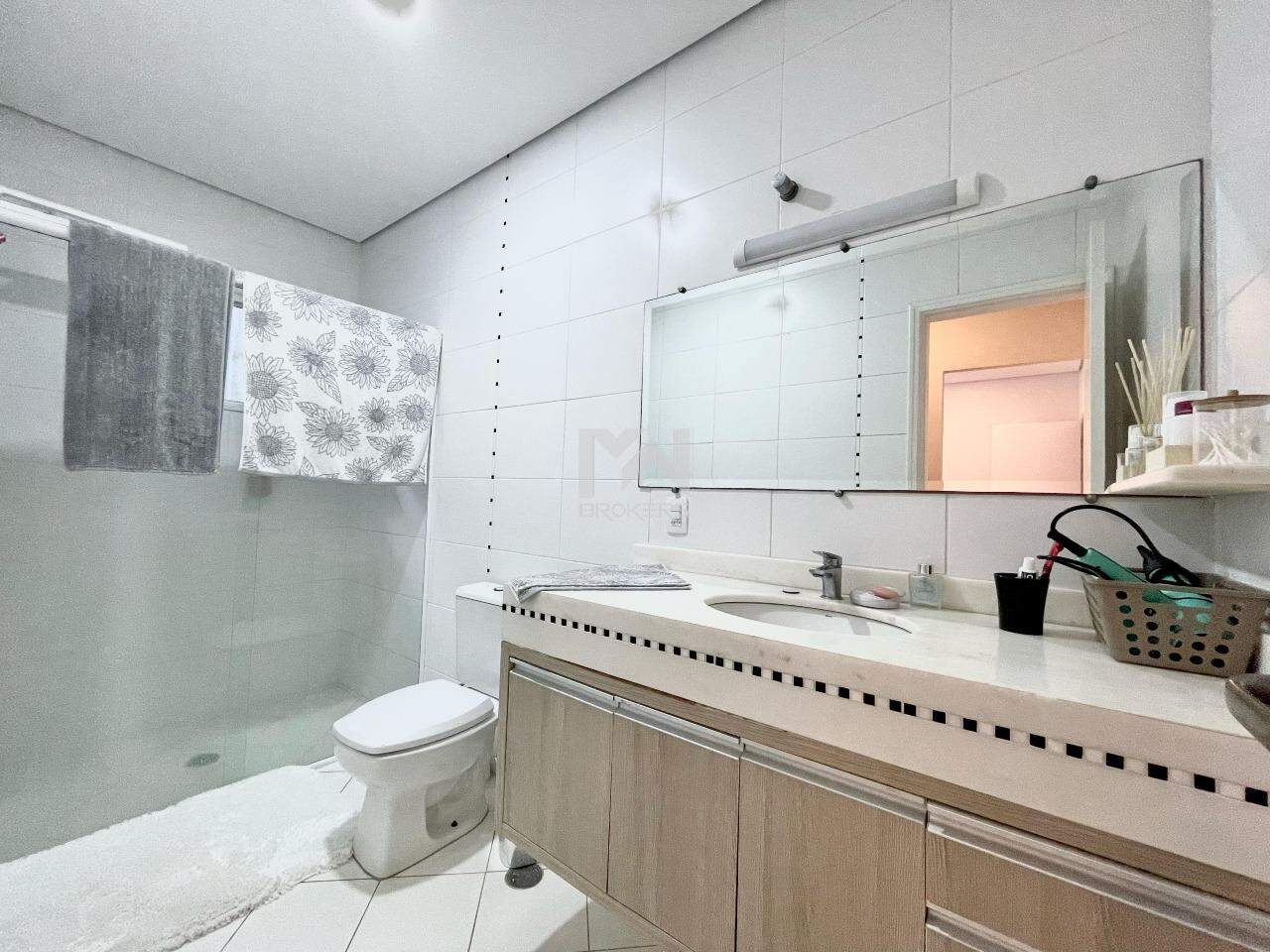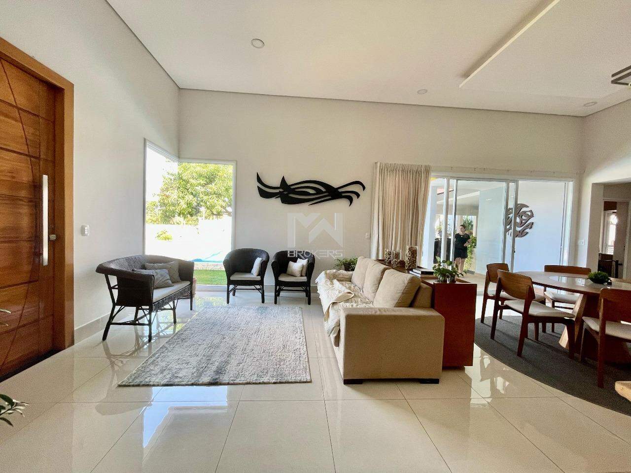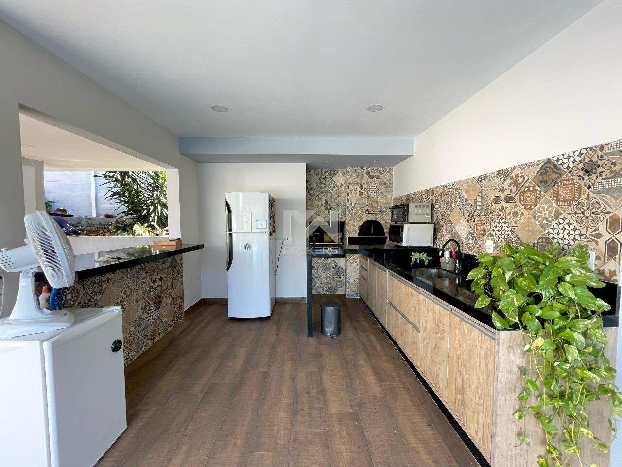 A casa conta com sala de jantar e estar integradas com uma cozinha moderna, com uma bancada de pedra que serve de apoio, cozinha e lavanderia com móveis planejados. Ainda na área comum da casa temos um home theater separado por uma porta ampla de madeira. Essa área comum é integrada com a área de lazer que conta com piscina aquecida por placa solar, churrasqueira, forno de pizza e um espaço externo de convivência.