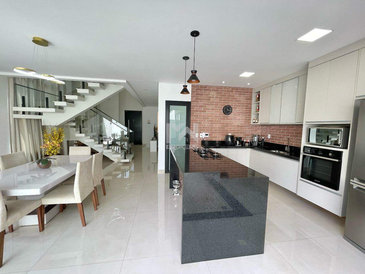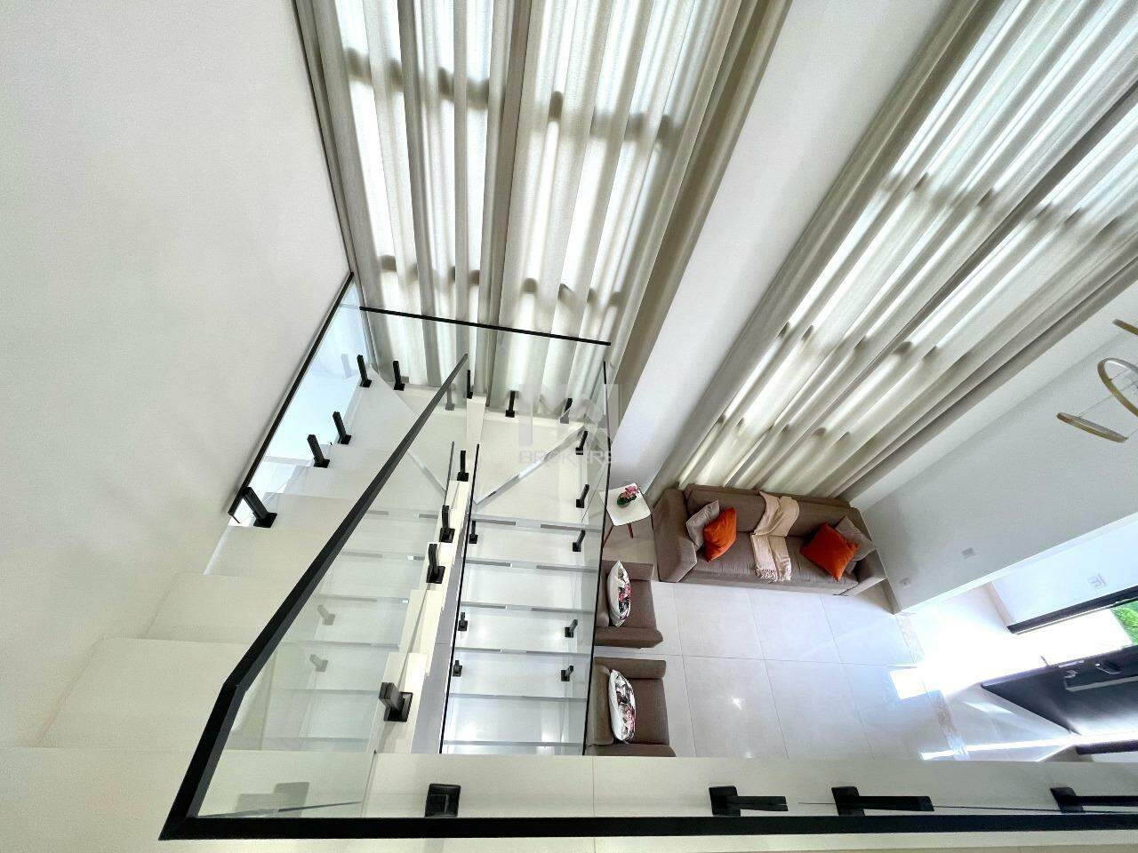 No primeiro pavimento temos uma garagem coberta para dois carros, uma entrada imponente com pé direito duplo onde temos uma sala de estar integrada com a de jantar e uma cozinha com concito aberto que se conecta com a área gourmet com apoio para a área externa e piscina. Ainda no térreo temos mais um cômodo que pode ser escritório ou mais um quarto com o lavabo com chuveiro ao lado.