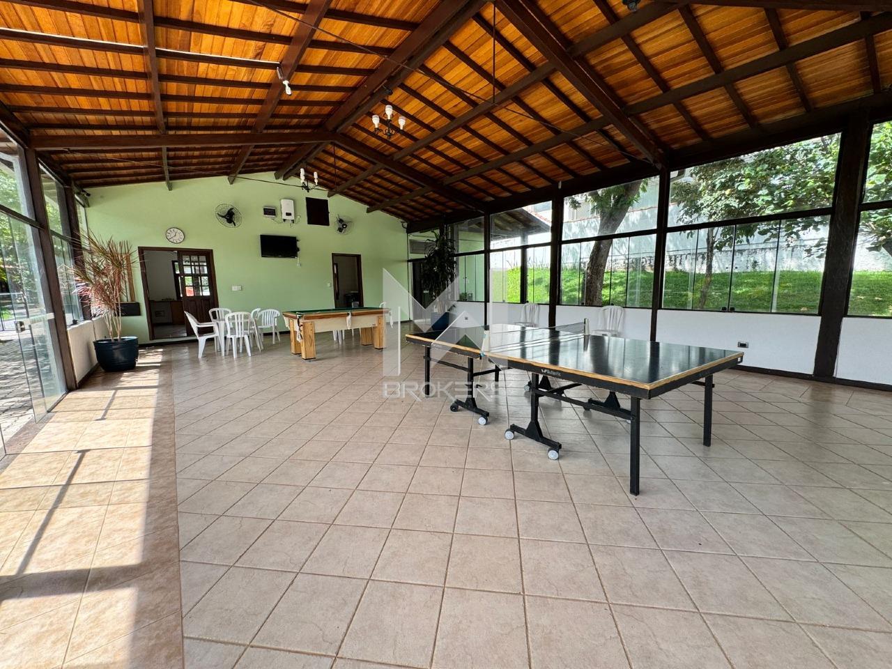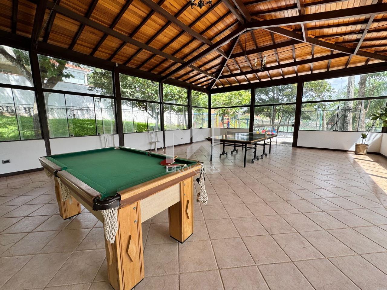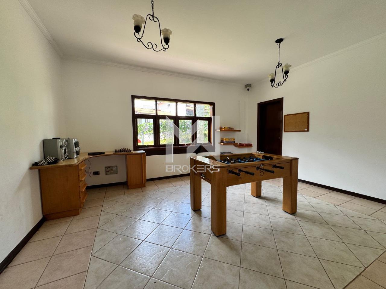 Sala dois ambientes com jardim de inverno, sendo a de estar com lareira e sala de refeições, sala de TV, lavabo, cozinha americana toda planejada com despensa, área de serviços e sala de jogos.
