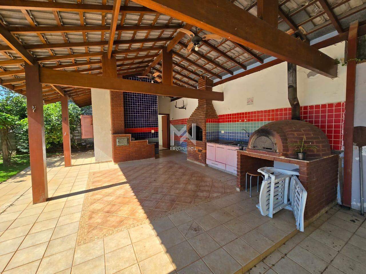 Nos fundos, espaço gourmet completo com churrasqueira, fogão à lenha e forno de pizza, integrado à piscina.