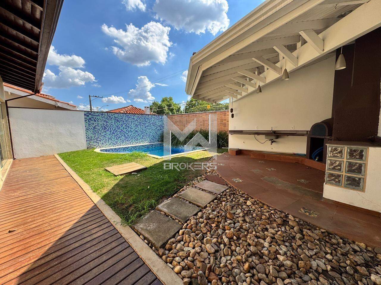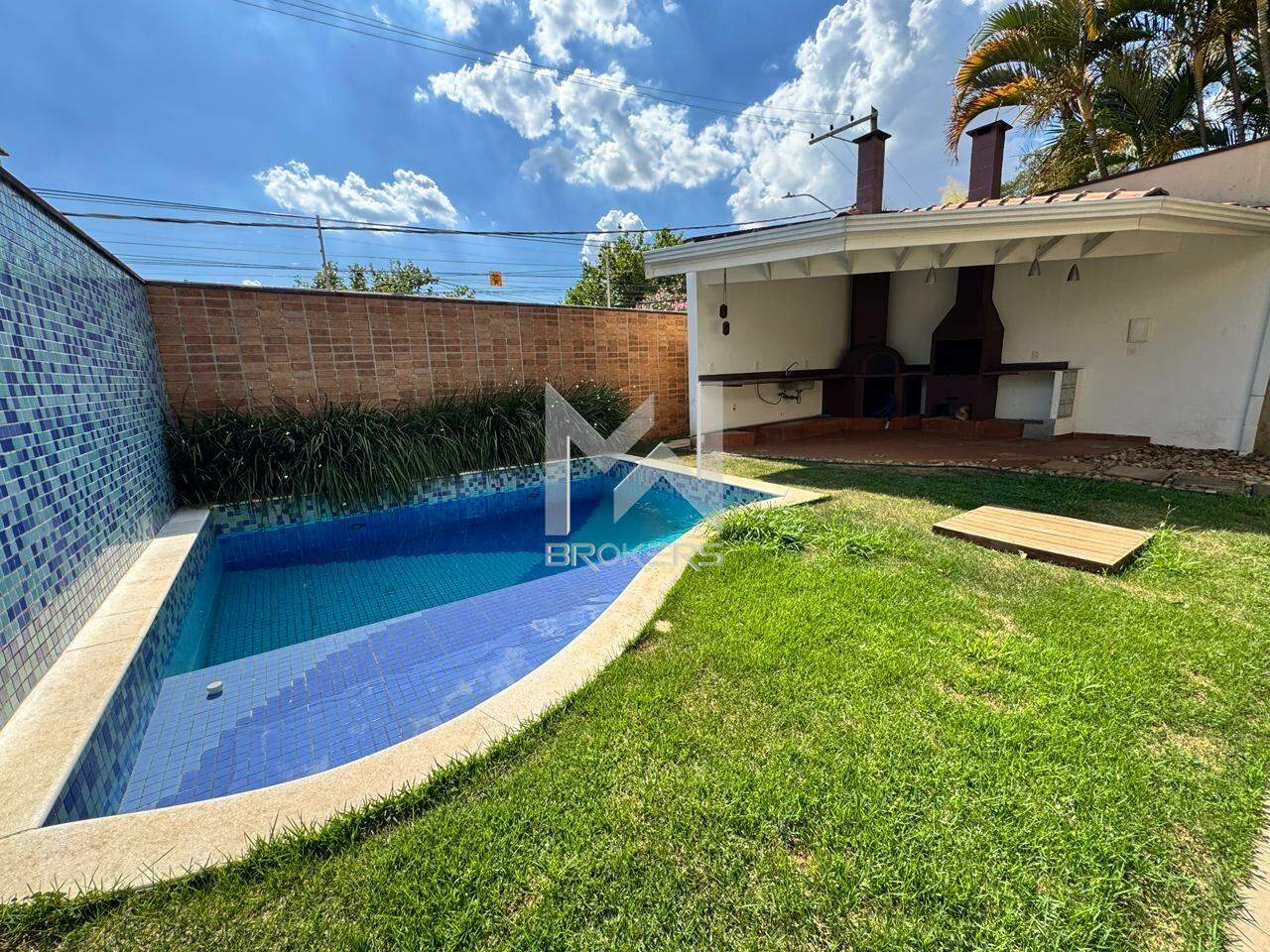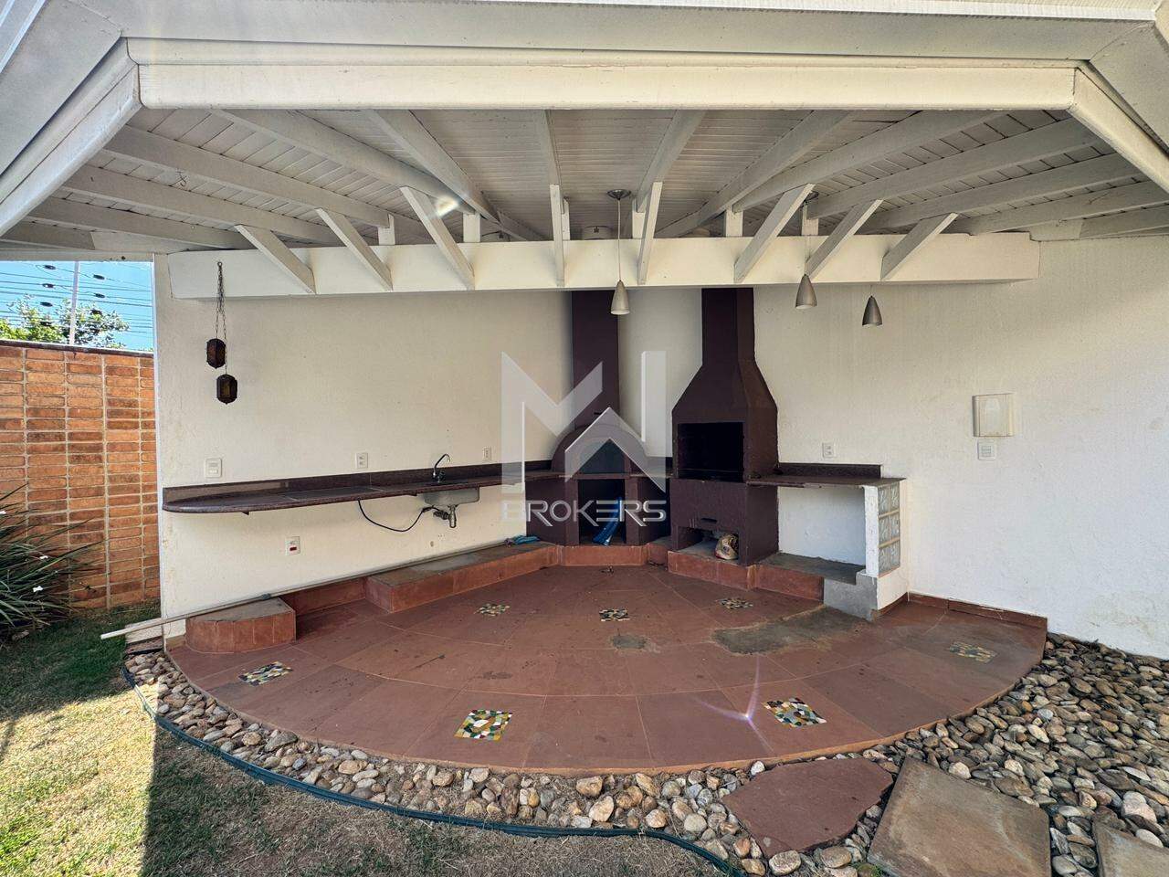 Sala de estar e de refeições integradas, lavabo, escritório, cozinha, área de serviços, área gourmet com churrasqueira e forno de pizza, quintal gramado e piscina.