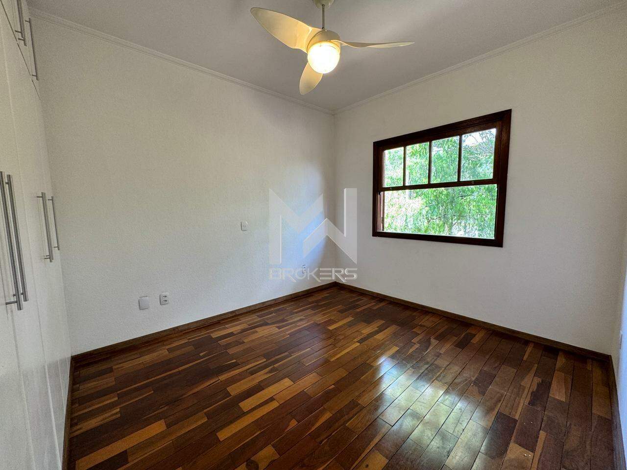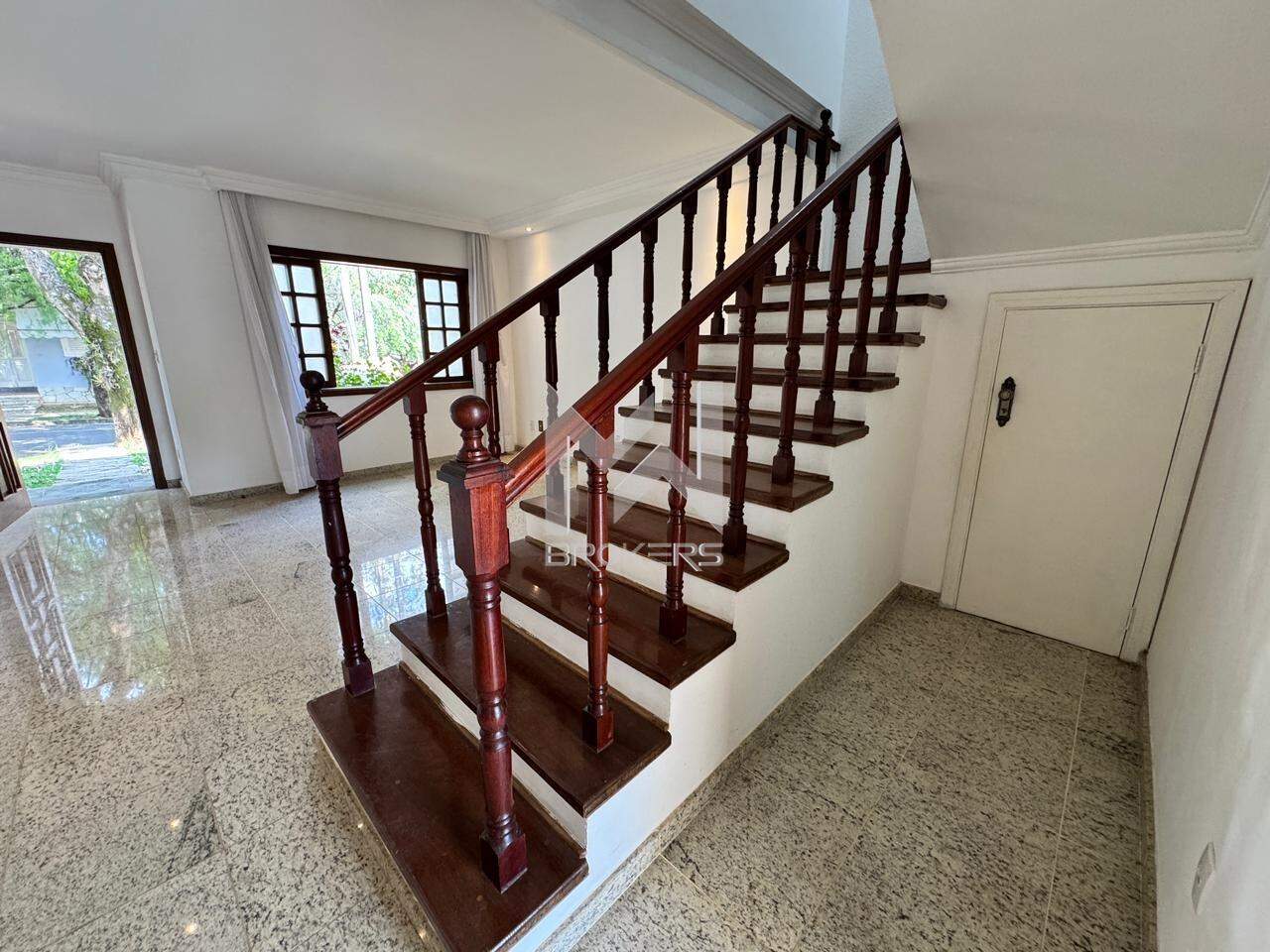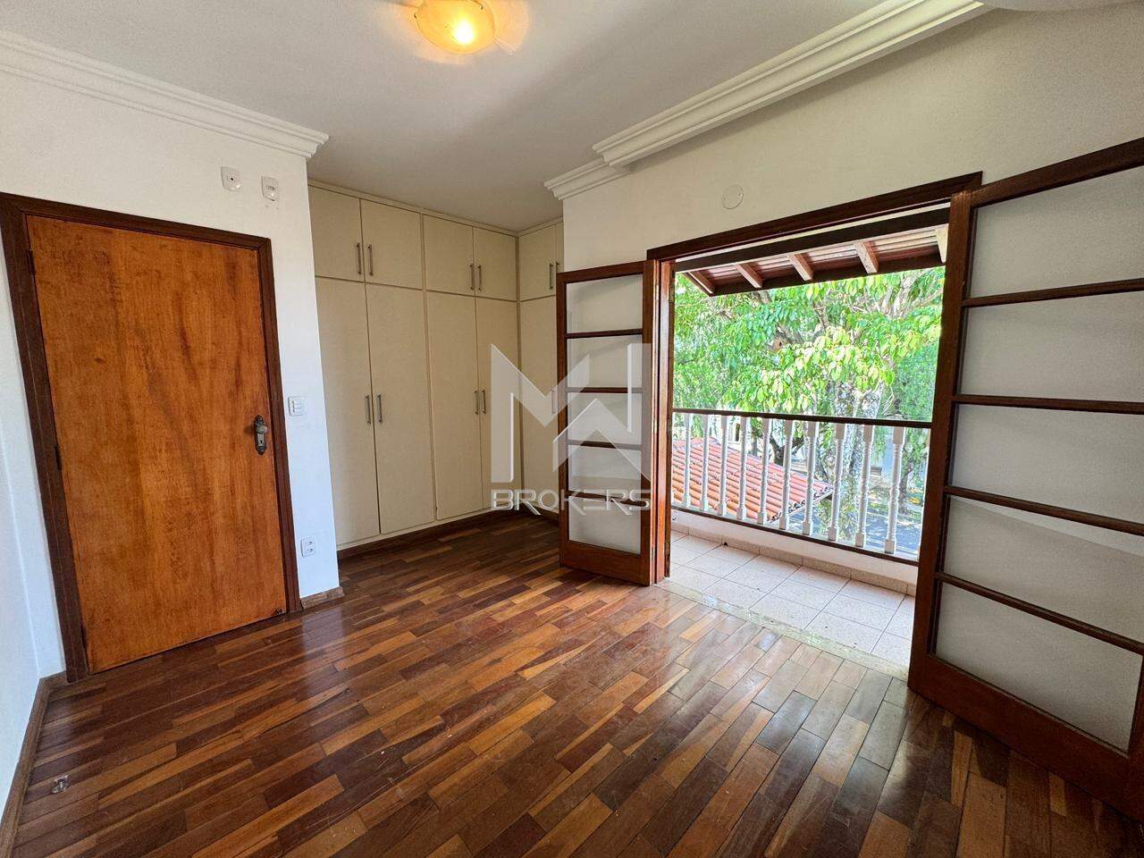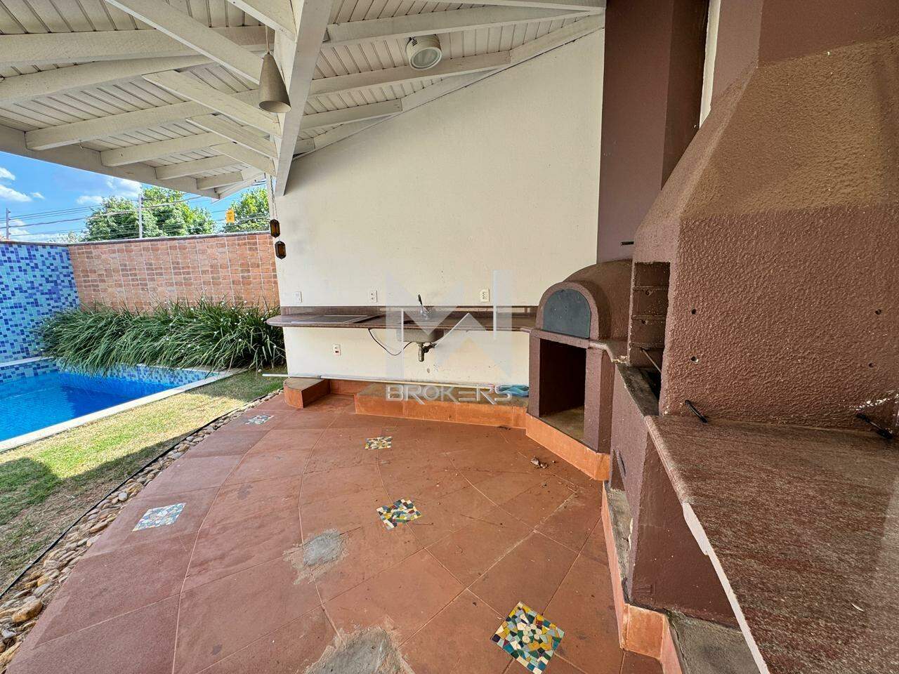 Sala de estar e de refeições integradas, lavabo, escritório, cozinha, área de serviços, área gourmet com churrasqueira e forno de pizza, quintal gramado e piscina.
