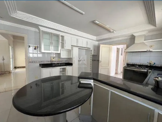 Sala de estar com lareira e sala de jantar com pé direito duplo, lavabo, cozinha planejada com copa e despensa, área de serviços com dormitório e banheiro para doméstica, terraço, adega, área gourmet fechada e área gourmet aberta em quiosque, fonte com pequeno lago e piscina. Área íntima com 03 dormitórios, todos suítes, no pavimento térreo.