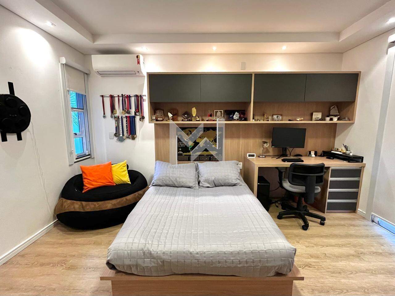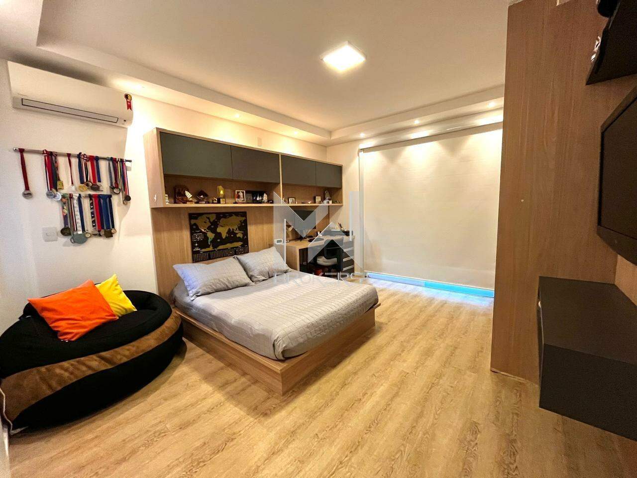 No pavimento superior, 04 dormitórios, todos suítes, com armários planejados e ar condicionado, 03 com varanda e vista, a master com closet.