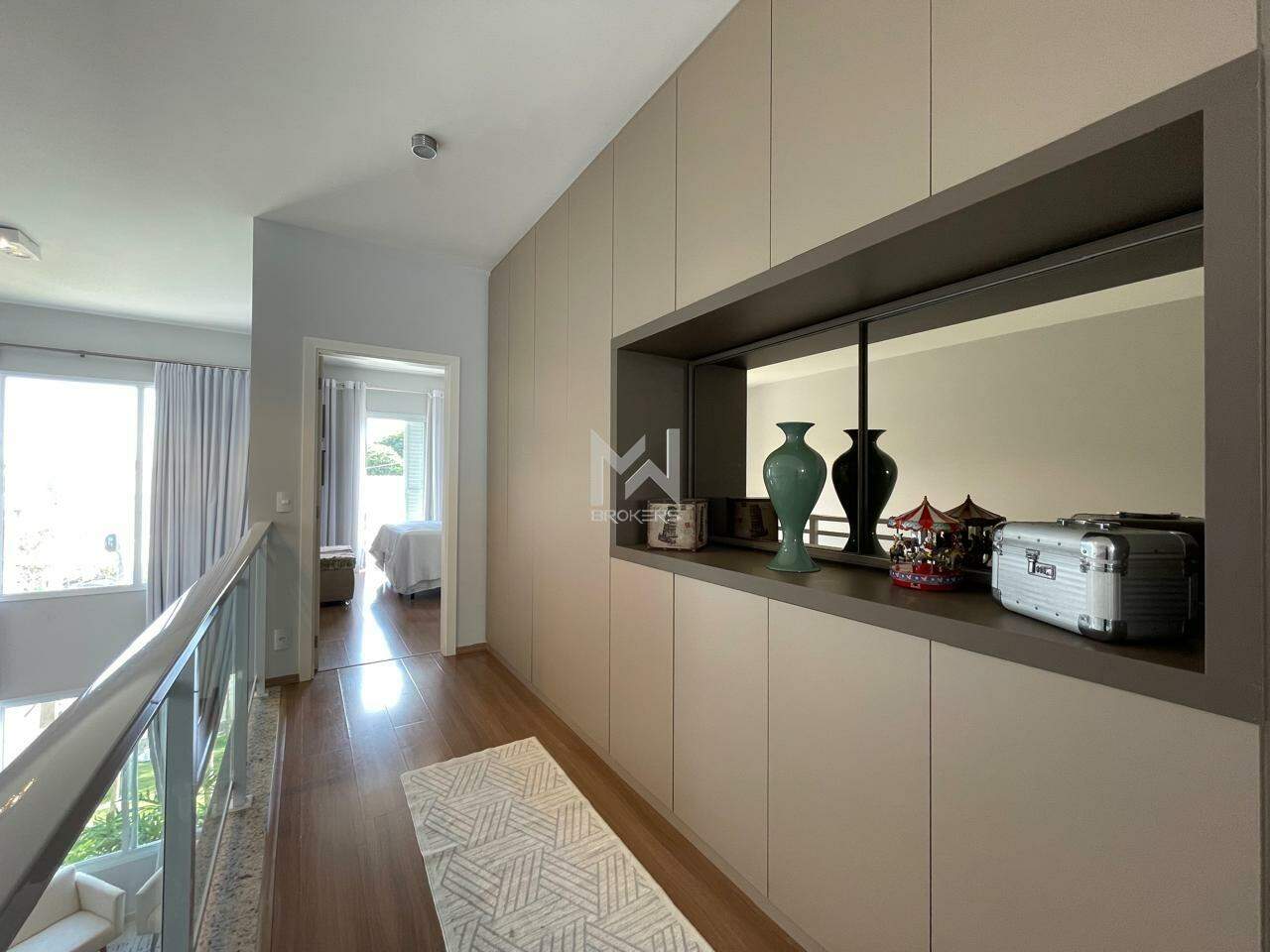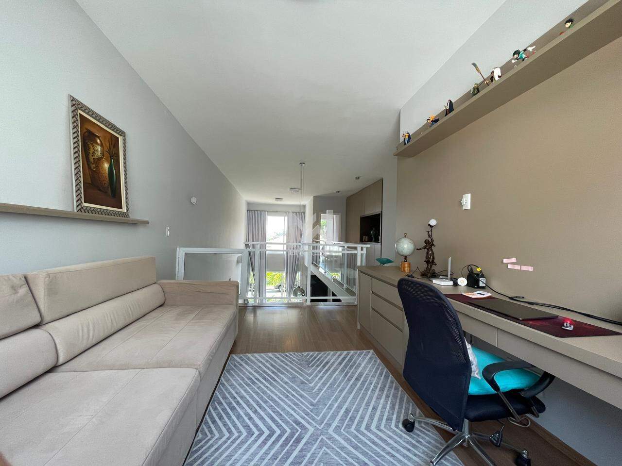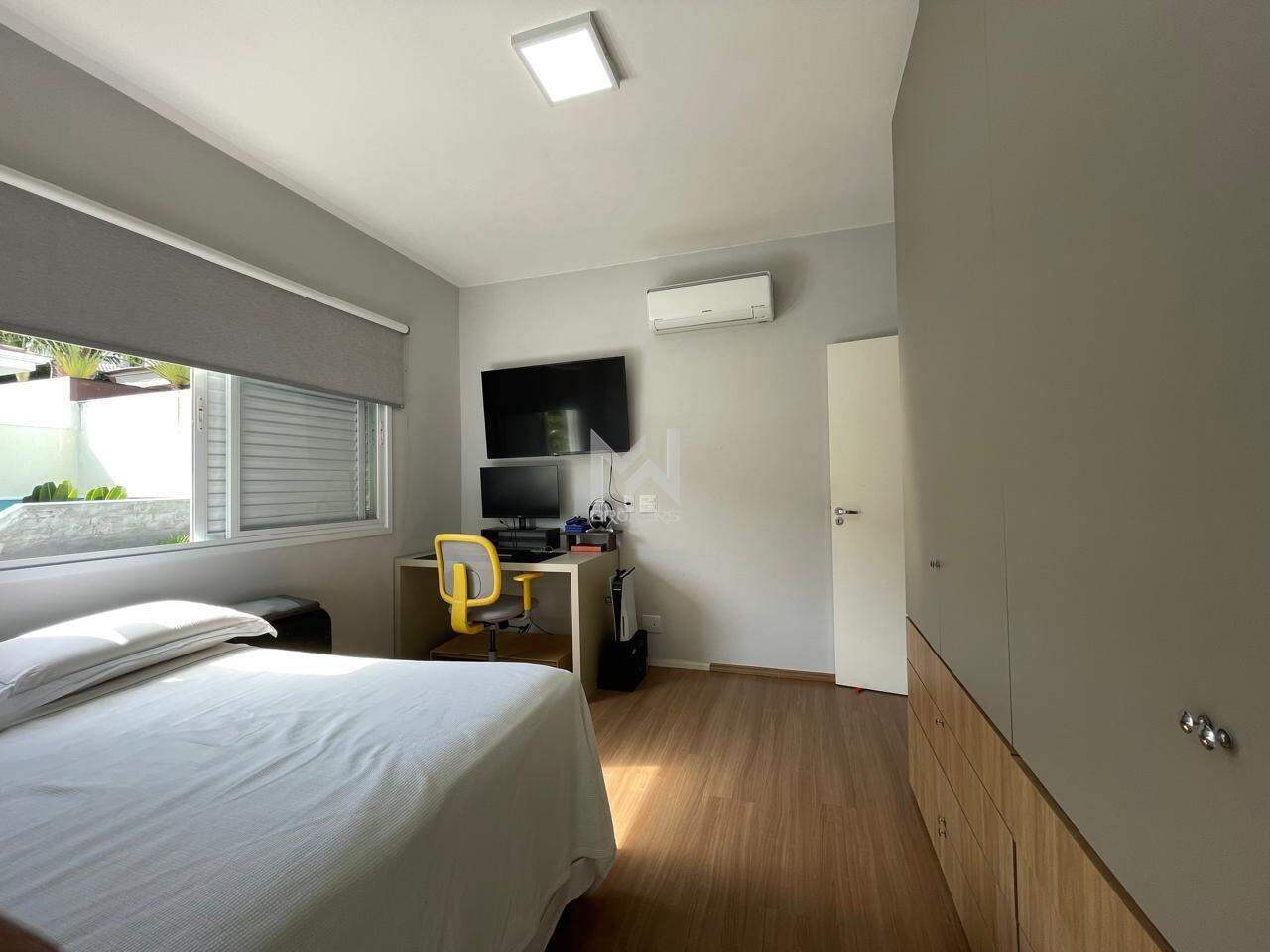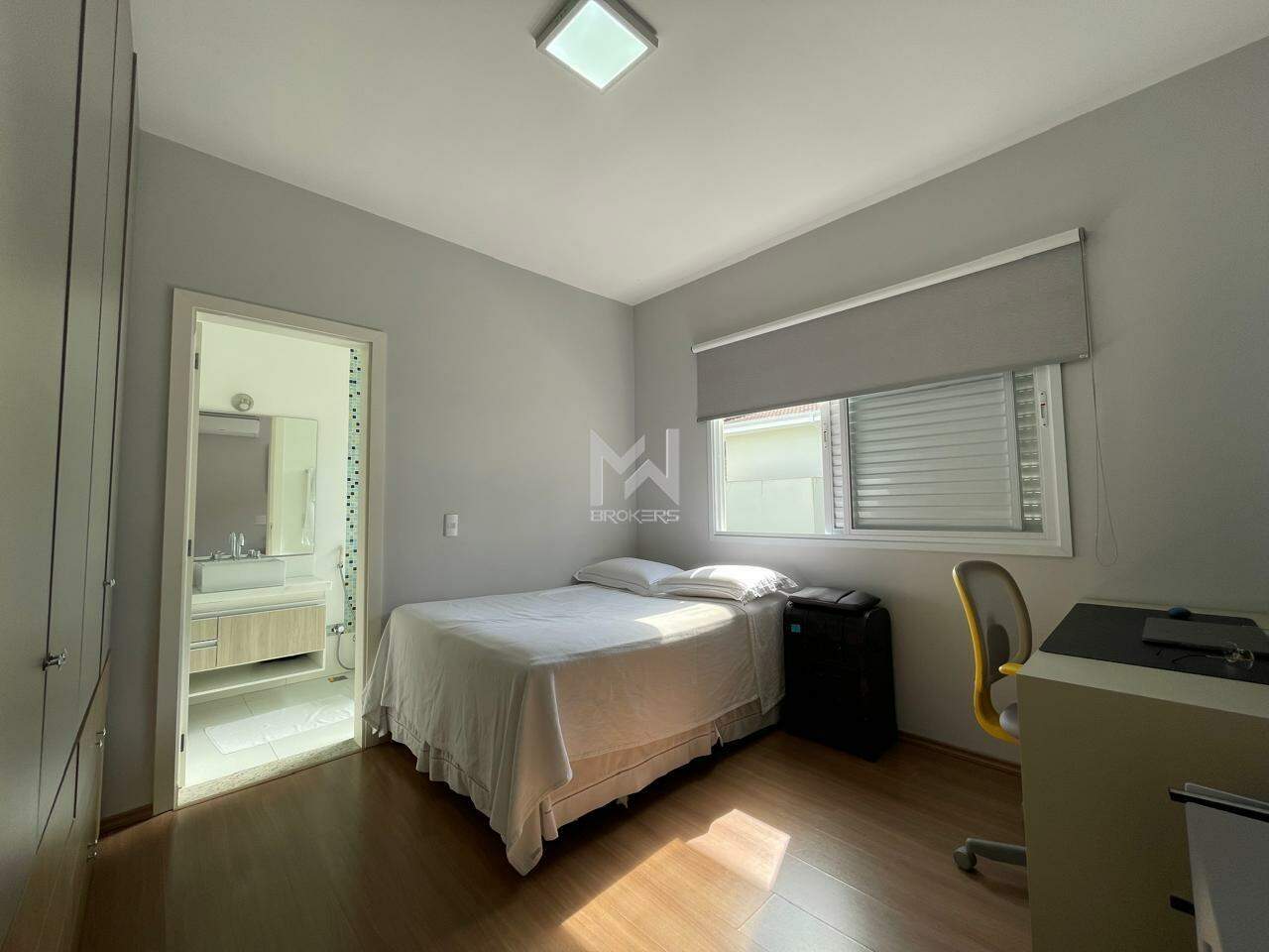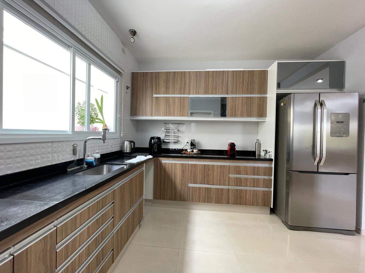 A casa possui três suítes confortáveis, sendo a master com closet e varanda privativa. Um escritório versátil, que também pode ser usado como sala de TV, oferece praticidade para quem trabalha em casa. São cinco banheiros no total, todos com excelente acabamento. O imóvel conta ainda com sistema de aquecimento solar, ar-condicionado instalado em diversos ambientes, energia fotovoltaica e armários planejados em toda a casa. A garagem tem capacidade para até quatro veículos.