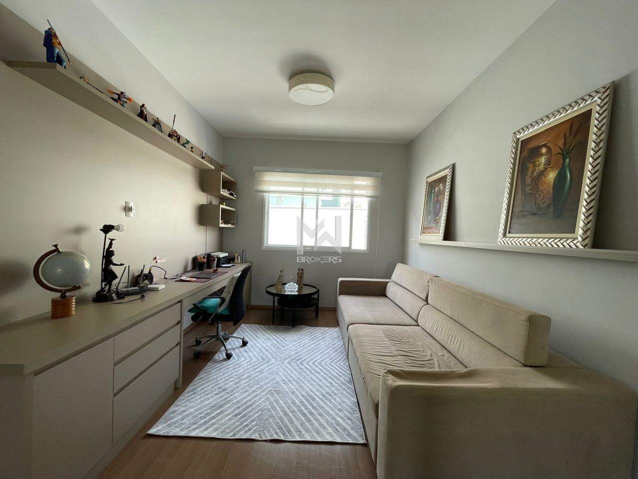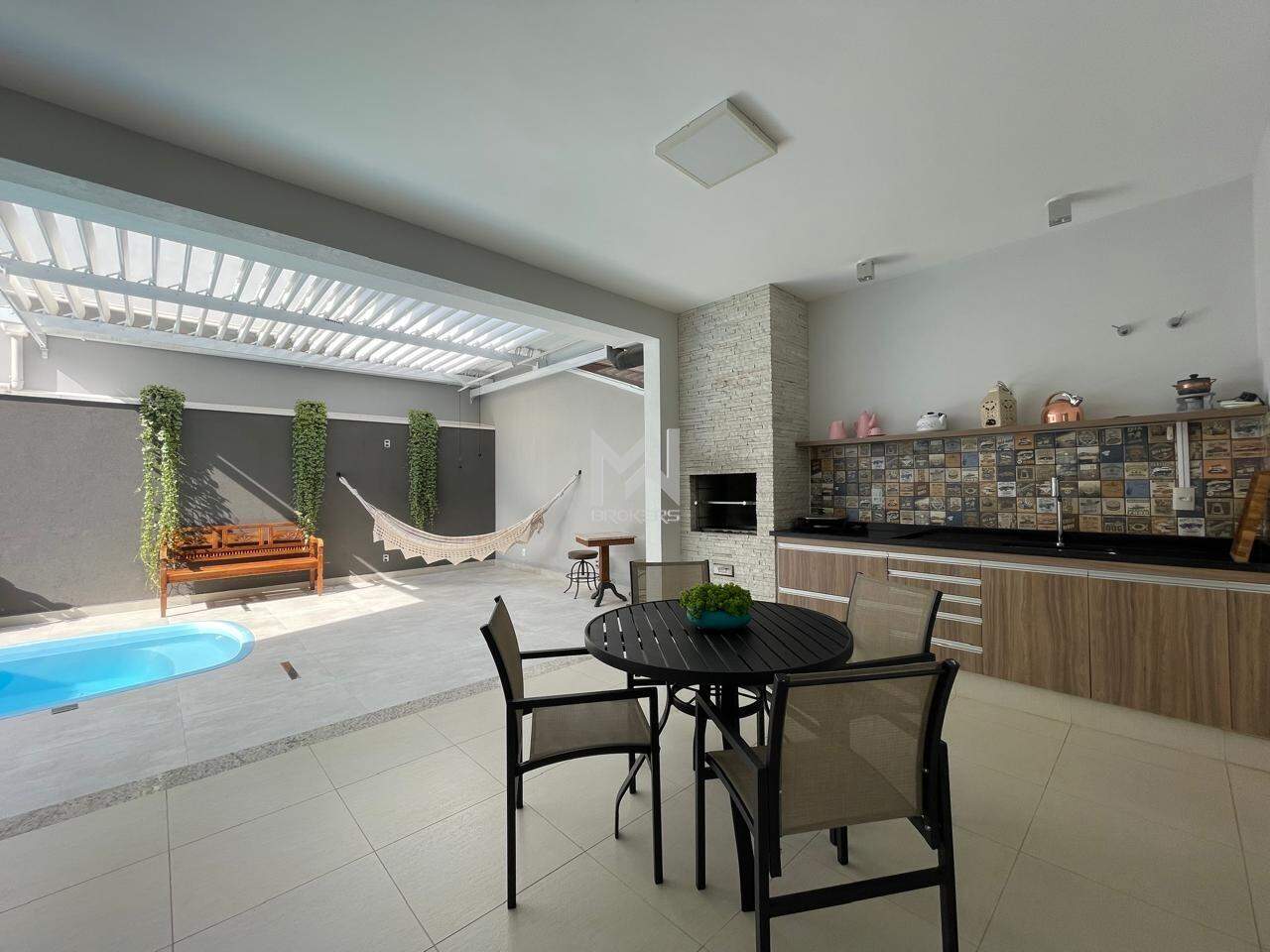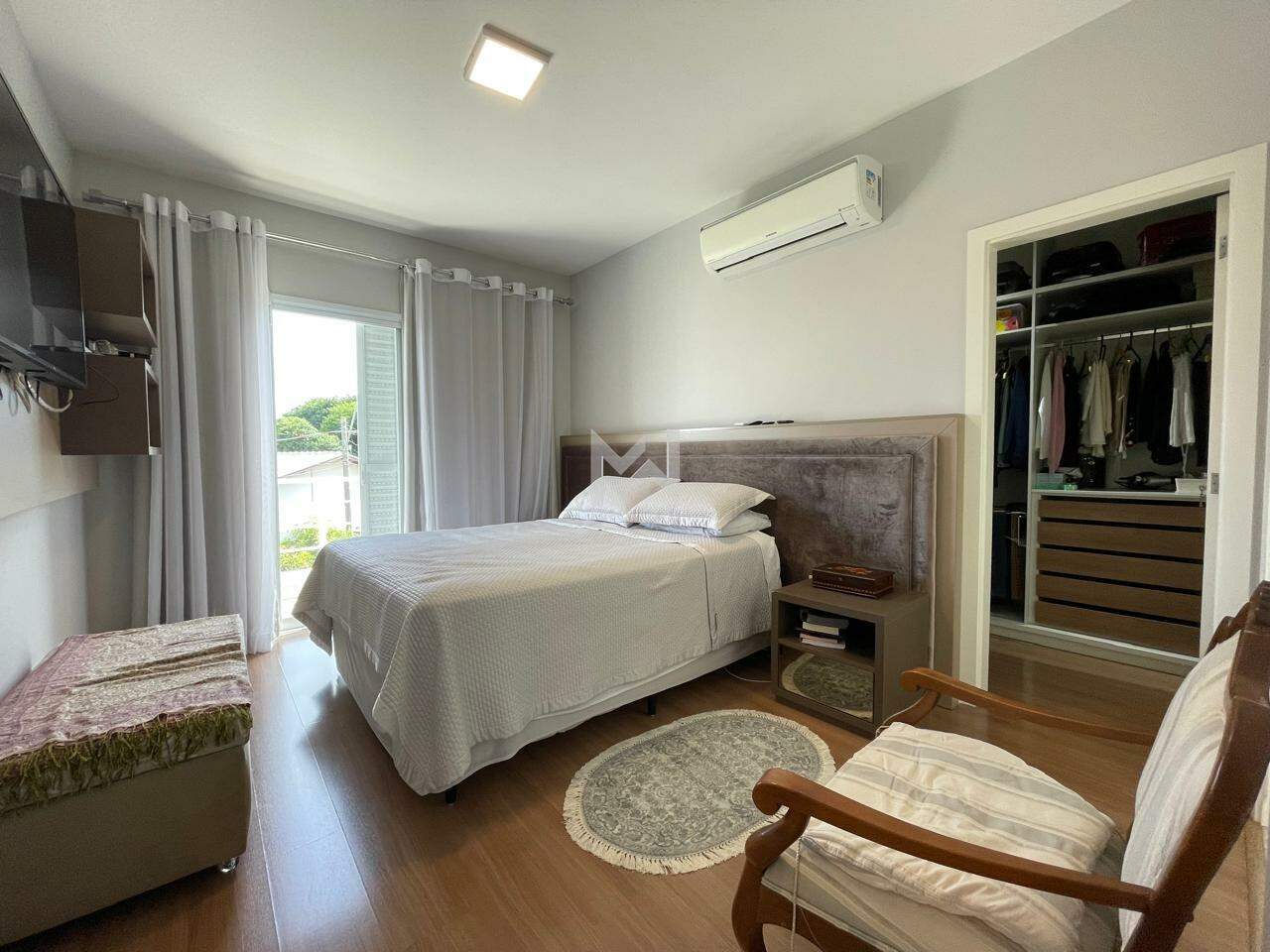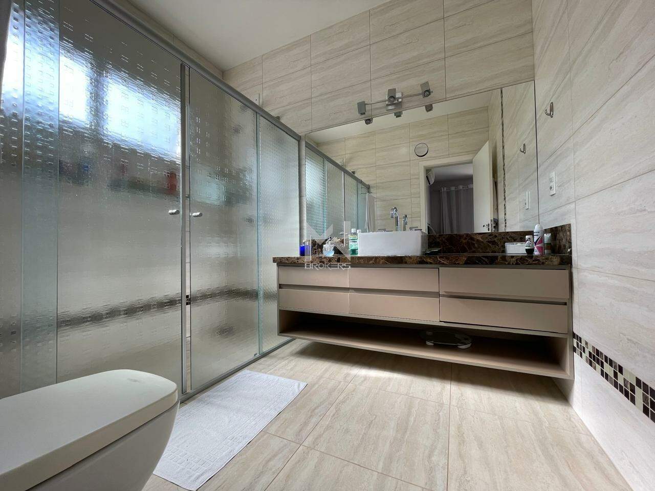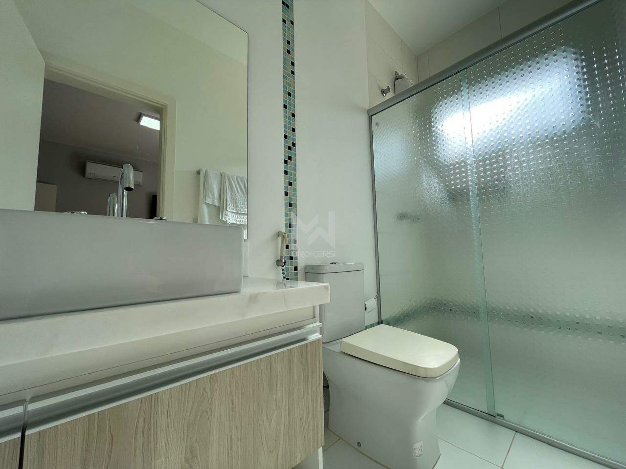 A casa possui três suítes confortáveis, sendo a master com closet e varanda privativa. Um escritório versátil, que também pode ser usado como sala de TV, oferece praticidade para quem trabalha em casa. São cinco banheiros no total, todos com excelente acabamento. O imóvel conta ainda com sistema de aquecimento solar, ar-condicionado instalado em diversos ambientes, energia fotovoltaica e armários planejados em toda a casa. A garagem tem capacidade para até quatro veículos.