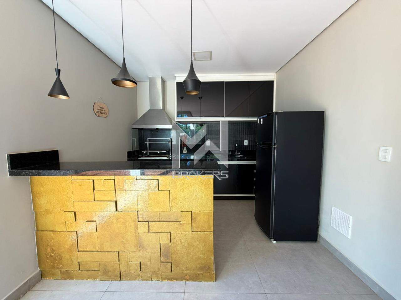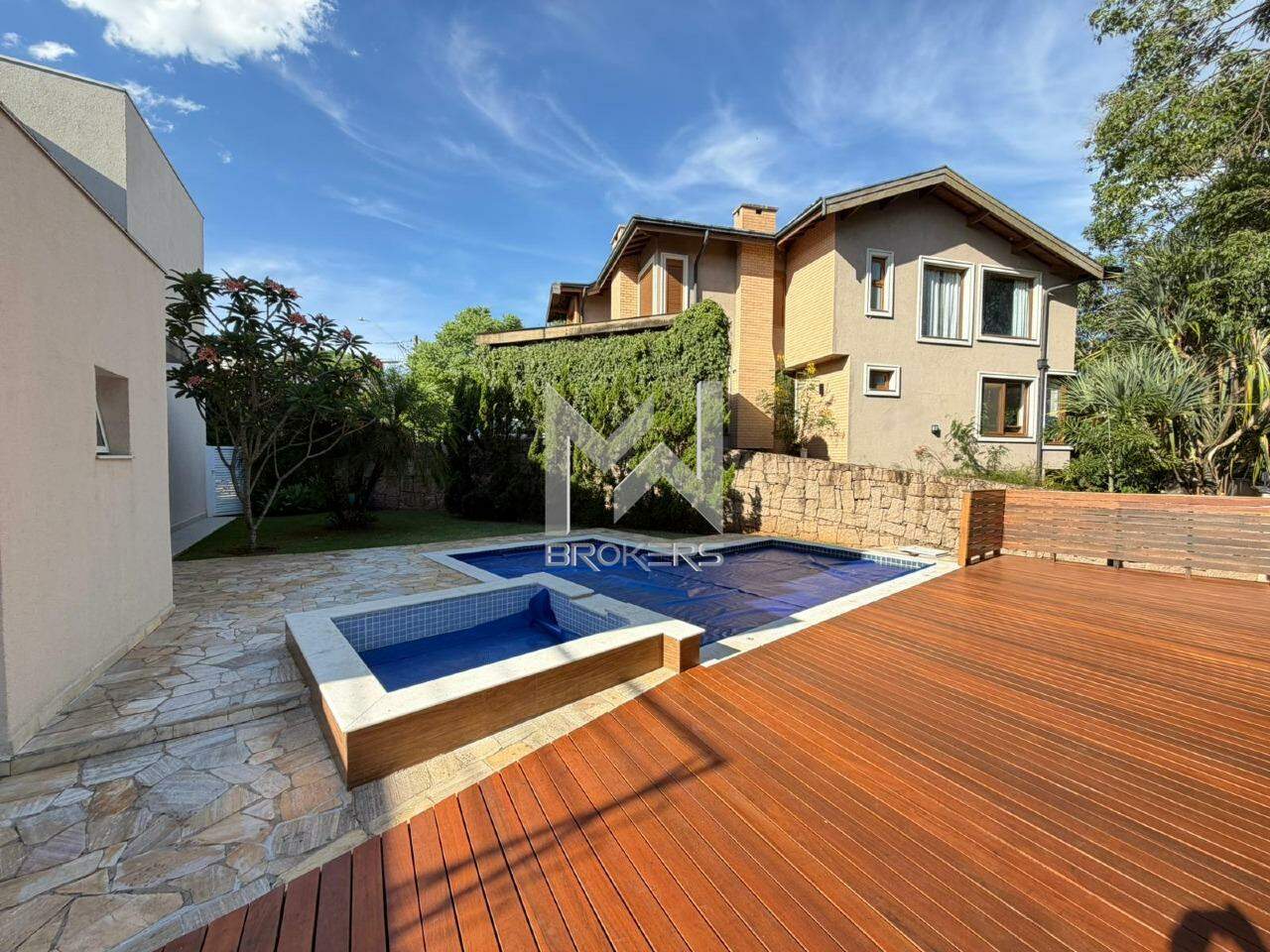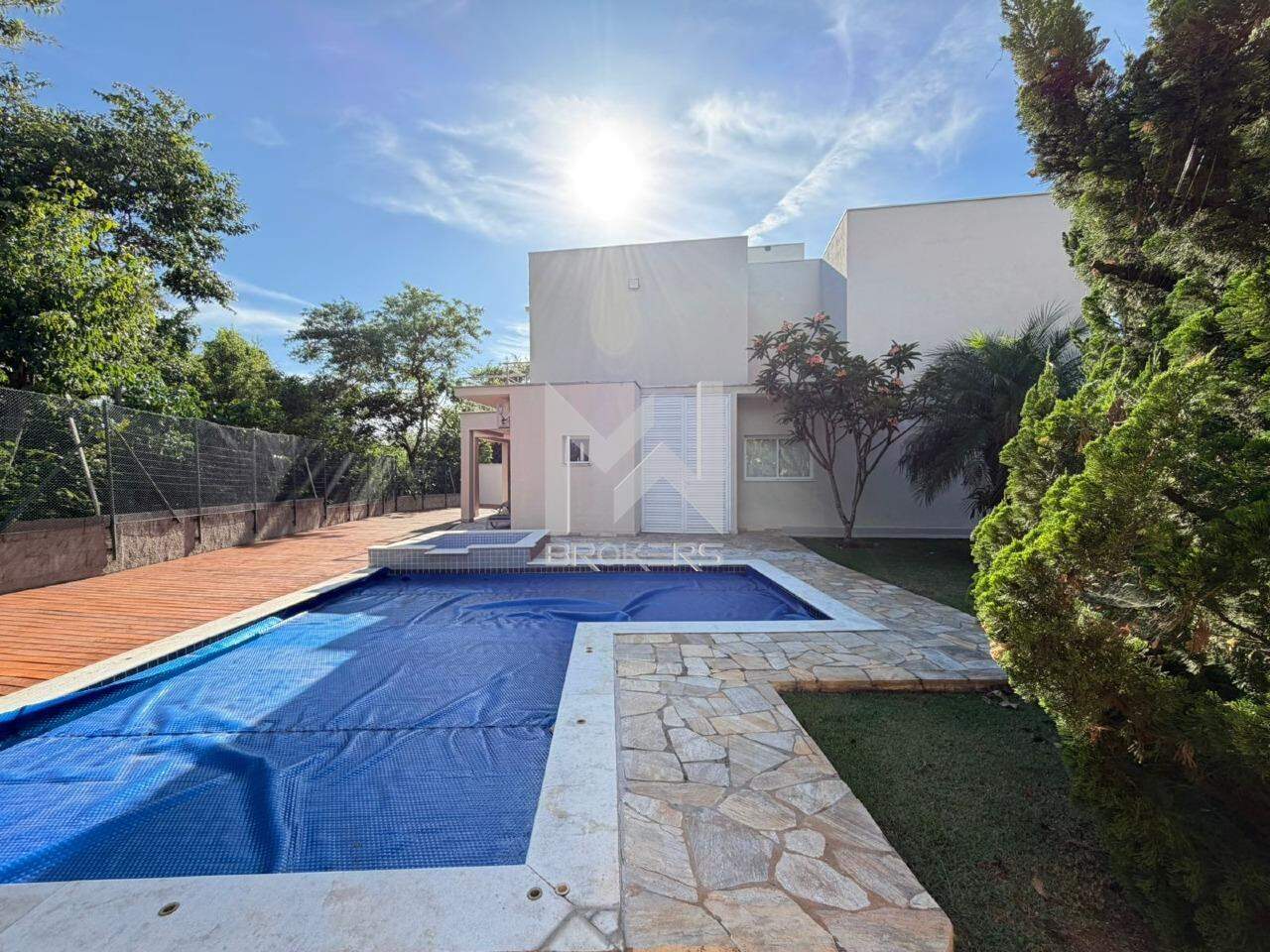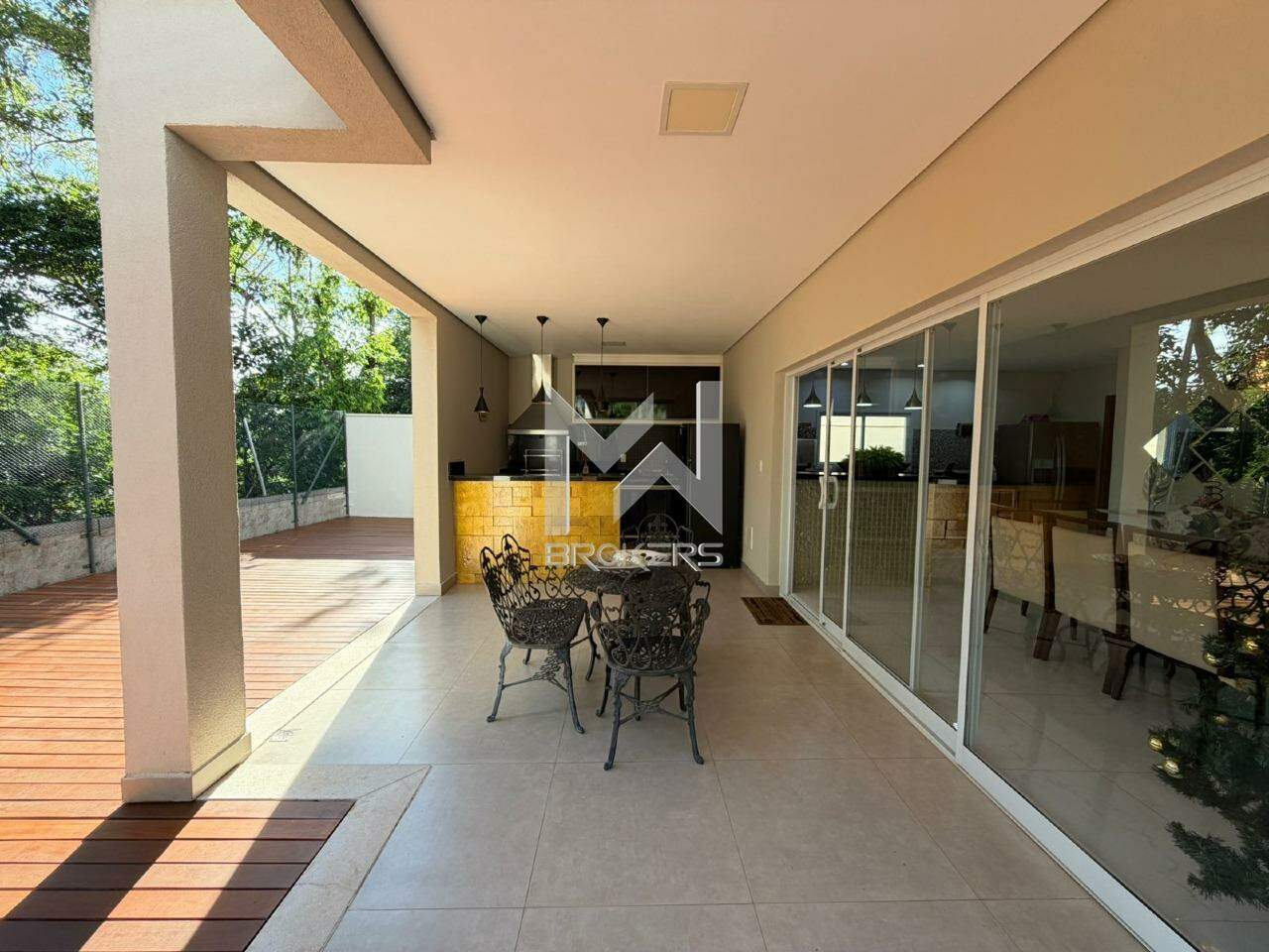 Hall de acesso, lavabo, sala de TV, escritório, salas de estar e de refeições integradas à cozinha, com vista para a mata de preservação permanente, despensa, área de serviços e área externa, ao lado da área de preservação permanente, com área gourmet, piscina aquecida com hidro (solar), depósito e banheiro de apoio.