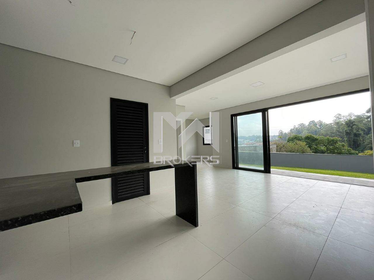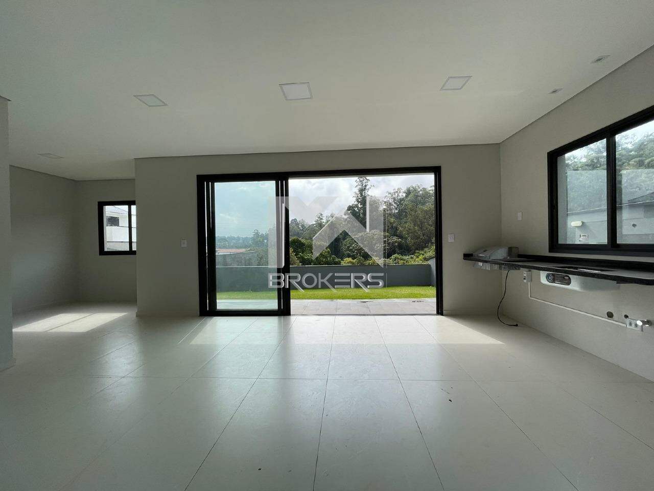 No pavimento inferior, cozinha, varanda gourmet com churrasqueira elétrica e sala de jantar integradas, escritório, lavabo, despensa, área de serviços, amplo espaço gramado e mais 1 banheiro externo