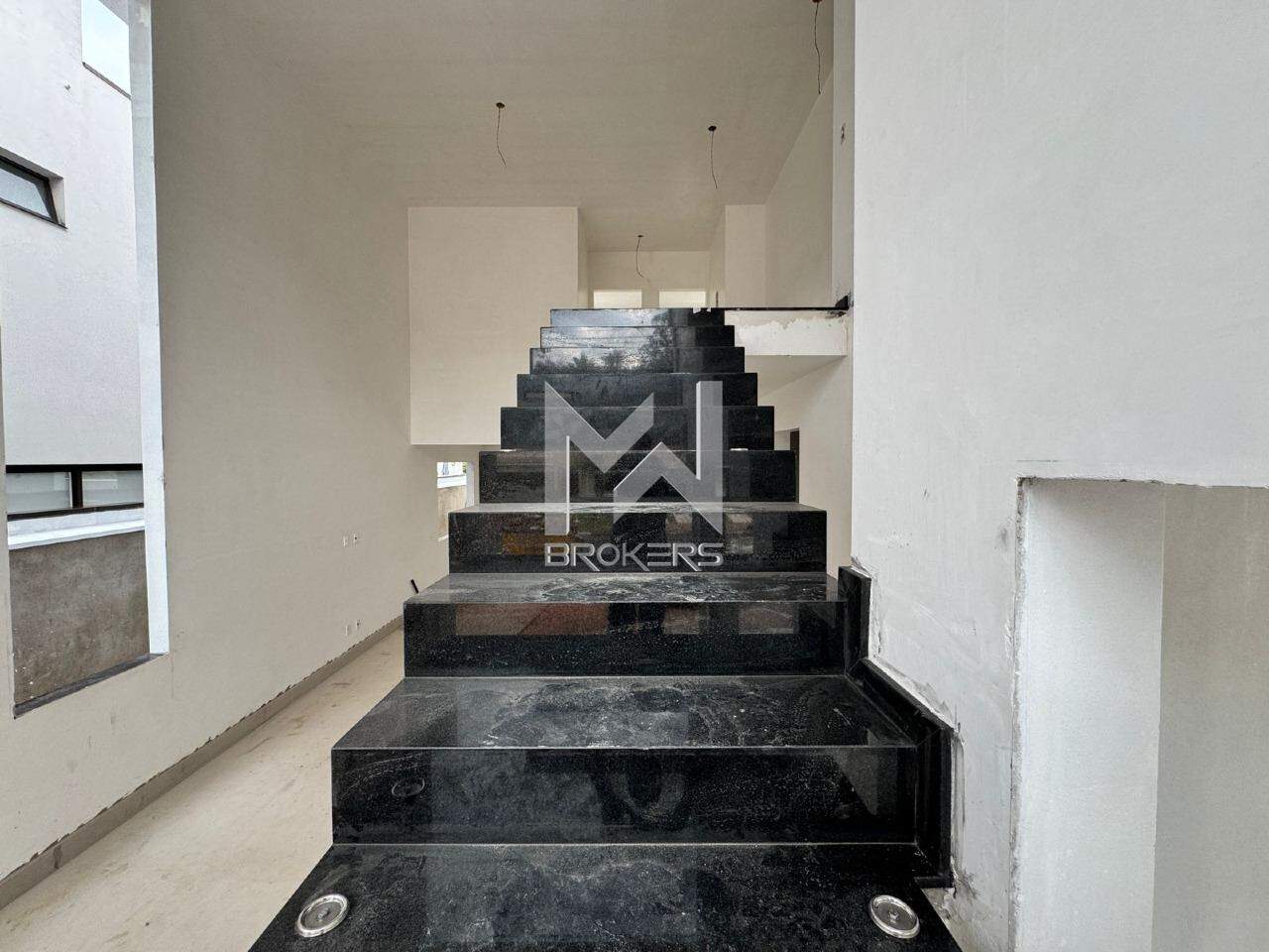 No térreo, a casa conta com sala de estar com pé-direito duplo, sala de jantar, cozinha integrada, escritório, lavabo e lavanderia. A área gourmet será integrada ao living e conta com piscina aquecida por energia solar. A casa possui aquecimento solar com boiler, atendendo também a piscina.