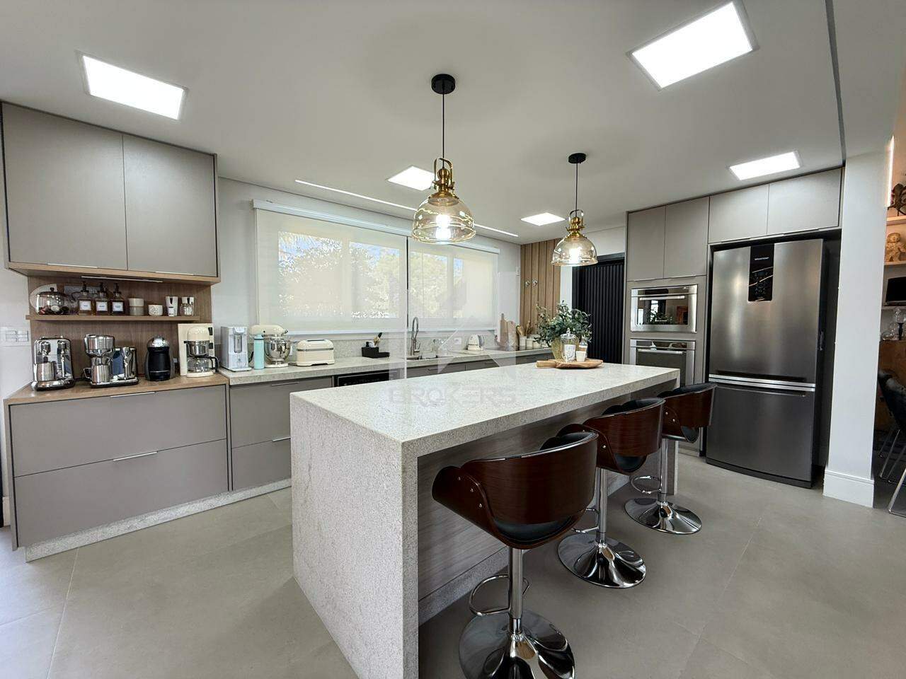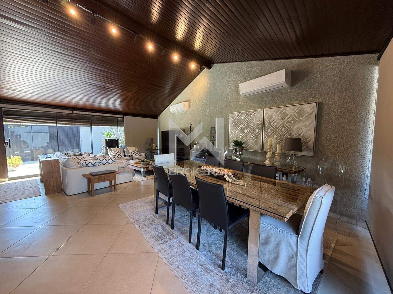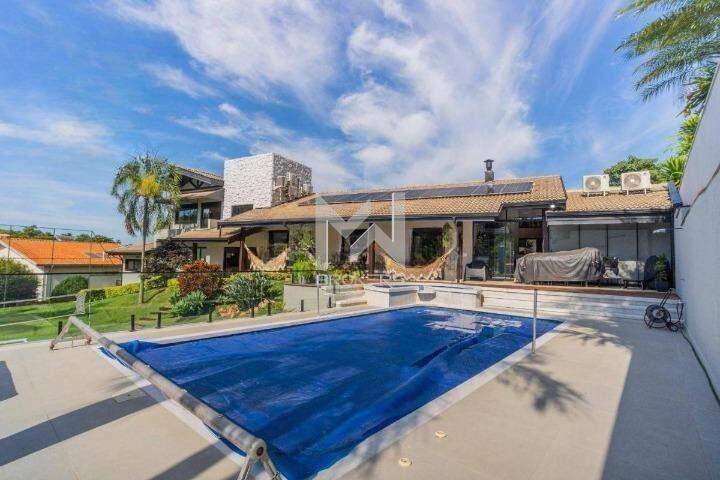 Quintal gramado, piscina aquecida, com cascata e spa e área gourmet com fechamento em vidro, banheiro e vestiário.
