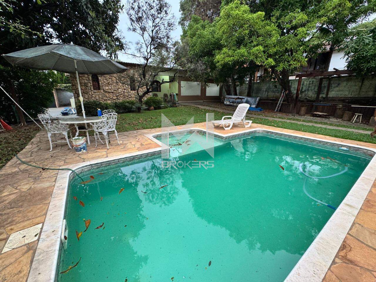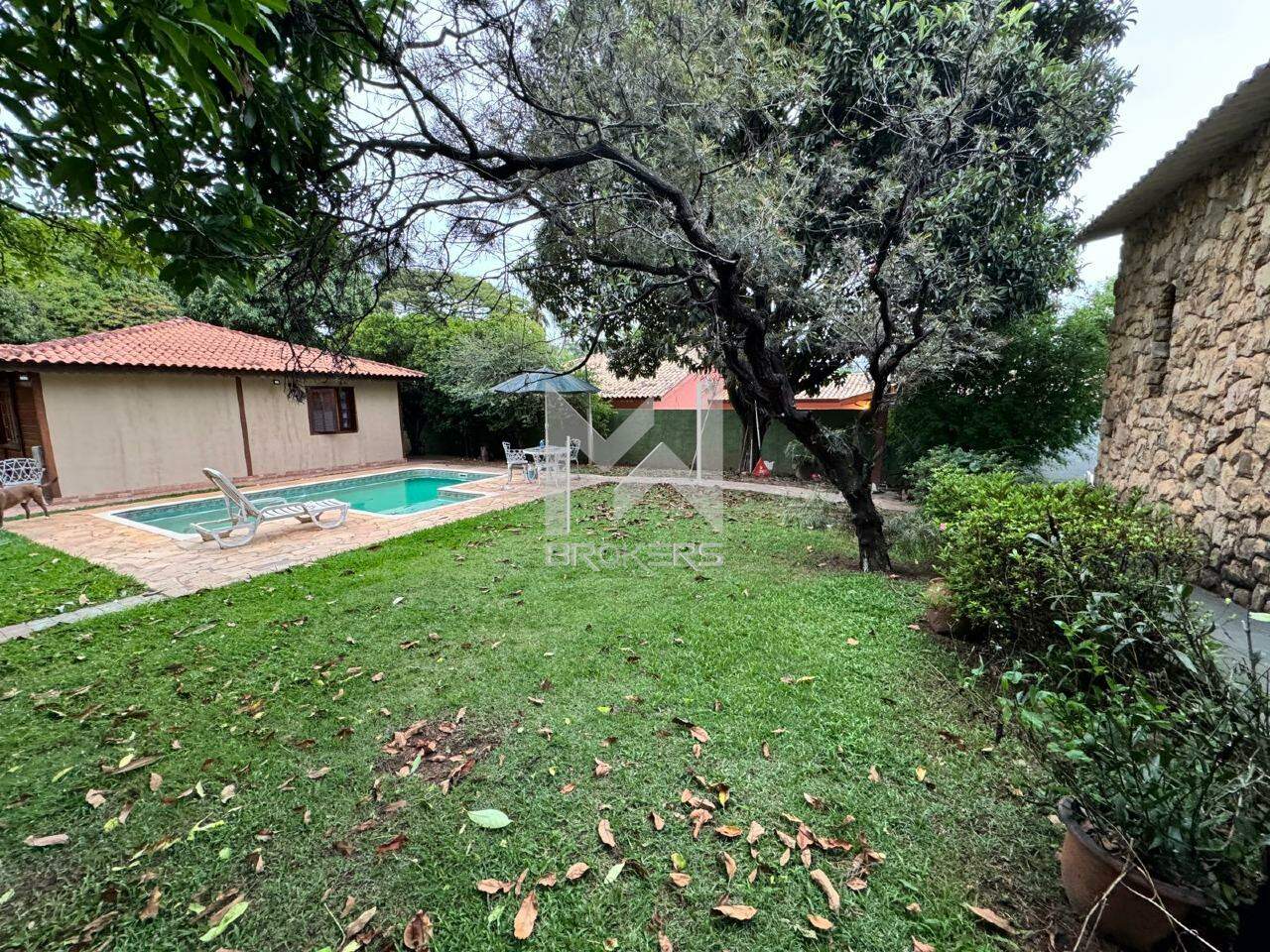 Quintal amplo, gramado, com piscina e pomar.