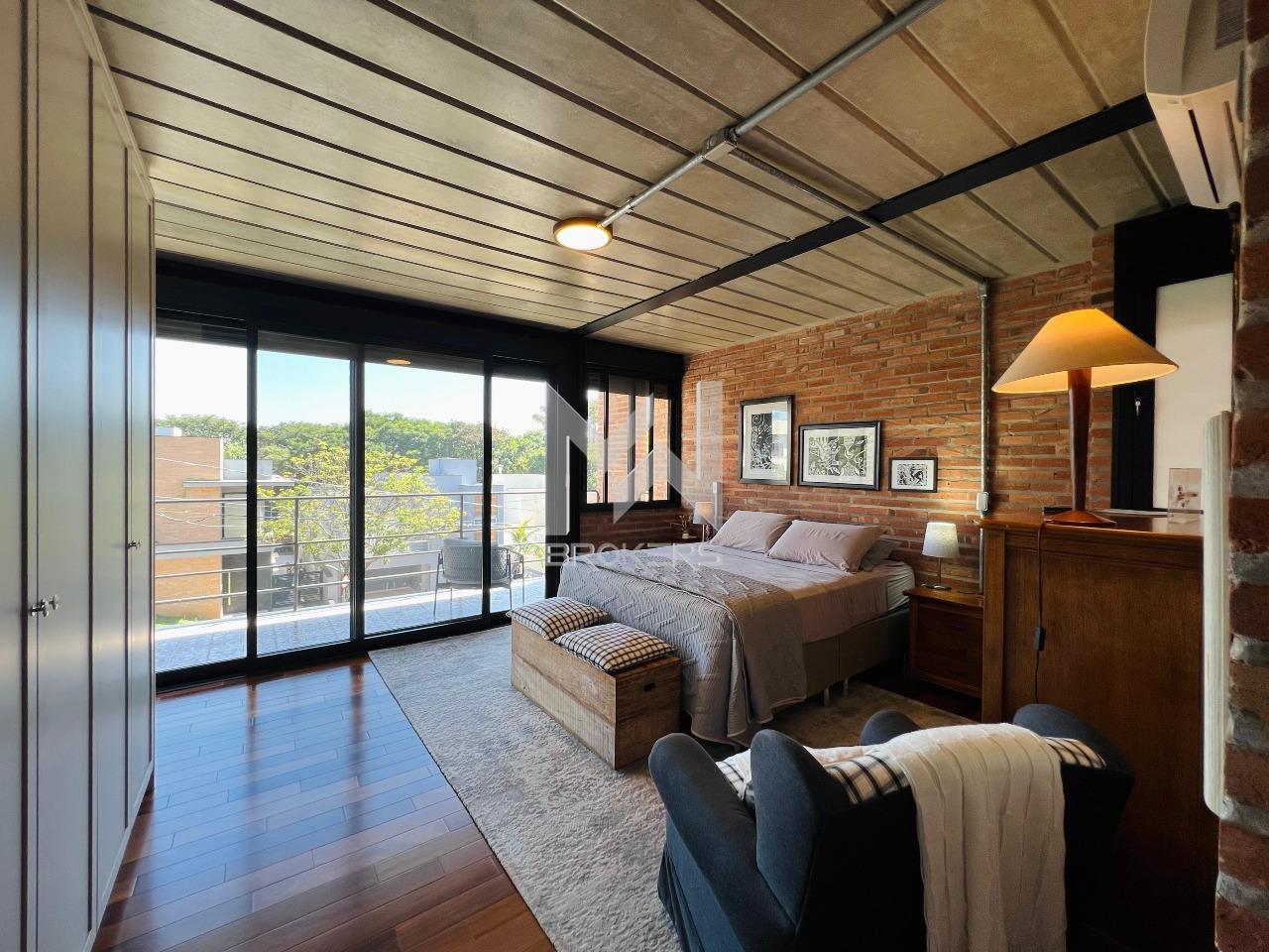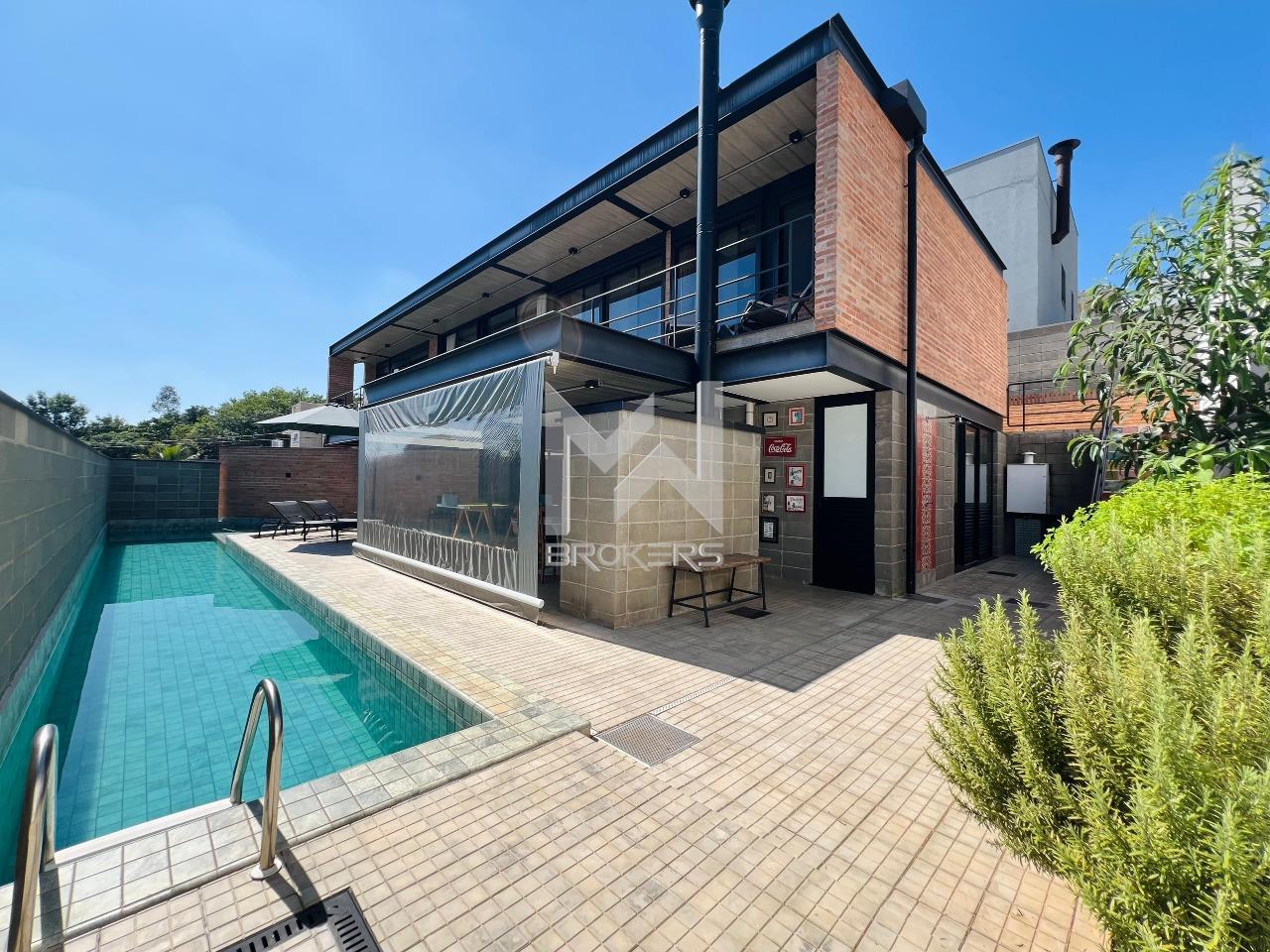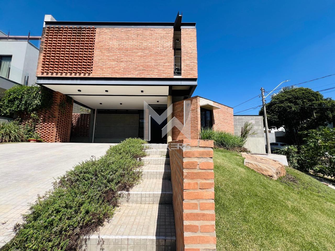 Casa moderna à venda no condomínio Fribourg no Swiss Park, com estrutura de aço, concreto aparente, tijolinho e vidro.
