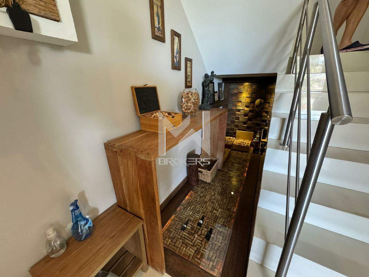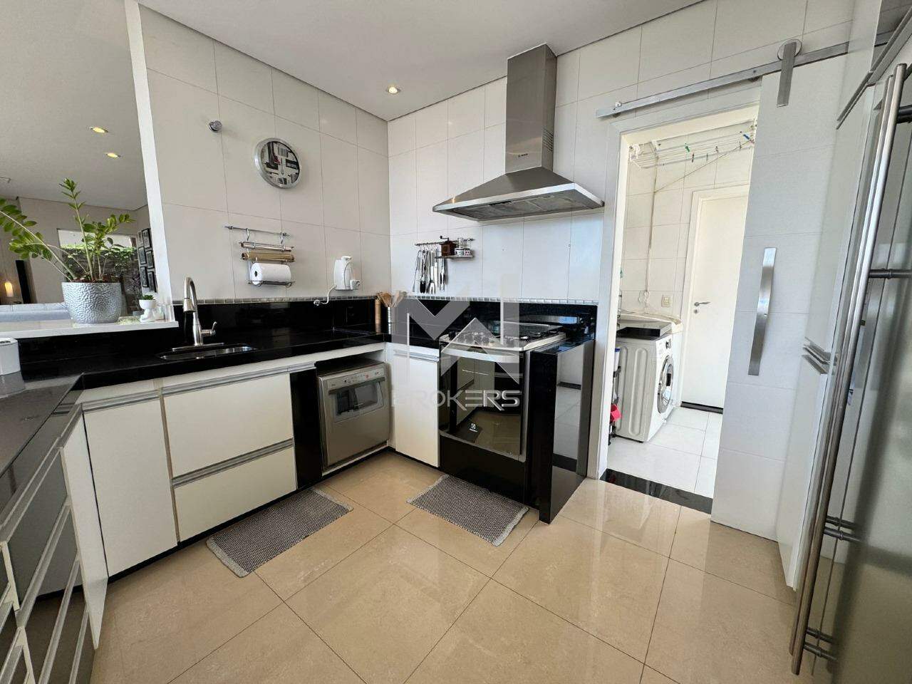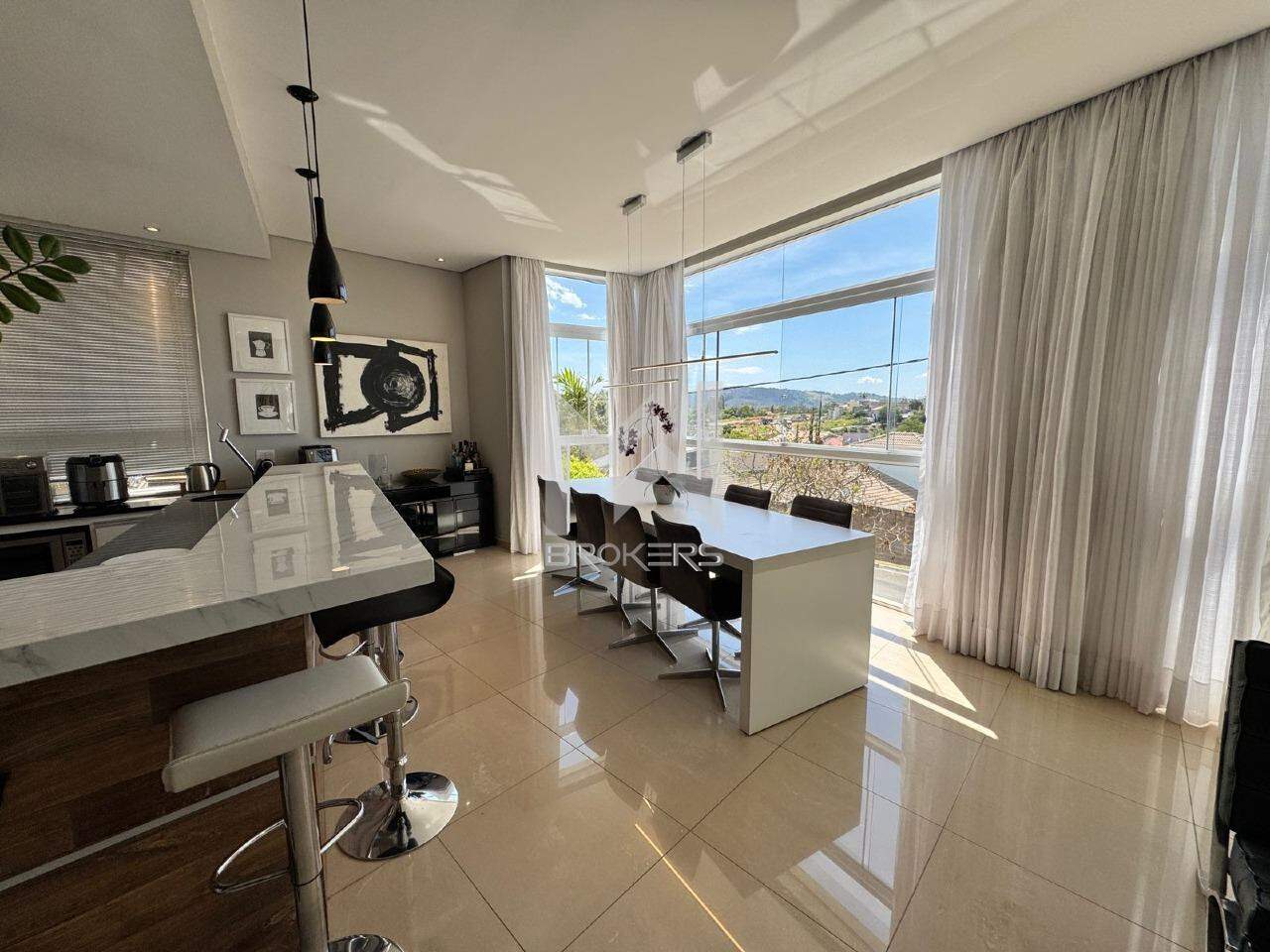 Sala de estar, sala de TV e de refeições integradas, escritório, lavabo, adega, cozinha e área de serviços.