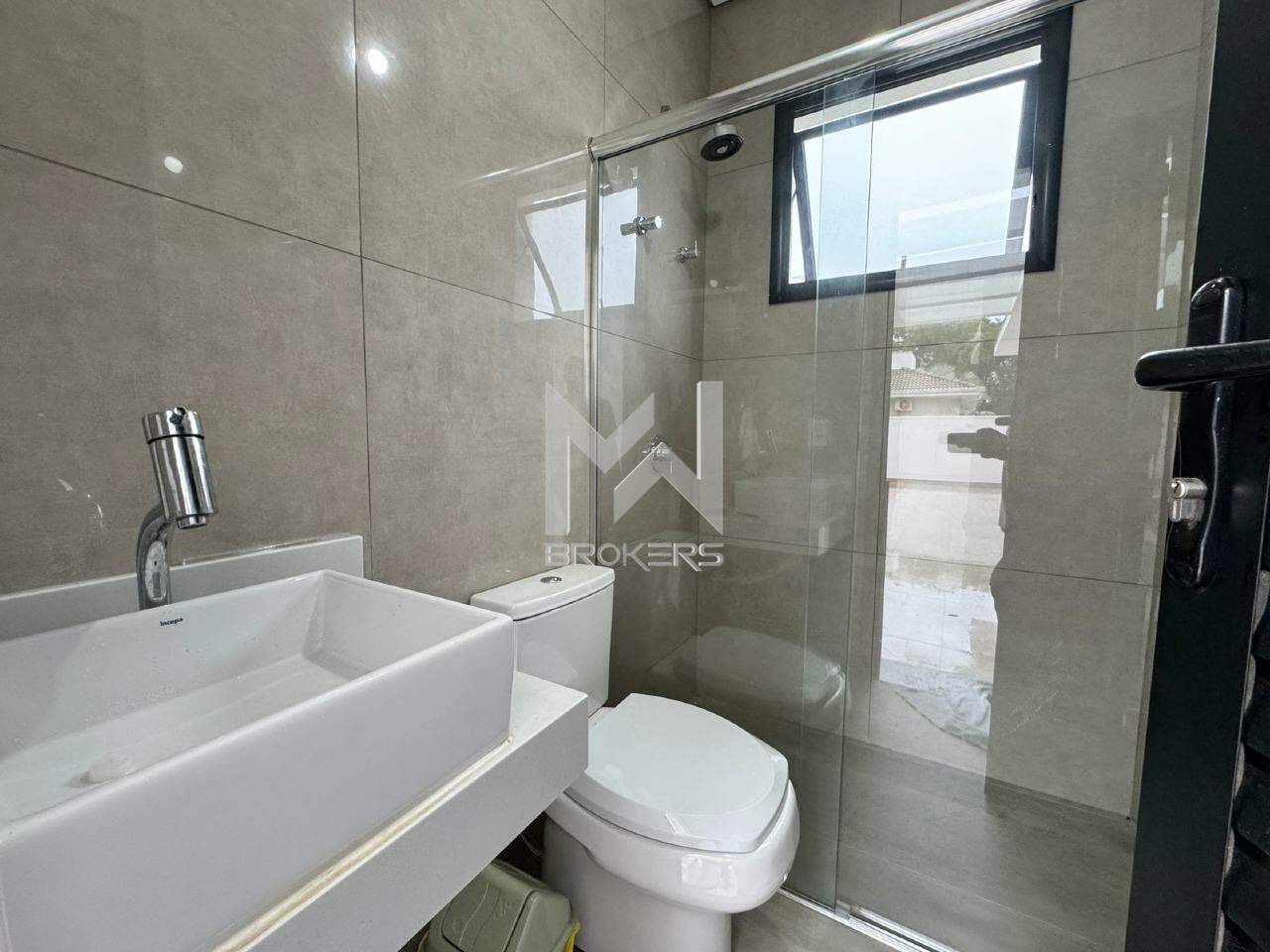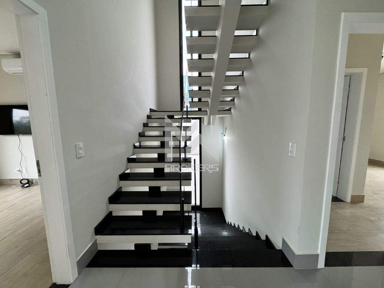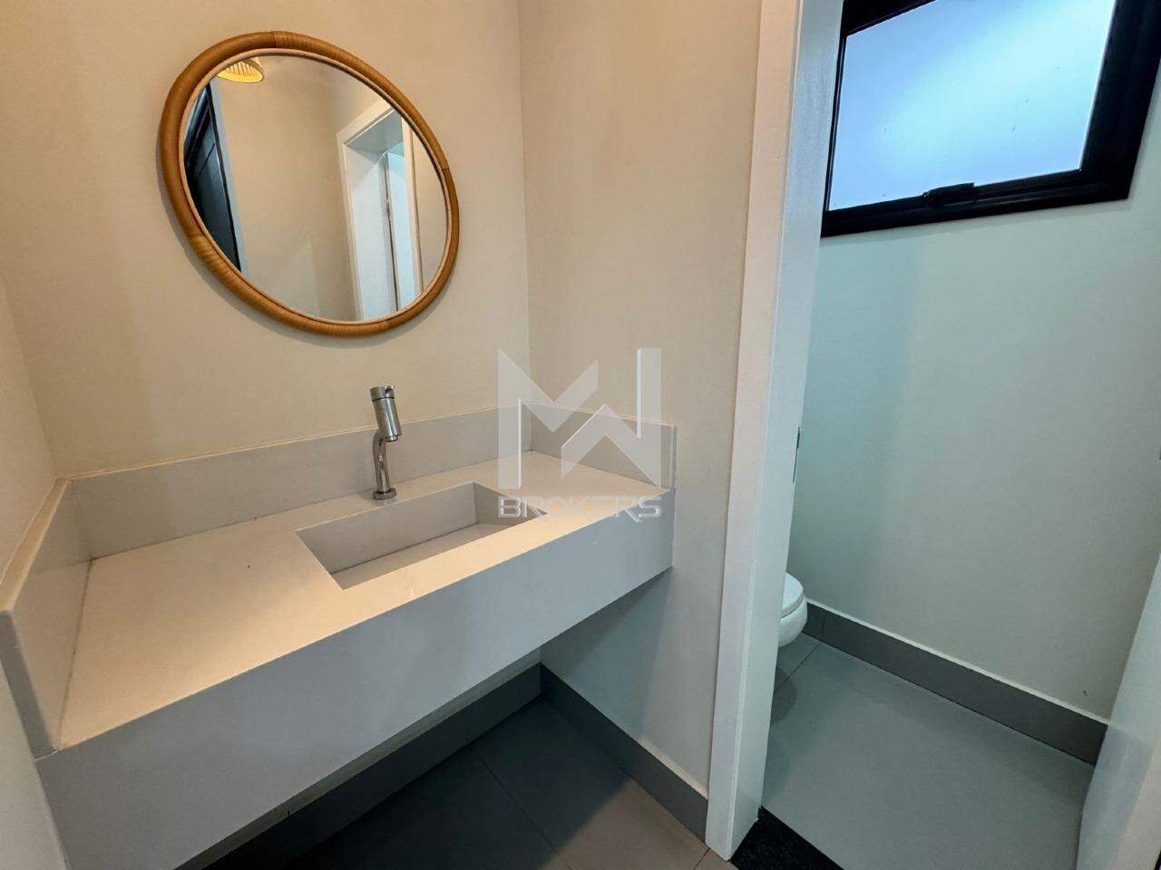 No pavimento térreo, a casa oferece uma suíte espaçosa, equipada com cuba dupla e closet, além de um escritório, que pode ser facilmente revertido em mais uma suíte, conforme a necessidade. As salas de estar e jantar possuem pé-direito alto e são integradas à área gourmet, que conta com churrasqueira e acesso direto à piscina, criando um ambiente funcional para receber e aproveitar momentos de lazer. No térreo também estão o lavabo, cozinha com despensa e lavanderia.