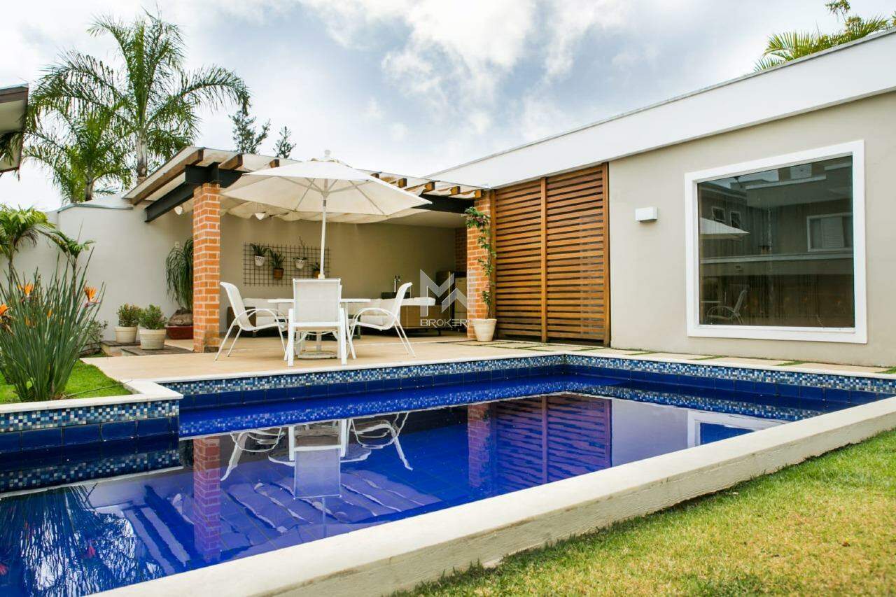 Nos fundos, varanda gourmet com churrasqueira, área gramada, piscina com prainha e edícula com espaço lounge, banheiro de apoio e sauna seca.