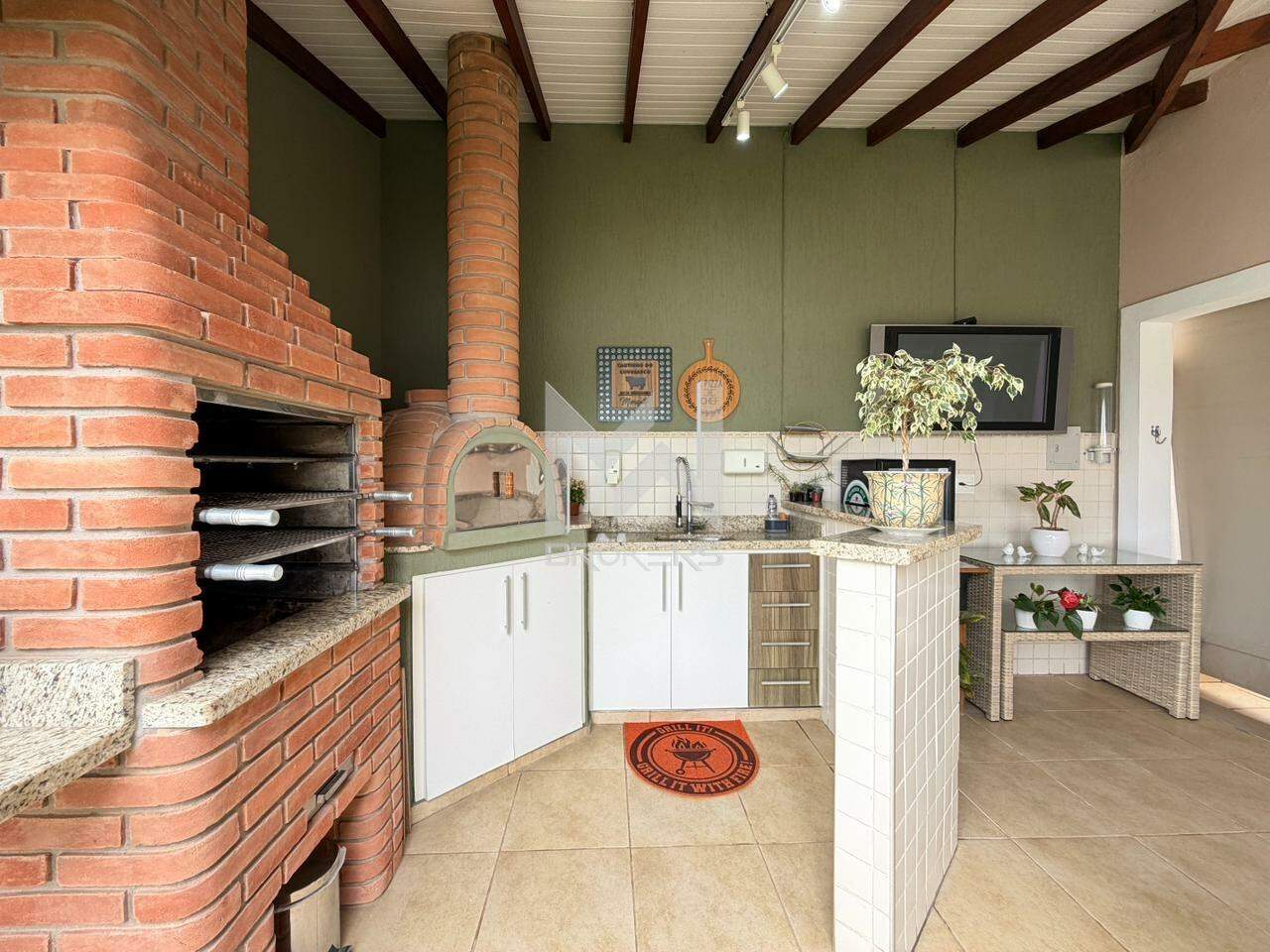 Hall de acesso, sala de TV, banheiro social, sala de estar com lareira integrada à sala de refeições, cozinha com copa, despensa, área de serviços e quintal. Área gourmet com churrasqueira, forno de pizza à lenha, banheiro de apoio, escritório externo e espaço de descanso.