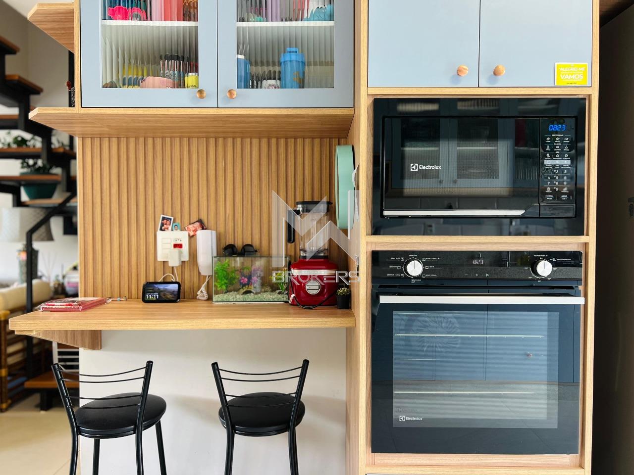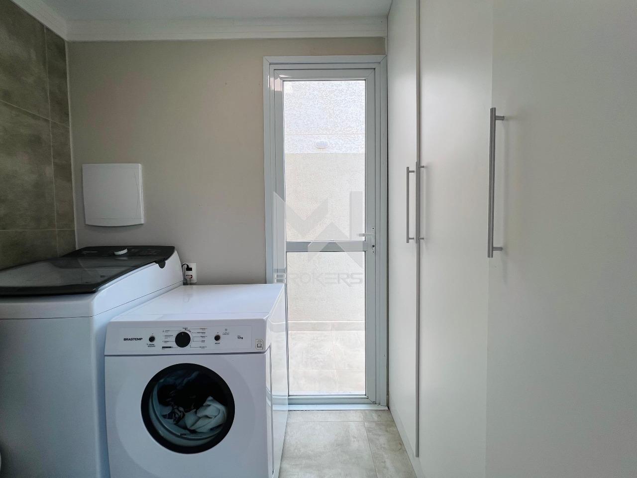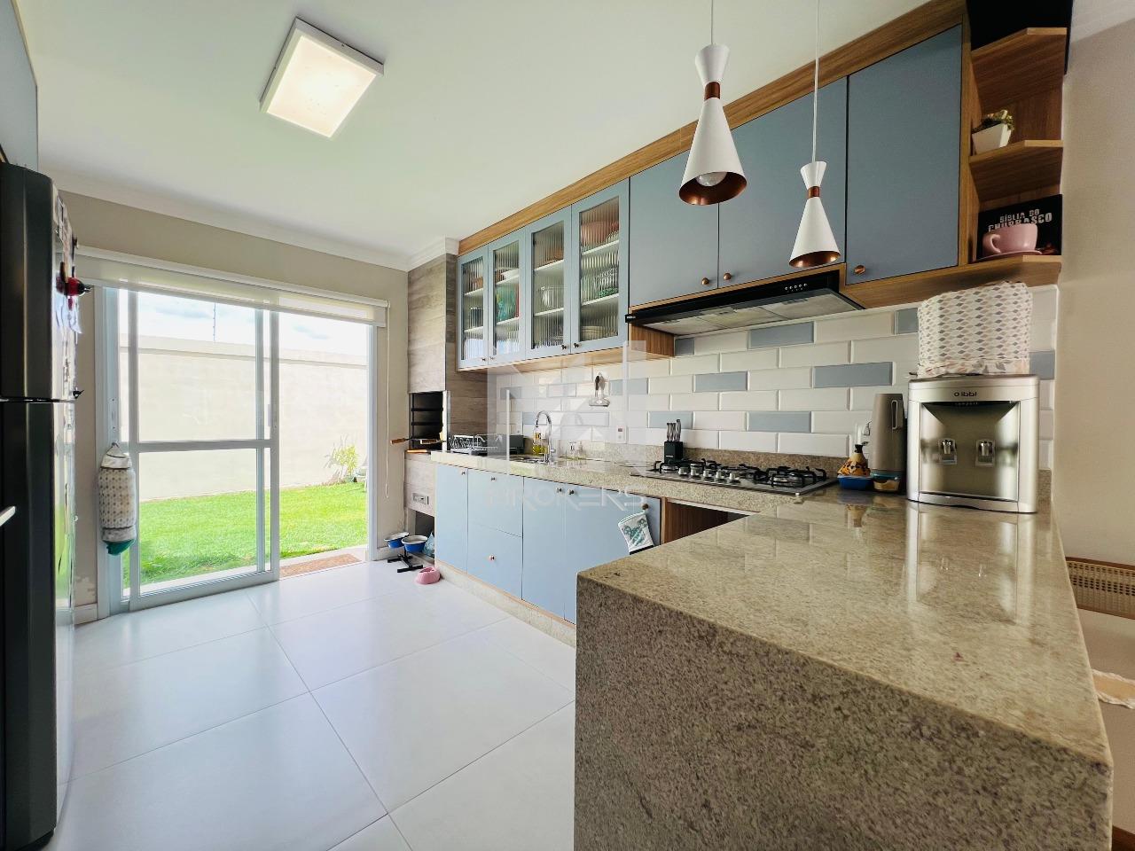 Salas de estar e jantar integradas, lavabo, cozinha em conceito aberto repleta de planejados, com balcão para refeições rápidas, torre quente, cooktop, coifa, lixo embutido na pia, churrasqueira integrada com porta balcão permitindo acesso ao amplo quintal gramado e lavanderia.