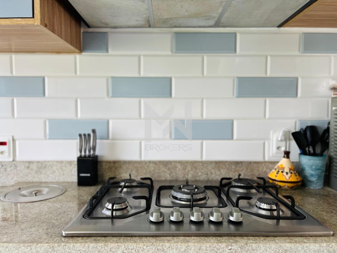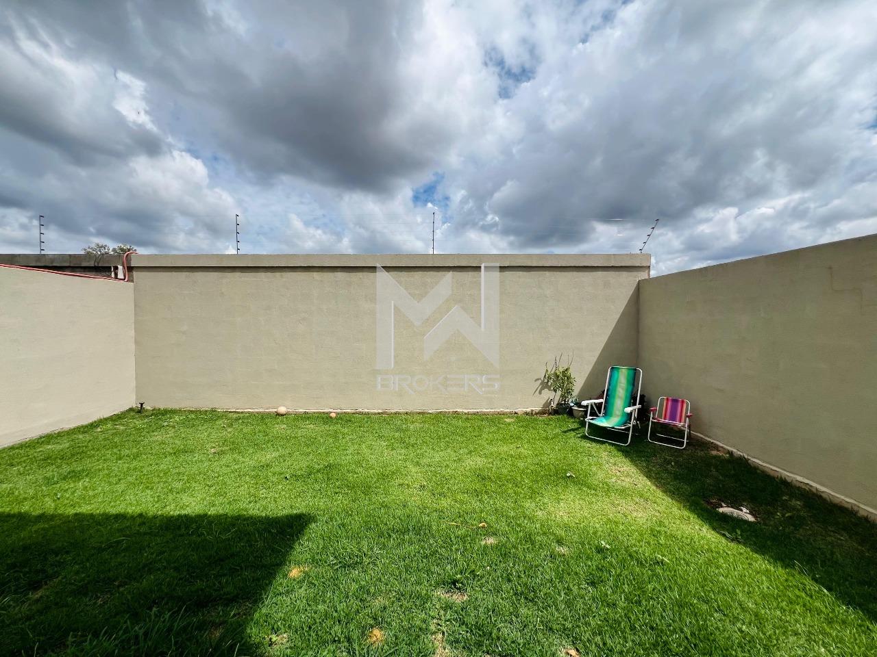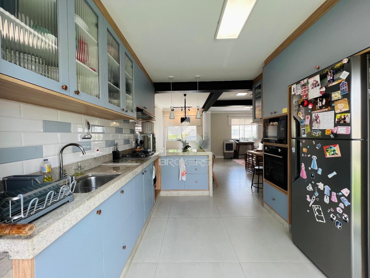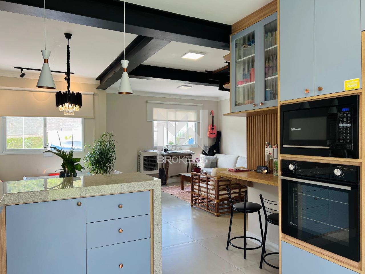 Salas de estar e jantar integradas, lavabo, cozinha em conceito aberto repleta de planejados, com balcão para refeições rápidas, torre quente, cooktop, coifa, lixo embutido na pia, churrasqueira integrada com porta balcão permitindo acesso ao amplo quintal gramado e lavanderia.