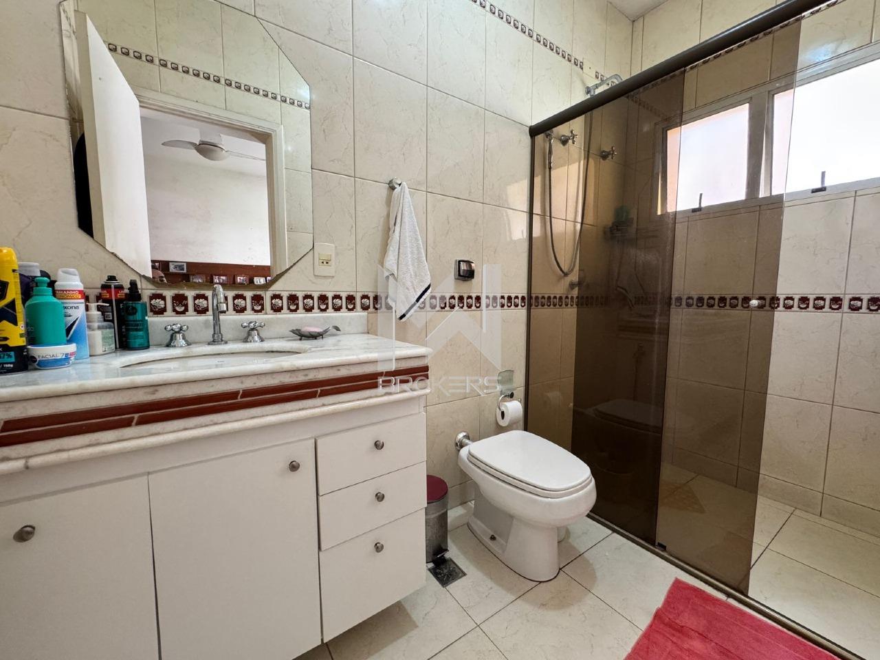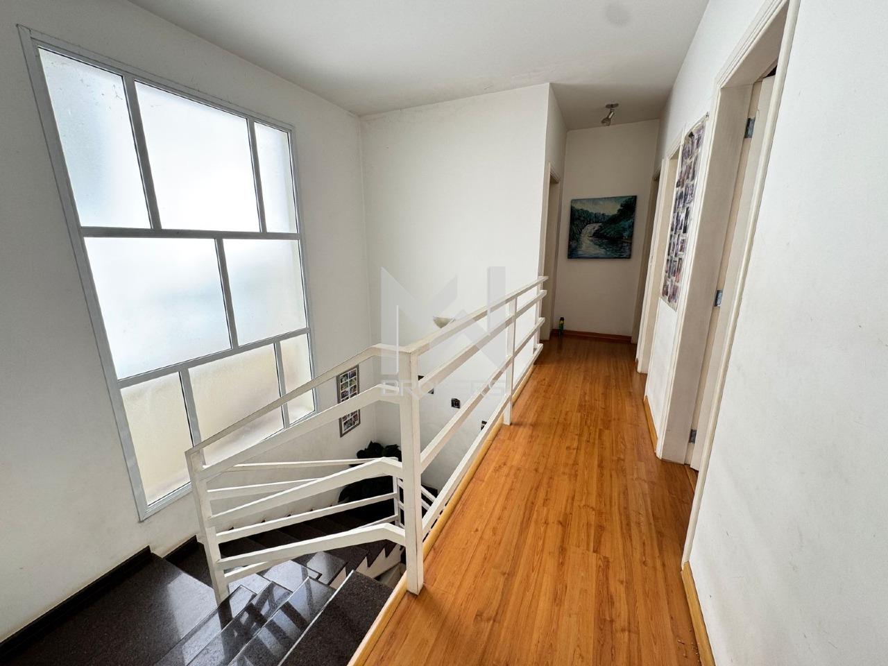 No pavimento superior: 3 dormitórios, sendo 1 suíte, sala de TV com varanda e banheiro de apoio para os demais quartos.
