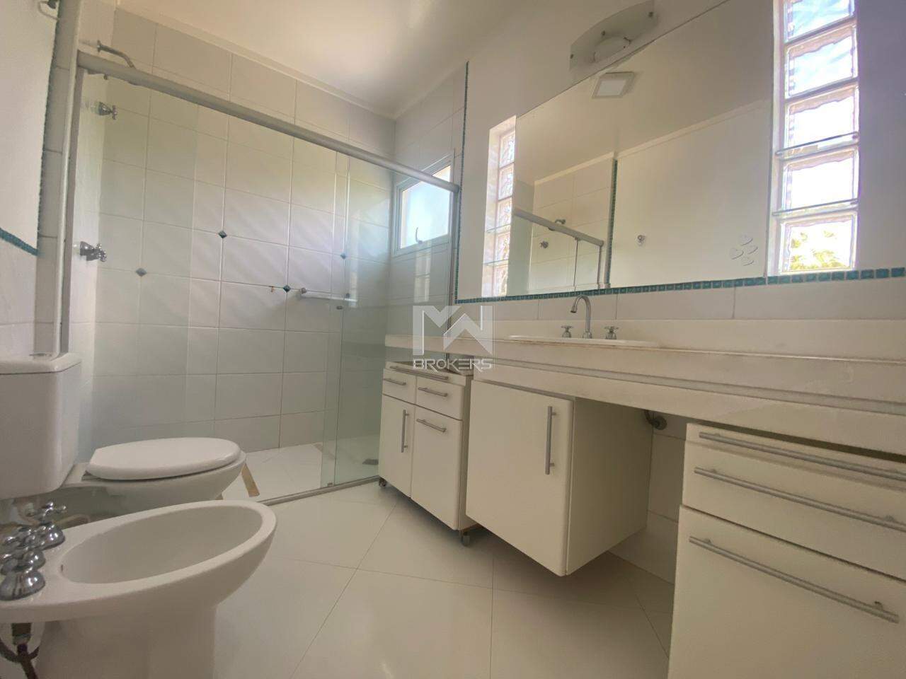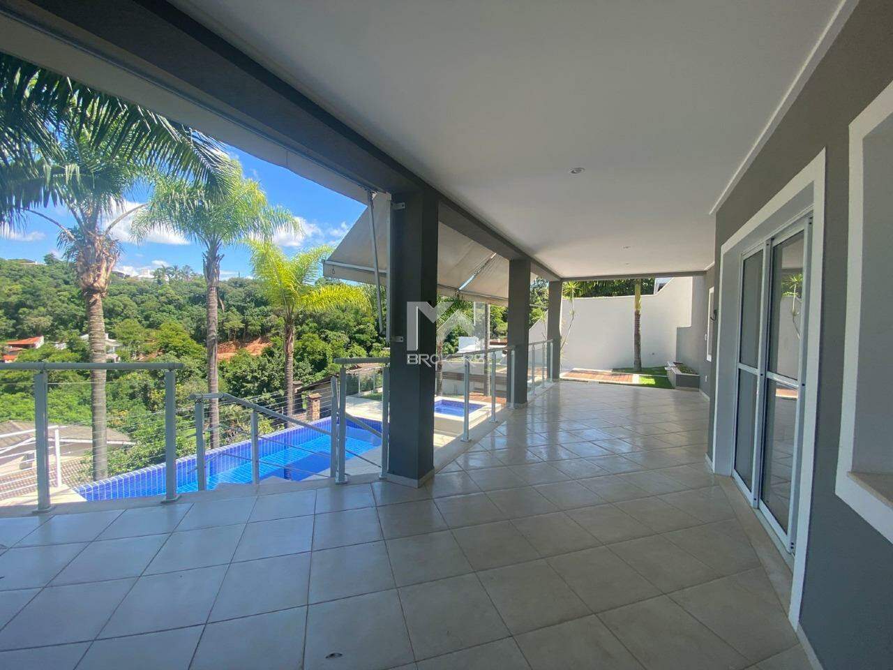 No pavimento inferior, sala dois ambientes com lareira, sala de TV com banheiro, varanda gourmet com vista para a área de preservação permanente, dormitório de doméstica com banheiro e depósito, piscina e hidro.