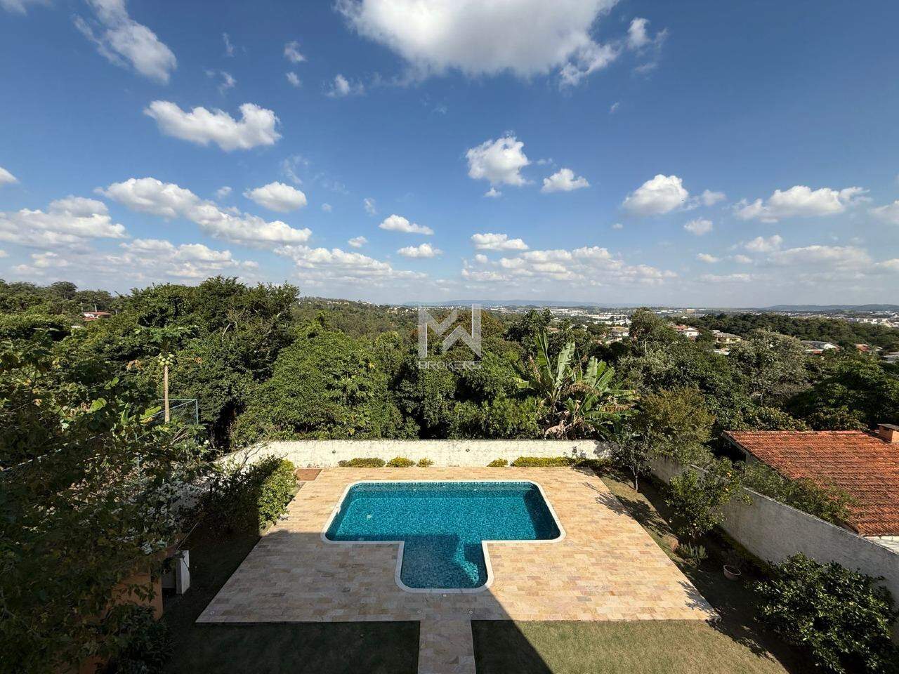 Sala 02 ambientes: estar e refeições e sala de TV com varanda com vista para a piscina e área verde de proteção permanente. Ao lado temos um lavabo, cozinha com despensa e copa e área de serviços com entrada de serviços.