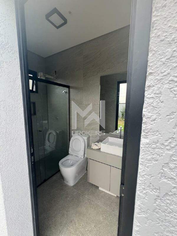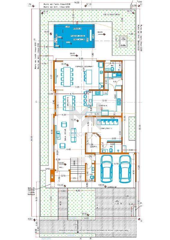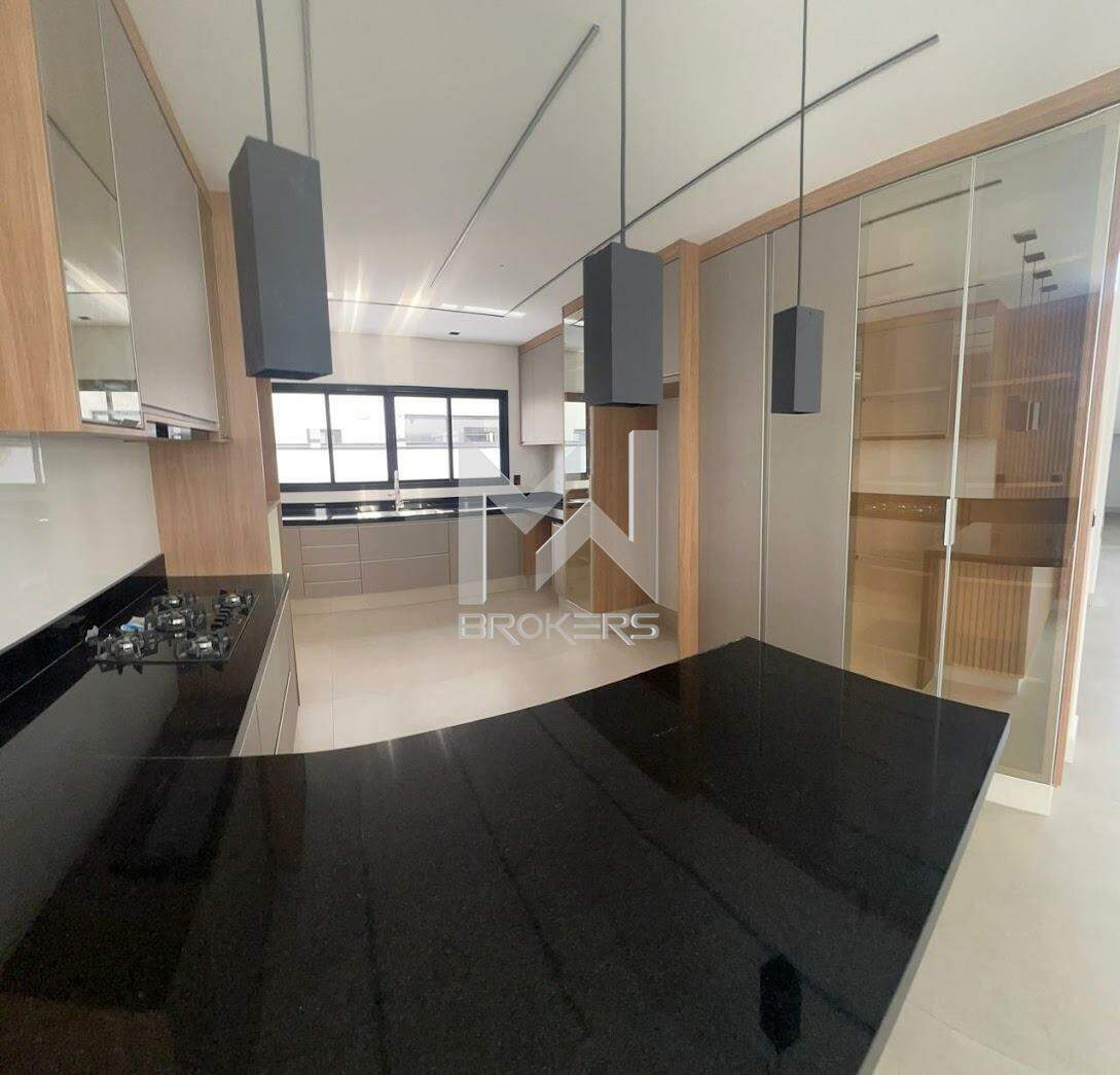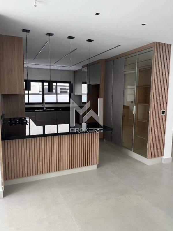 Hall interno, sala de estar com pé direito duplo (31m²), sala de refeições, home reversível em suíte no térreo, banheiro, escritório, lavabo, cozinha integrada ao gourmet separados com porta deslizante de vidro - com cooktop e coifa, área de serviços com pedra, tanque de inox embutido e móveis planejados e banheiro de apoio.