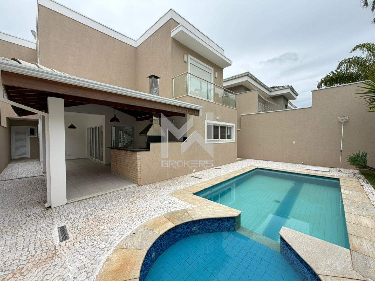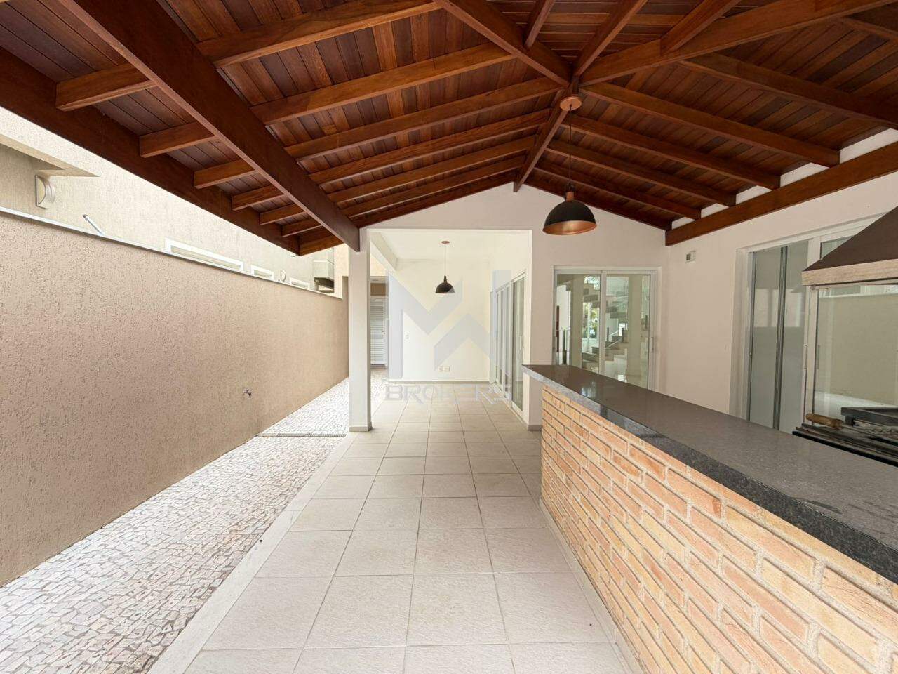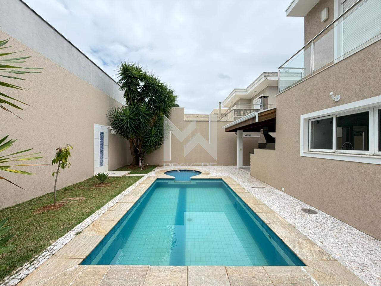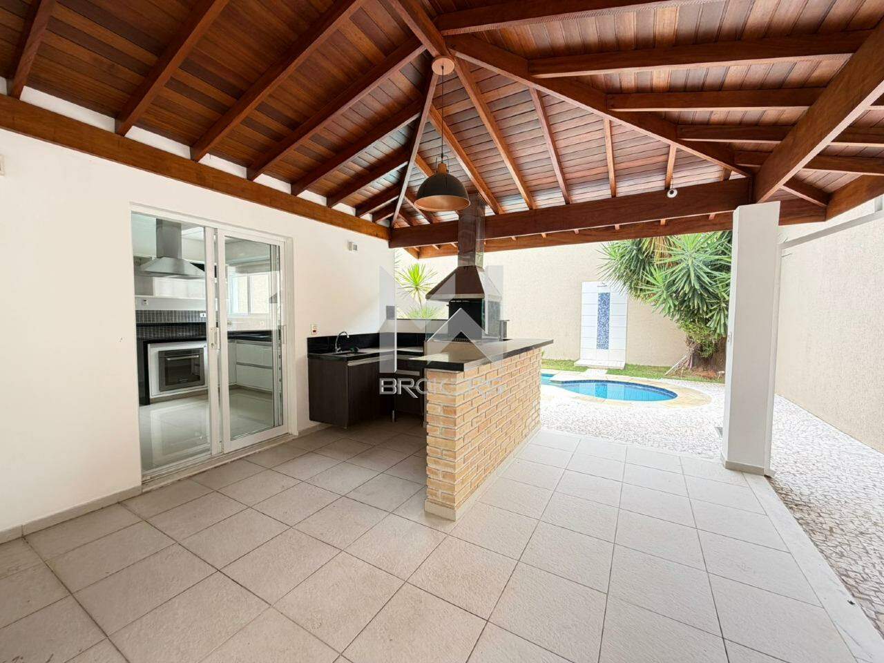 Sala de estar, sala de TV e sala de refeições integradas, lavabo, cozinha com cooktop de indução, área de serviços e área gourmet com churrasqueira integrada ao quintal com gramado, piscina (não aquecida) e depósito.