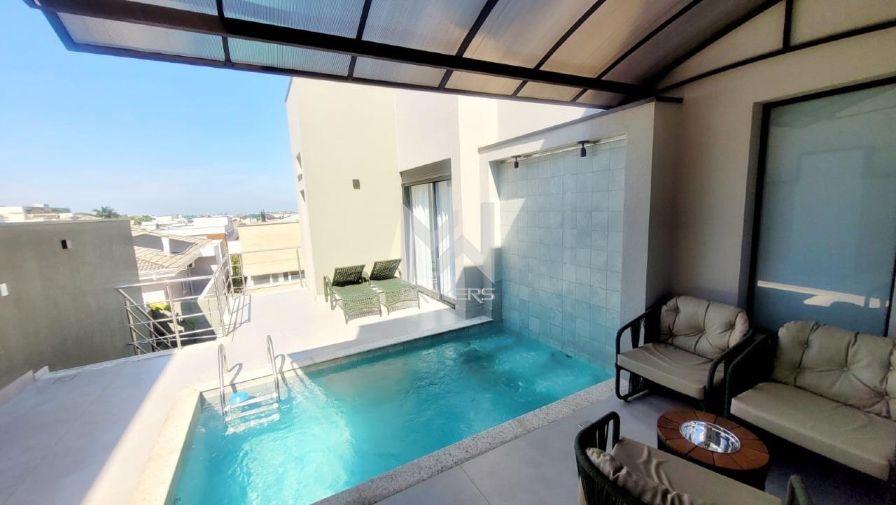 Salas de estar e de refeições integradas, lavabo, cozinha com despensa, área de serviços, área gourmet com churrasqueira à gás e quintal com piscina e banheiro de apoio.