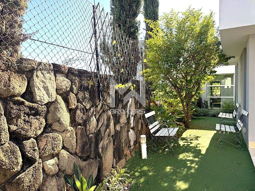 No pavimento inferior, quintal com piscina aquecida com banheiro de apoio, área gourmet com churrasqueira e forno de pizza e ampla cozinha. Possui oficina nos fundos e algumas árvores frutíferas (romã, amora, jabuticaba e acerola). Área de serviços e despensa com entrada independente acessando a cozinha.