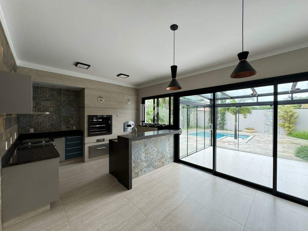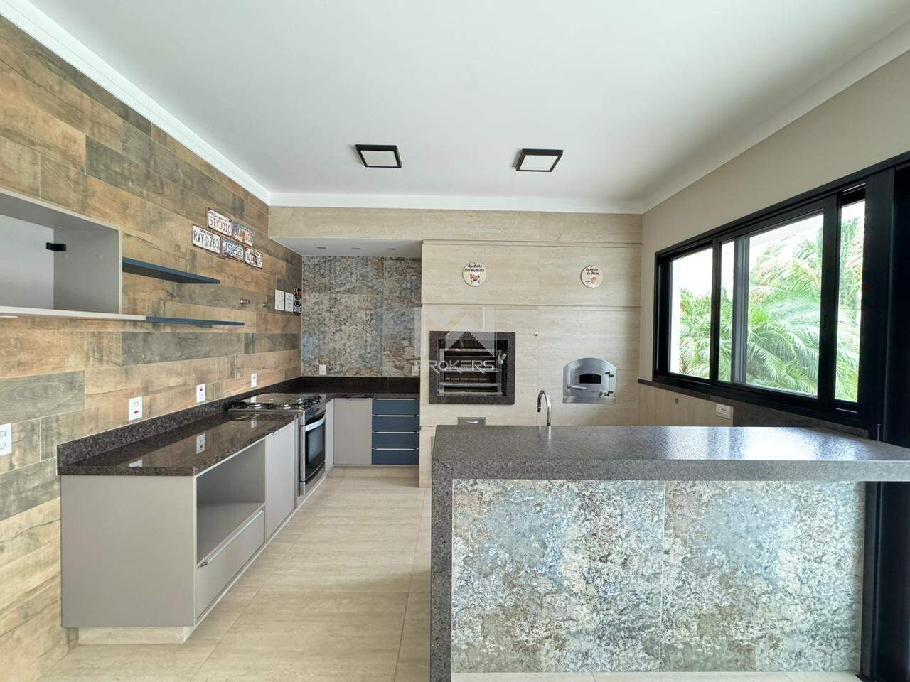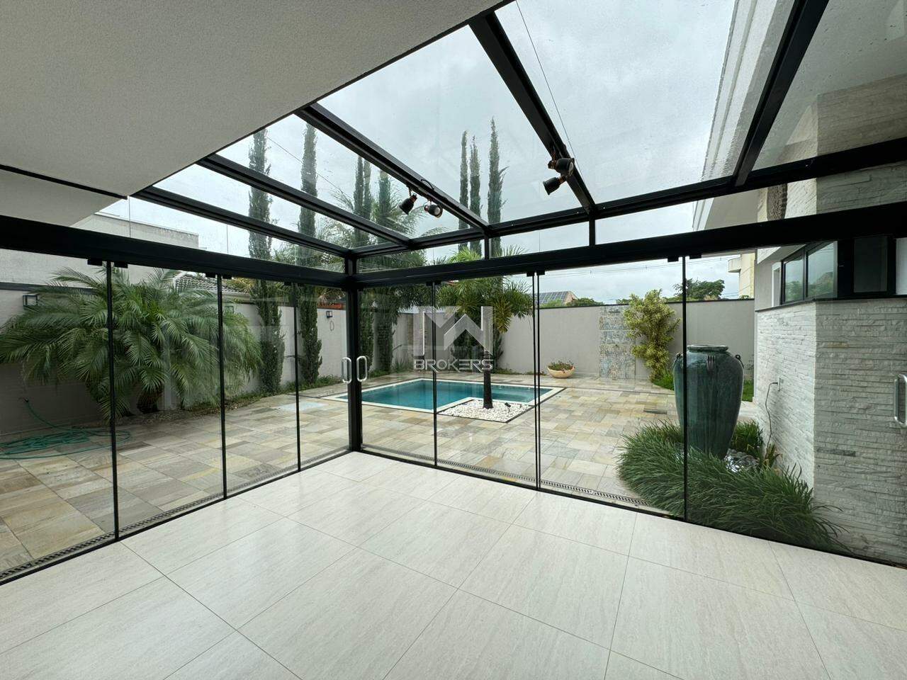 Sala dois ambientes com pé direito alto e lareira à gás, cozinha integrada à sala de refeições, lavabo, despensa, área de serviços, área gourmet com churrasqueira, forno de pizza e fechamento em vidro e quintal com piscina aquecida (solar).