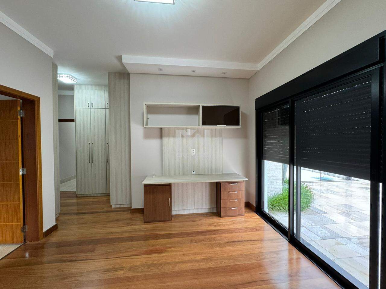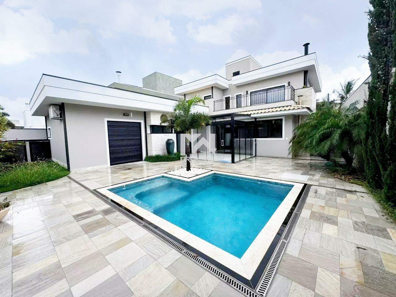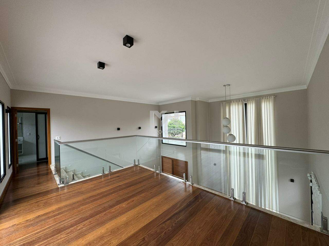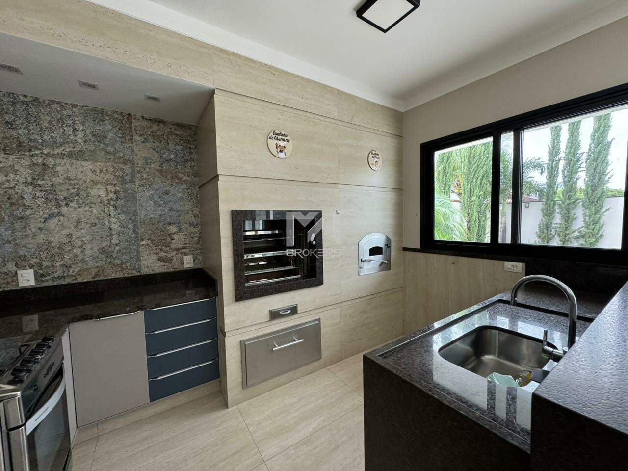 Sala dois ambientes com pé direito alto e lareira à gás, cozinha integrada à sala de refeições, lavabo, despensa, área de serviços, área gourmet com churrasqueira, forno de pizza e fechamento em vidro e quintal com piscina aquecida (solar).