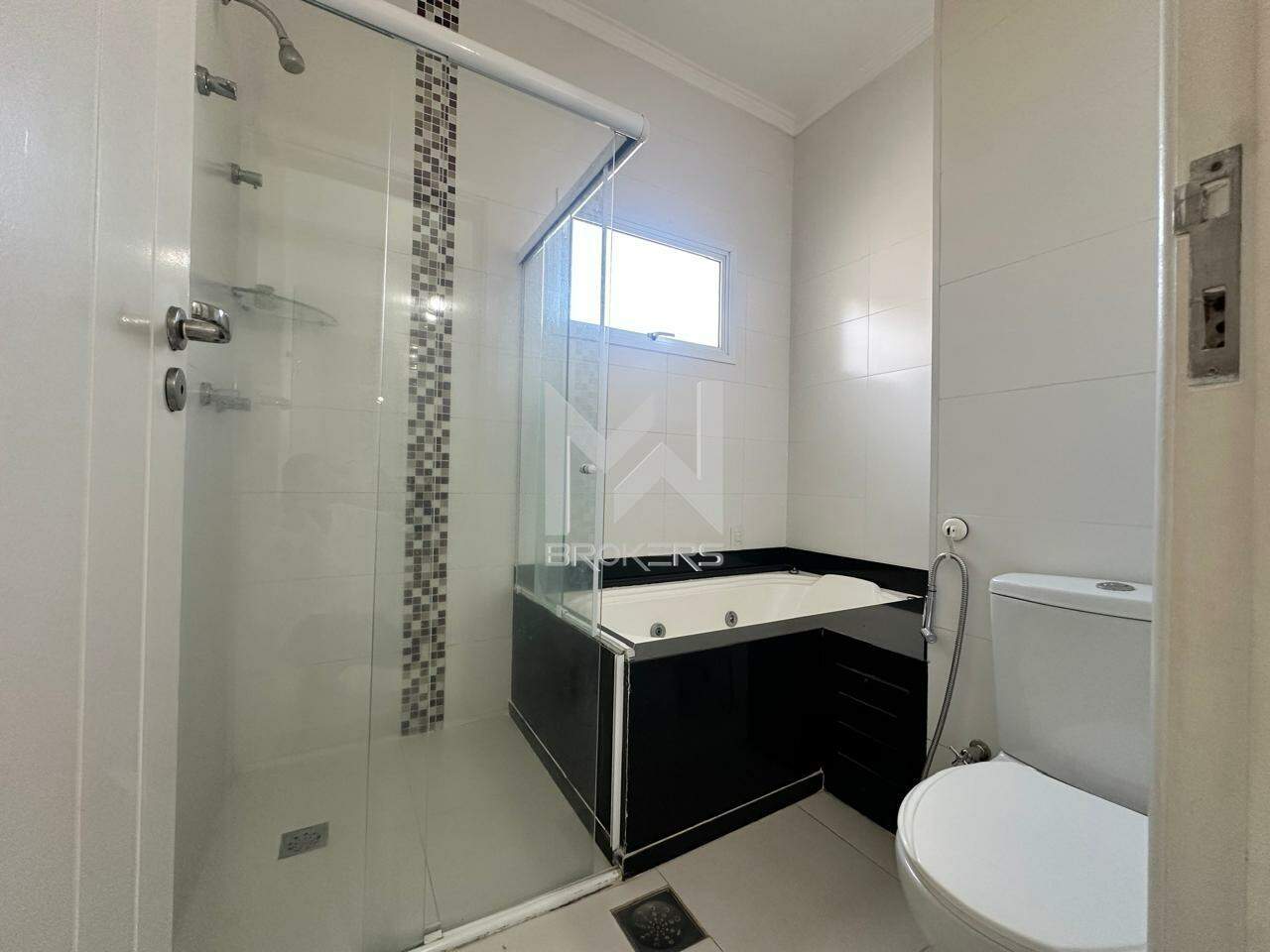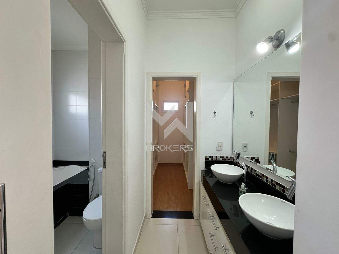 A suíte principal com closet e banheiro com banheira.