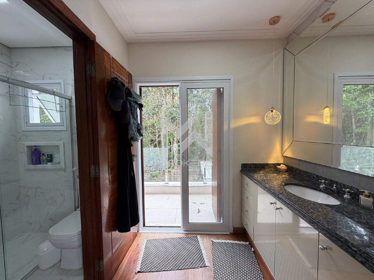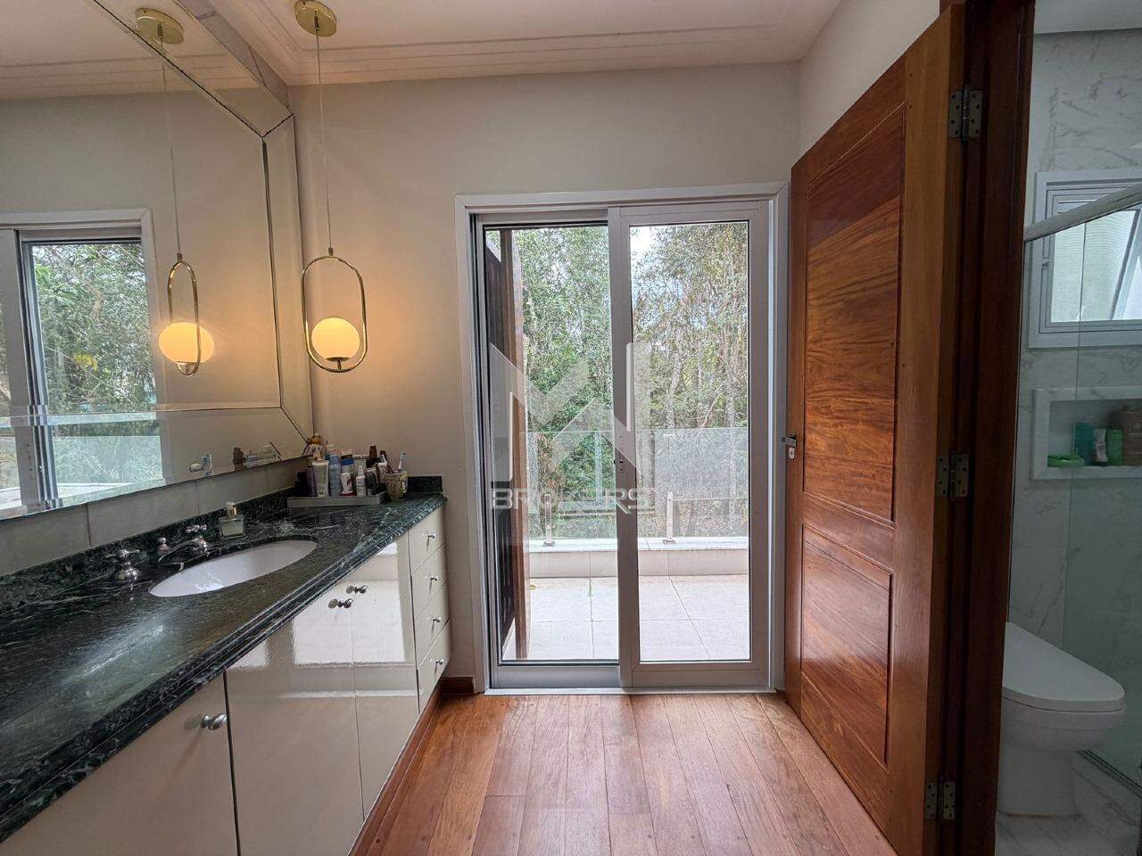 Hall de acesso, sala com pé direito alto para 03 ambientes: estar, sala de TV e sala de refeições, lavabo, cozinha integrada à área gourmet com vista para a mata de preservação permanente, piscina e sauna.