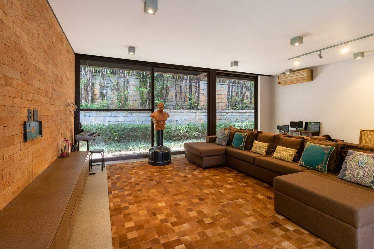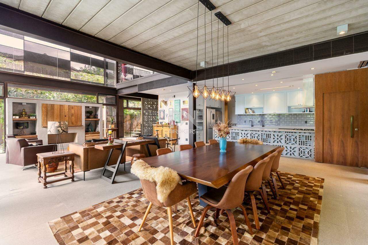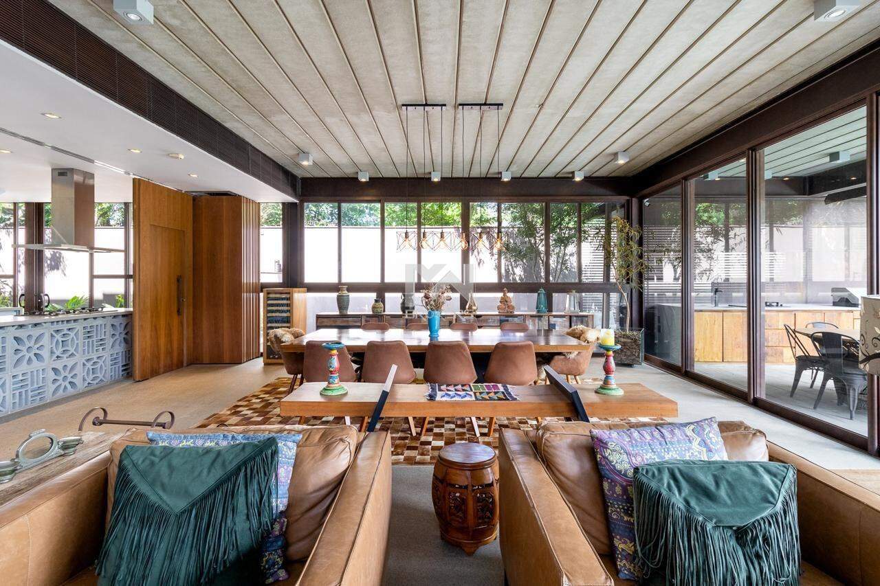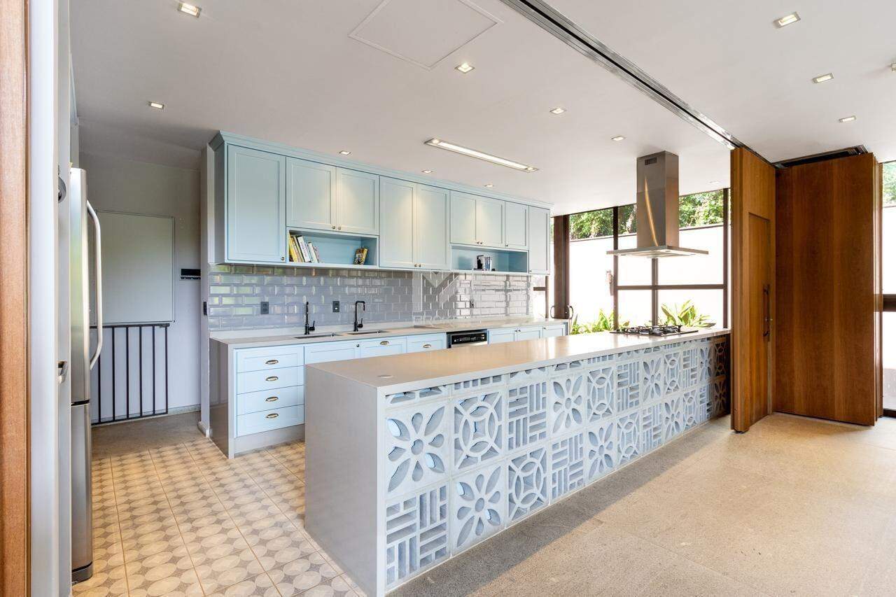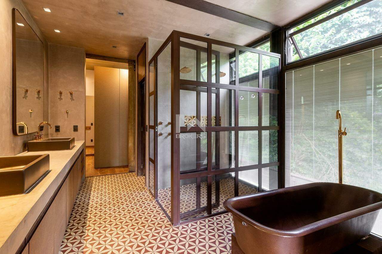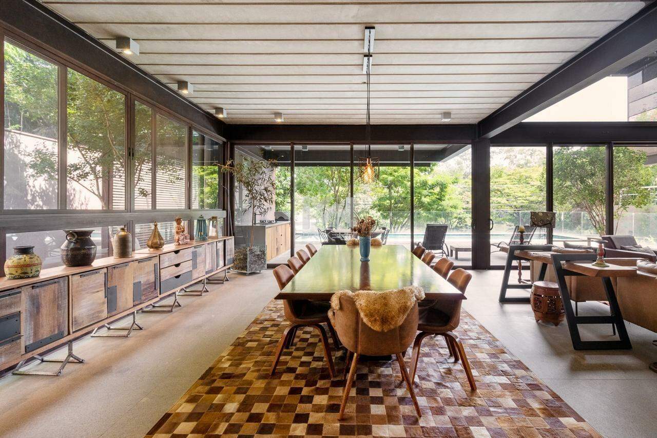 No térreo, dormitório de hóspedes, home theater, escritório, sala de TV, salas de estar e de refeições, cozinha com copa e despensa, área gourmet com churrasqueira, ofurô e piscina.