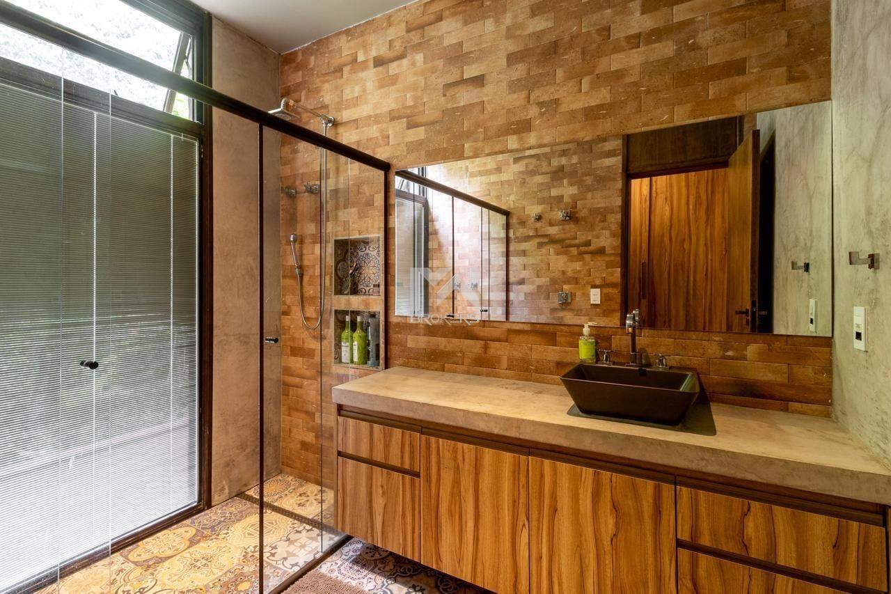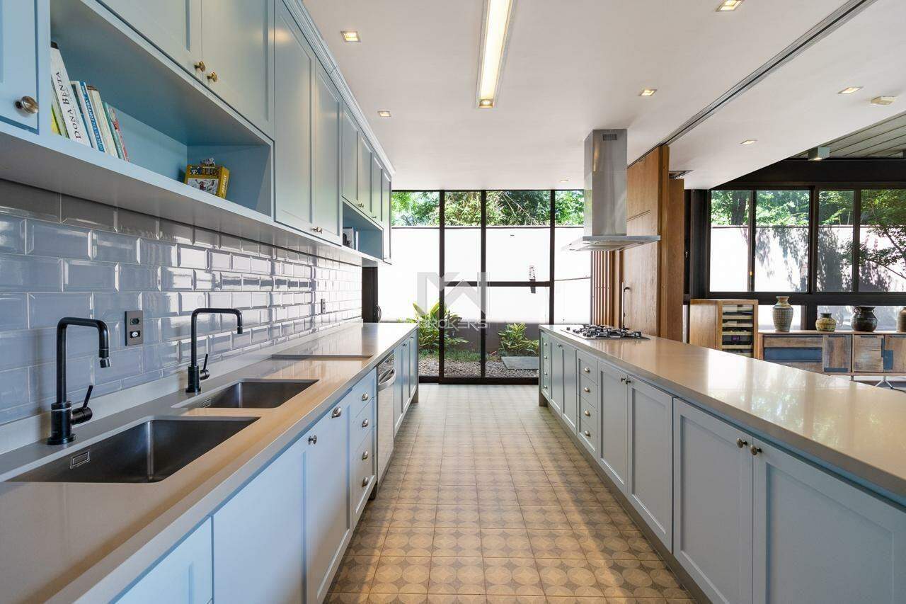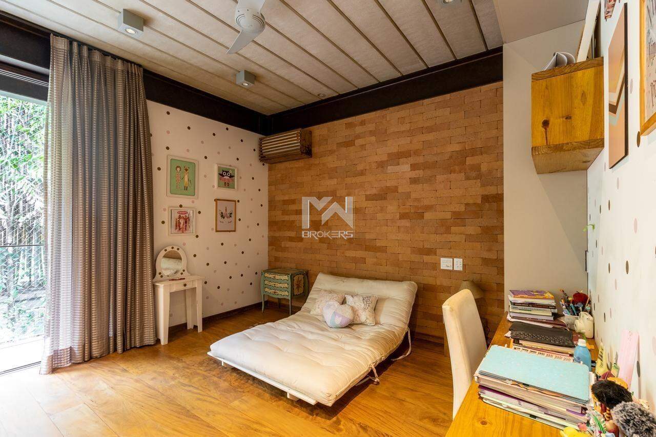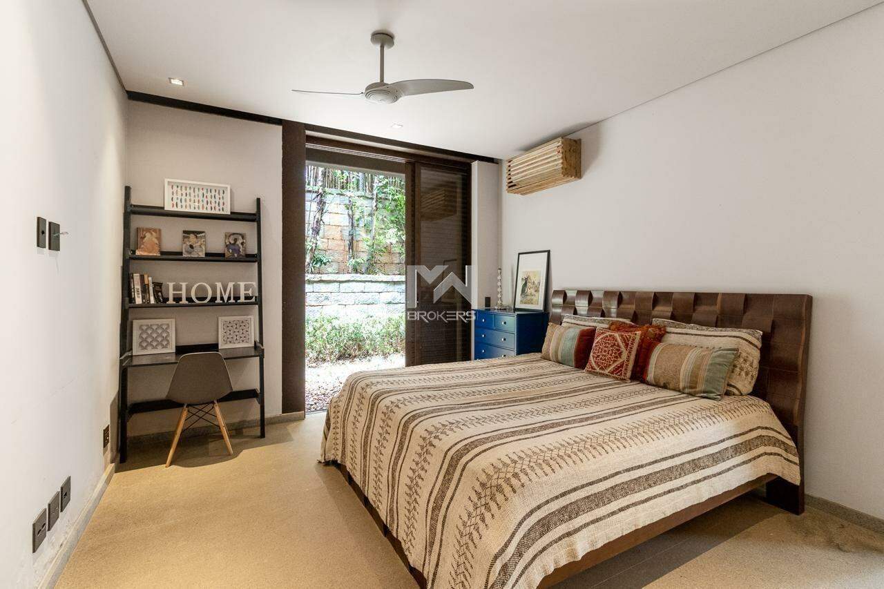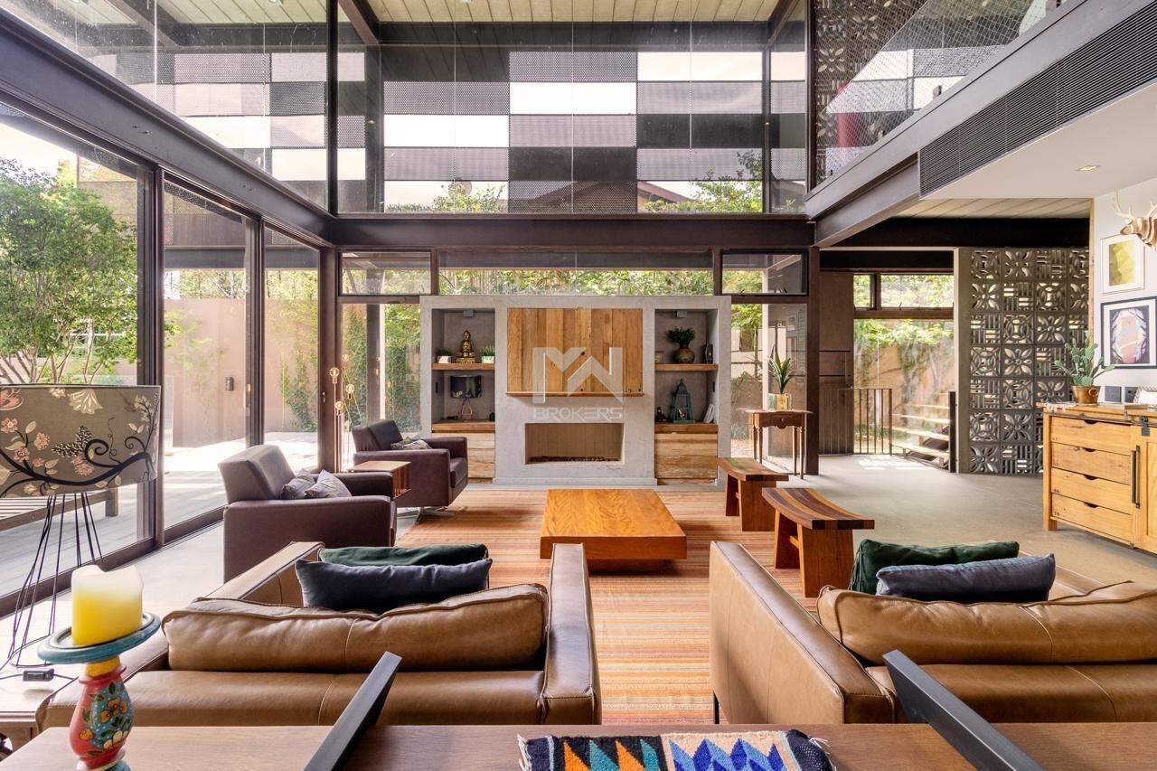 No térreo, dormitório de hóspedes, home theater, escritório, sala de TV, salas de estar e de refeições, cozinha com copa e despensa, área gourmet com churrasqueira, ofurô e piscina.