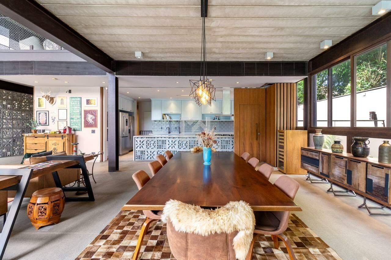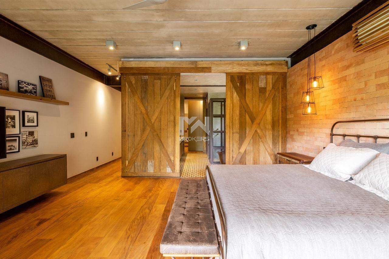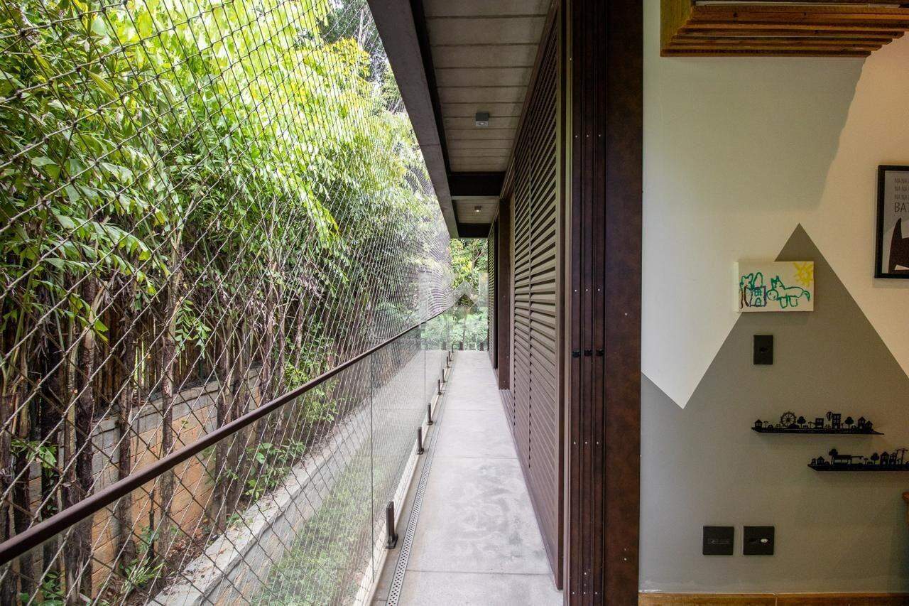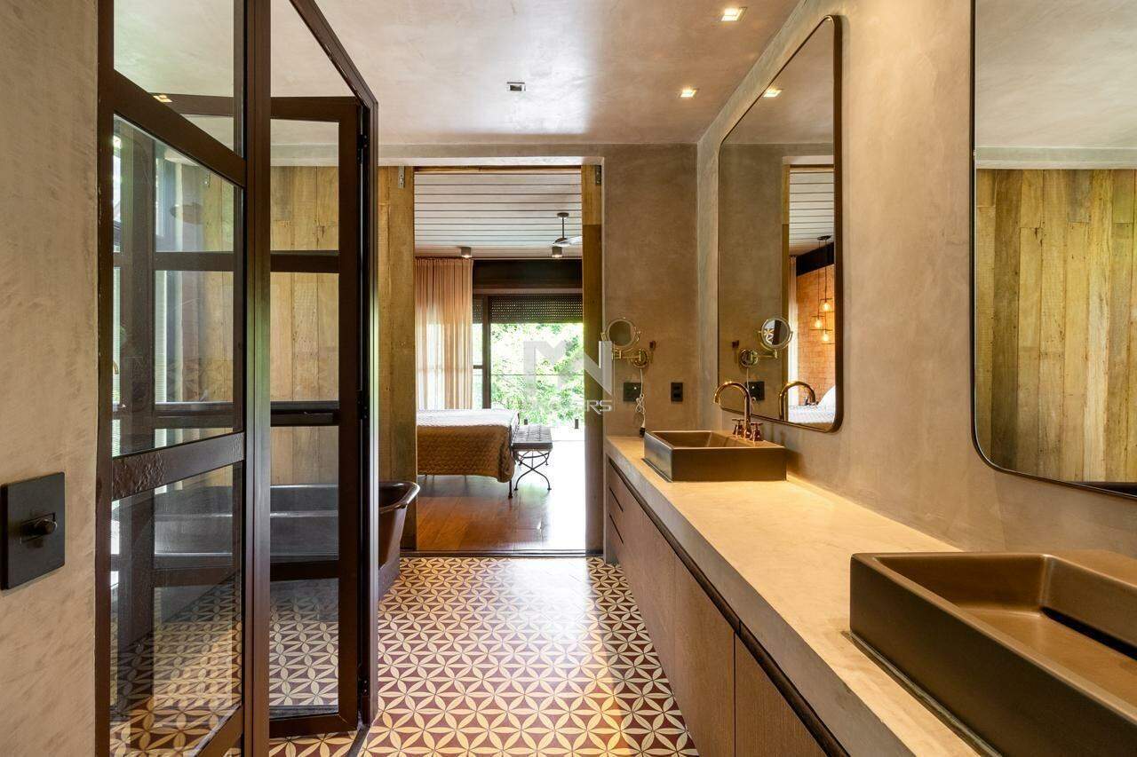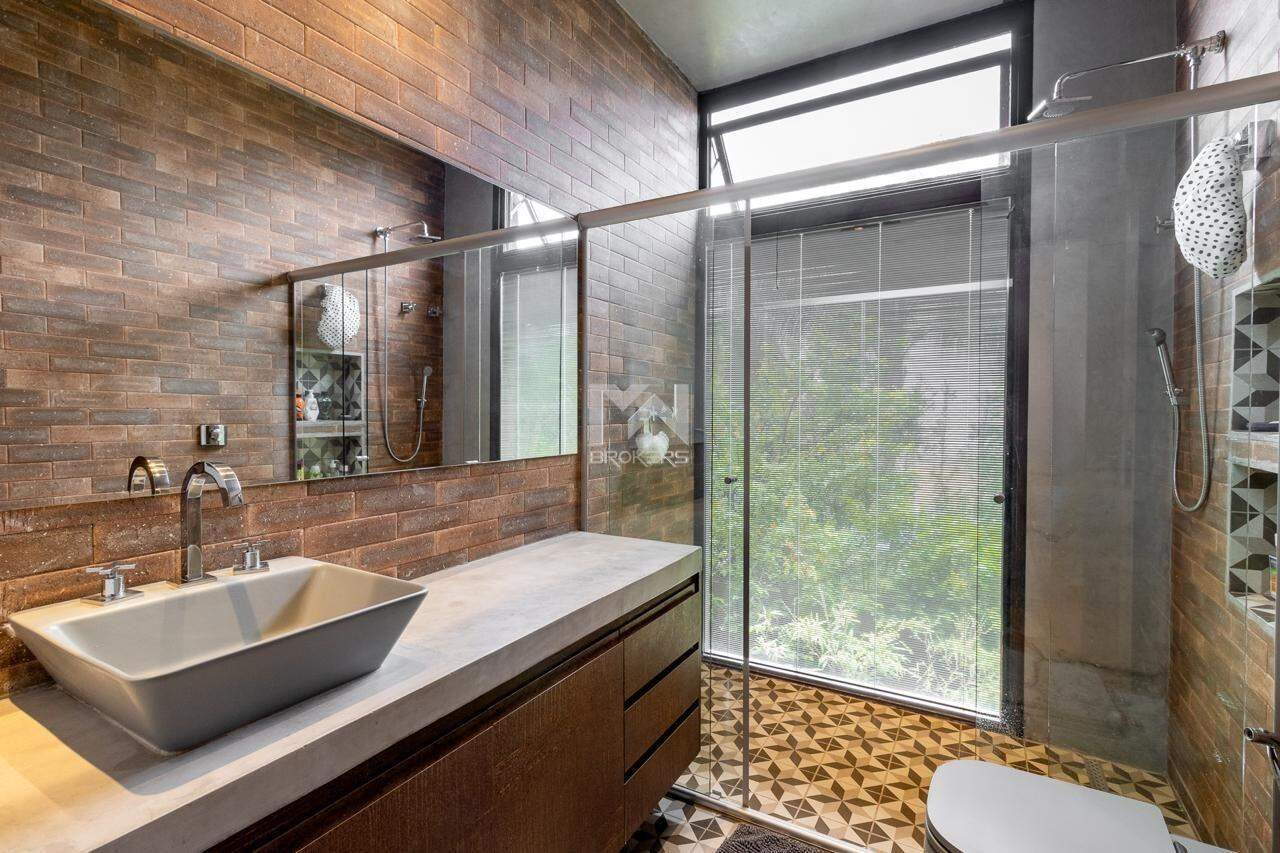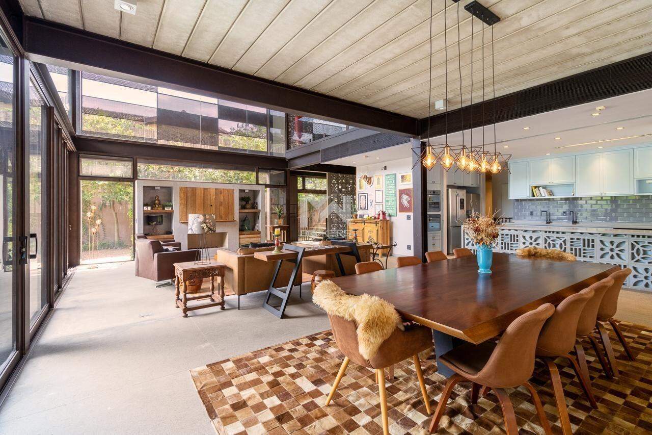 No térreo, dormitório de hóspedes, home theater, escritório, sala de TV, salas de estar e de refeições, cozinha com copa e despensa, área gourmet com churrasqueira, ofurô e piscina.
