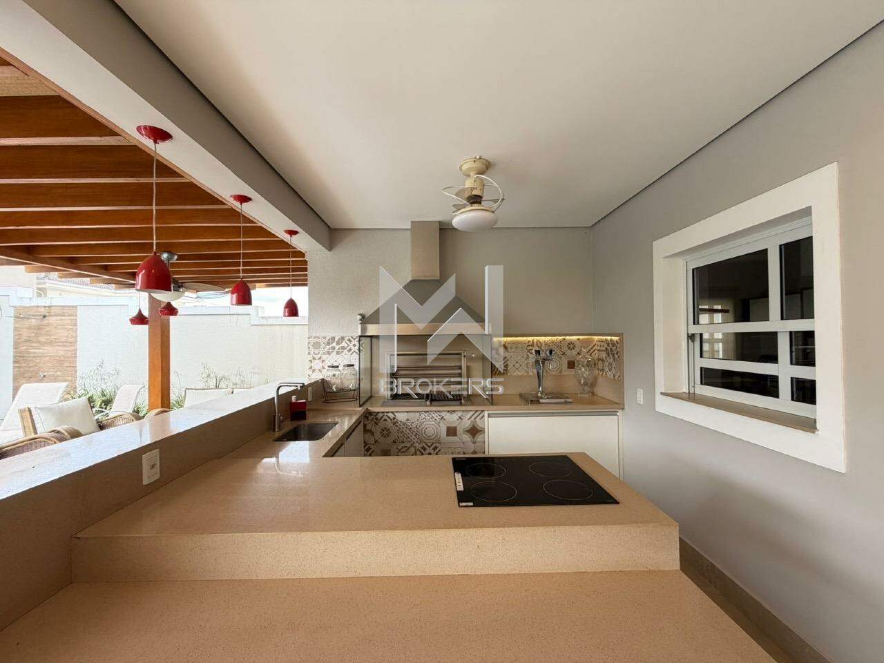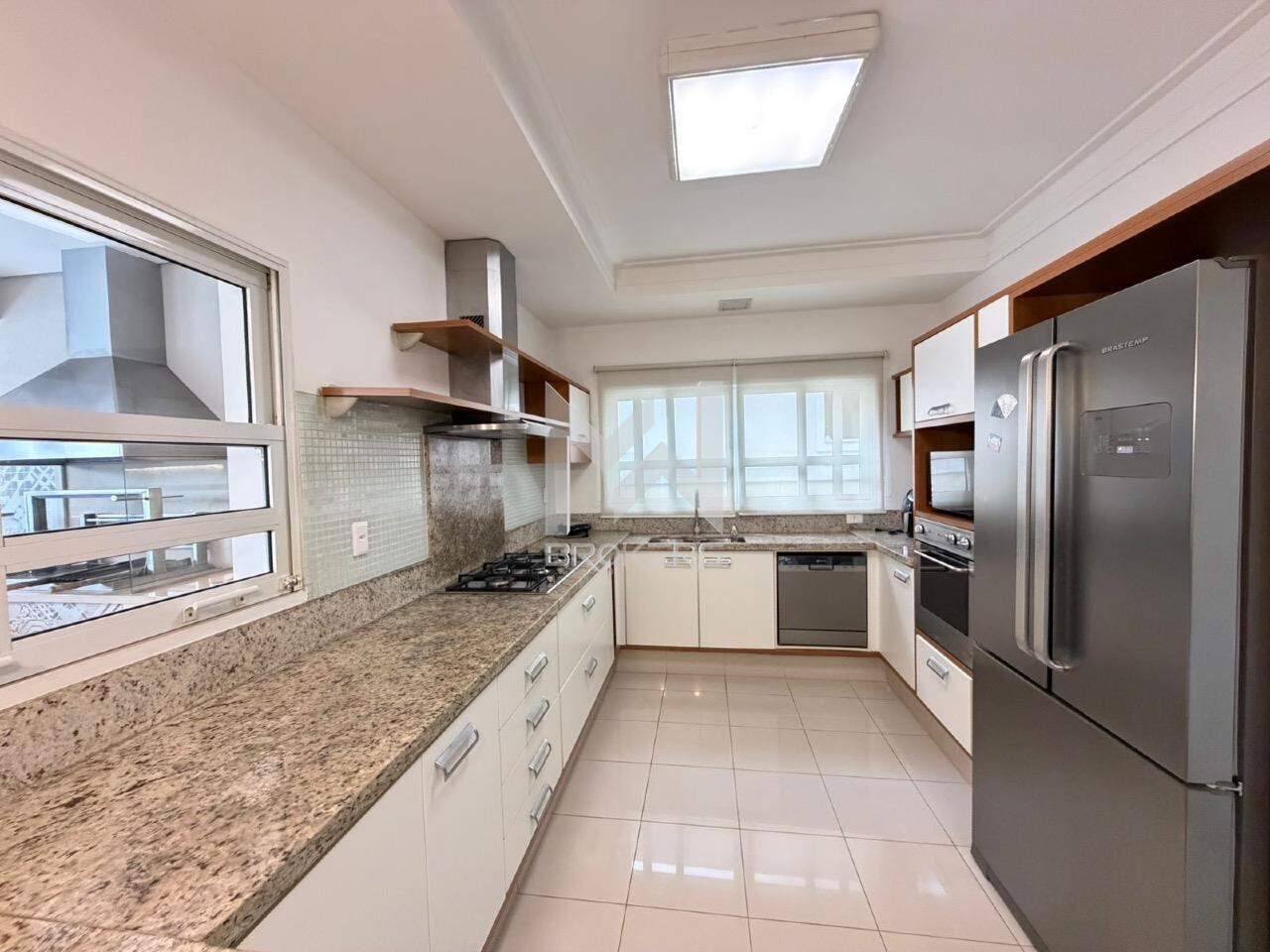 Cozinha completa com Geladeira Frost Free Side Inverse, cooktop 5 bocas a gás com exaustor, lava louça 8 serviços, torre com forno a gás e microondas, e água quente na pia.