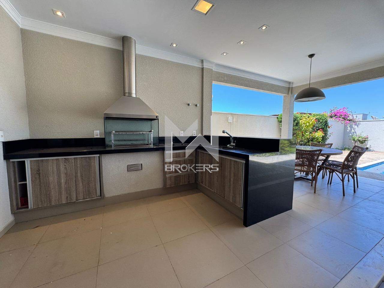 Área gourmet integrada à cozinha e quintal com piscina aquecida e gramado.