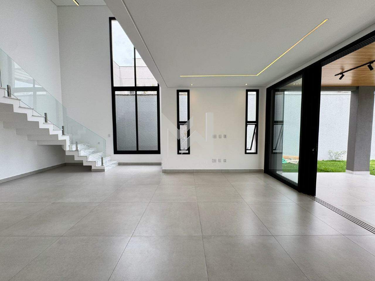 Salas com pé direito duplo para 03 ambientes: estar, TV e refeições, cozinha integrada, banheiro social, dormitório no térreo reversível para escritório, área gourmet com churrasqueira, quintal gramado, piscina e banheiro de apoio.