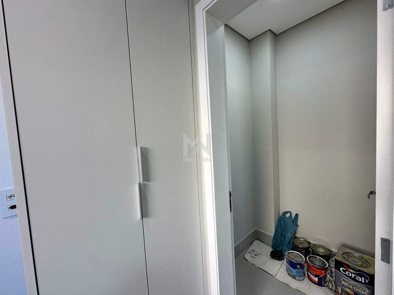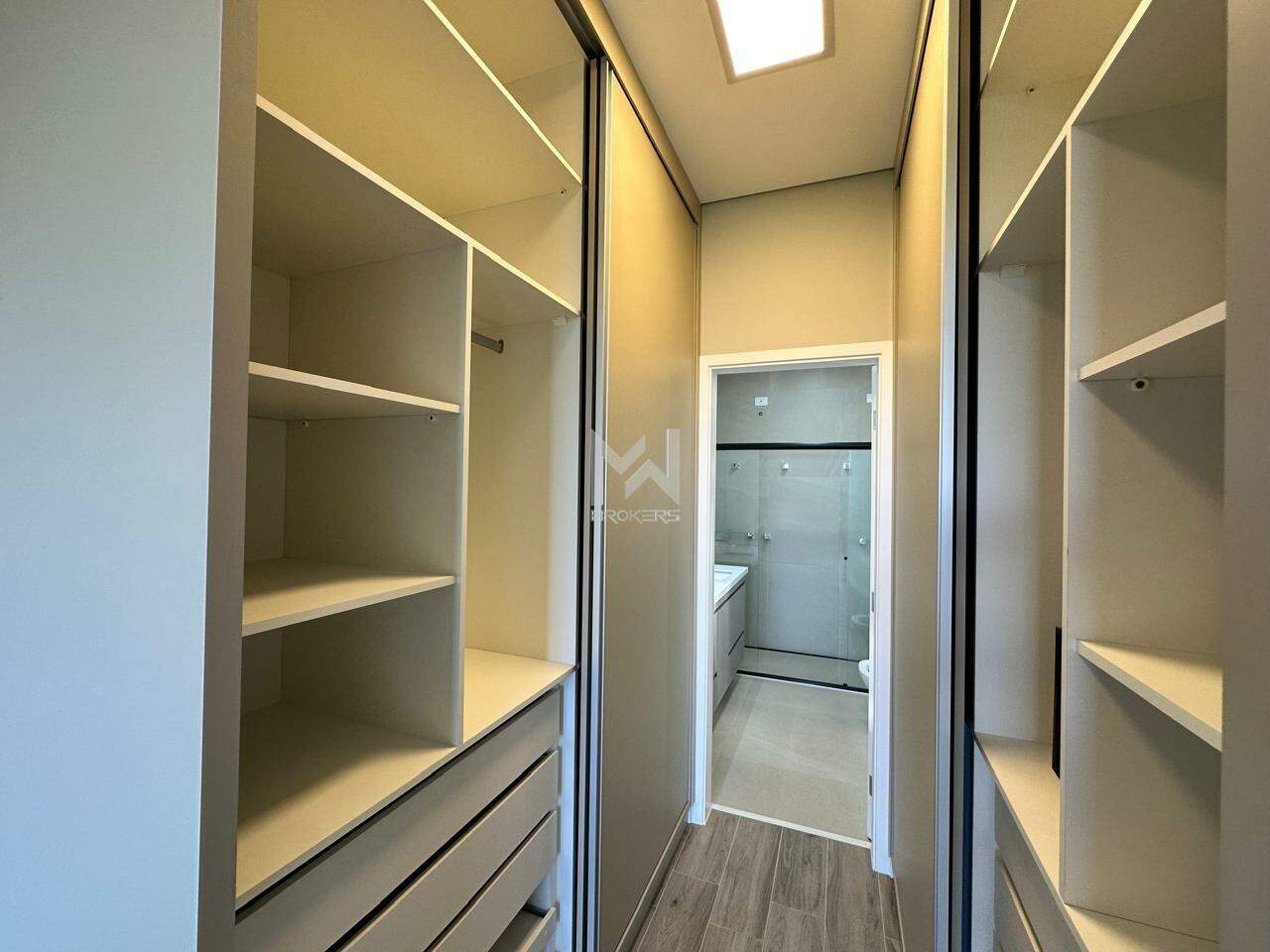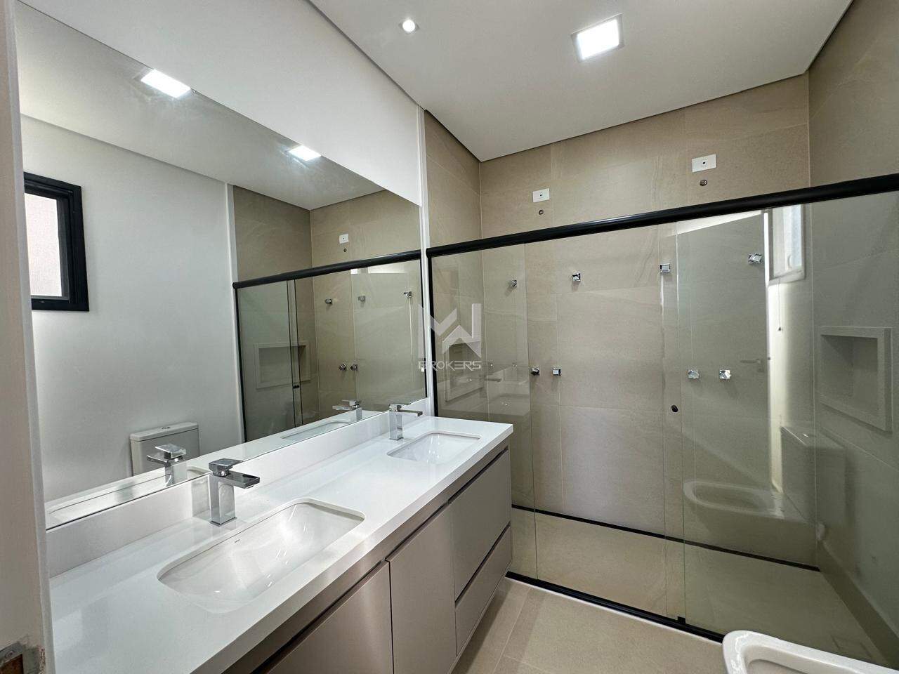 A suíte principal possui varanda, closet com armário planejado e no banheiro cubas e chuveiros duplos, com armário planejado e box em vidro.